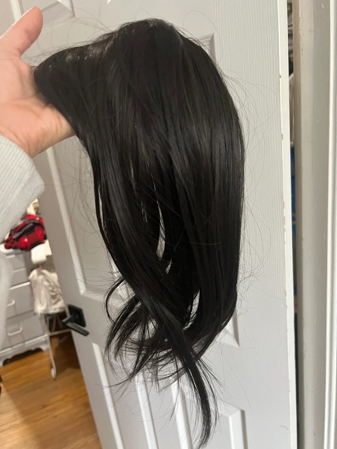 Selling a black hair topper. Medium length- 14” long. Perfect to add a volume to your existing hair. No need to put a hair cap. Just clip it on top of your hair.