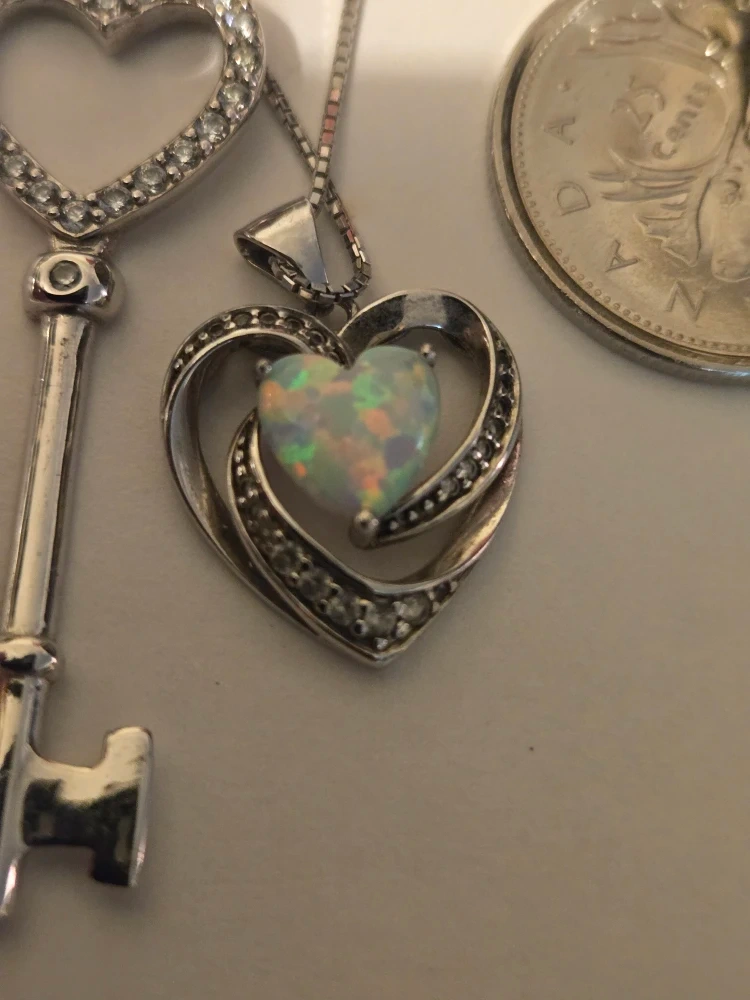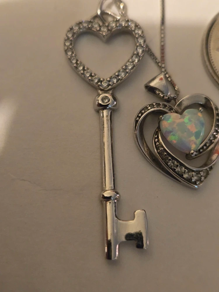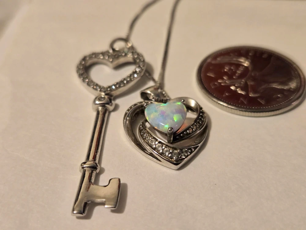 Selling a couple of cute silver pendants. One is a heart with an opal stone, and the other is a key with a heart-shaped top. They're both in great condition and would make a lovely addition to any jewelry collection!