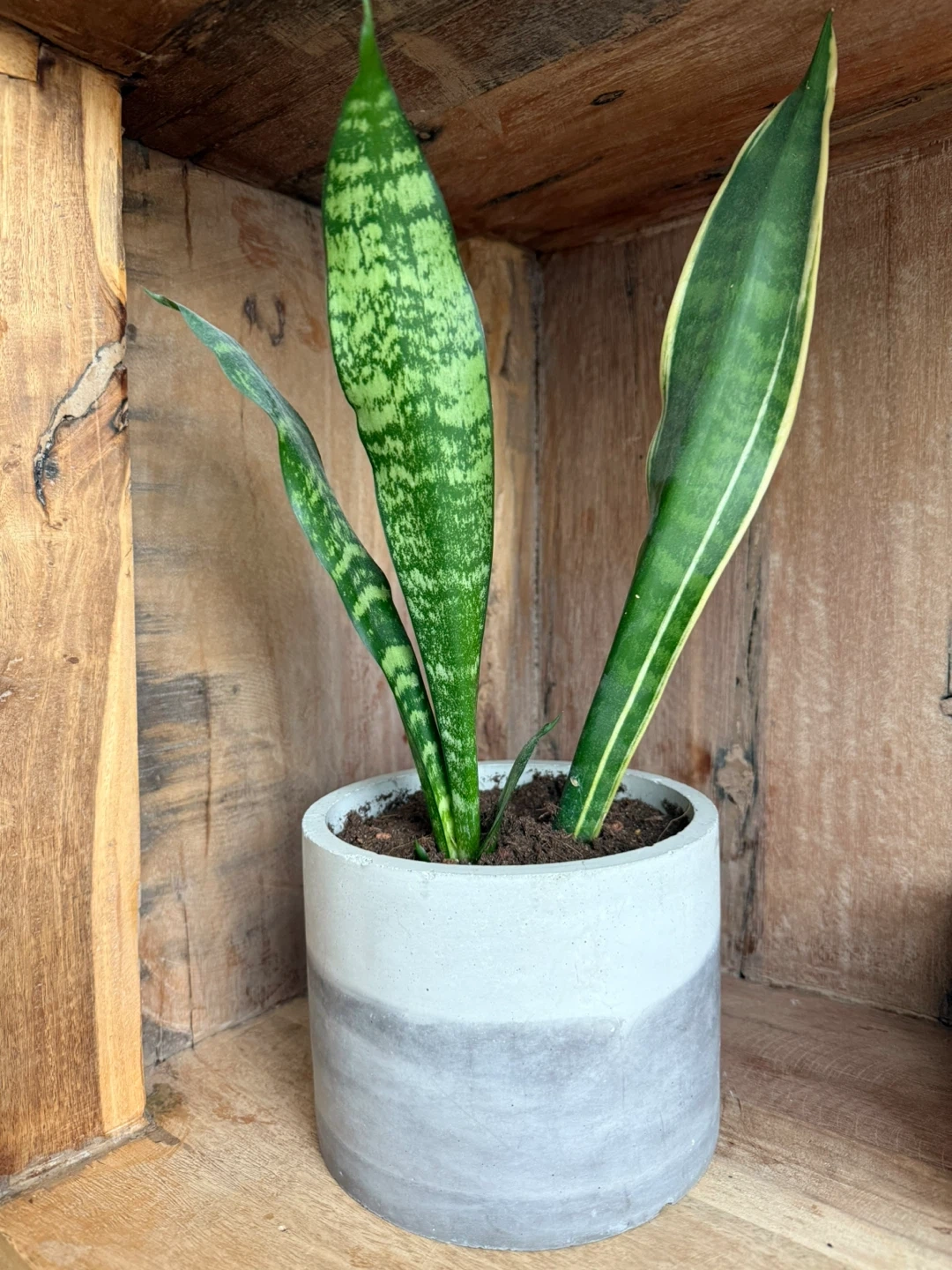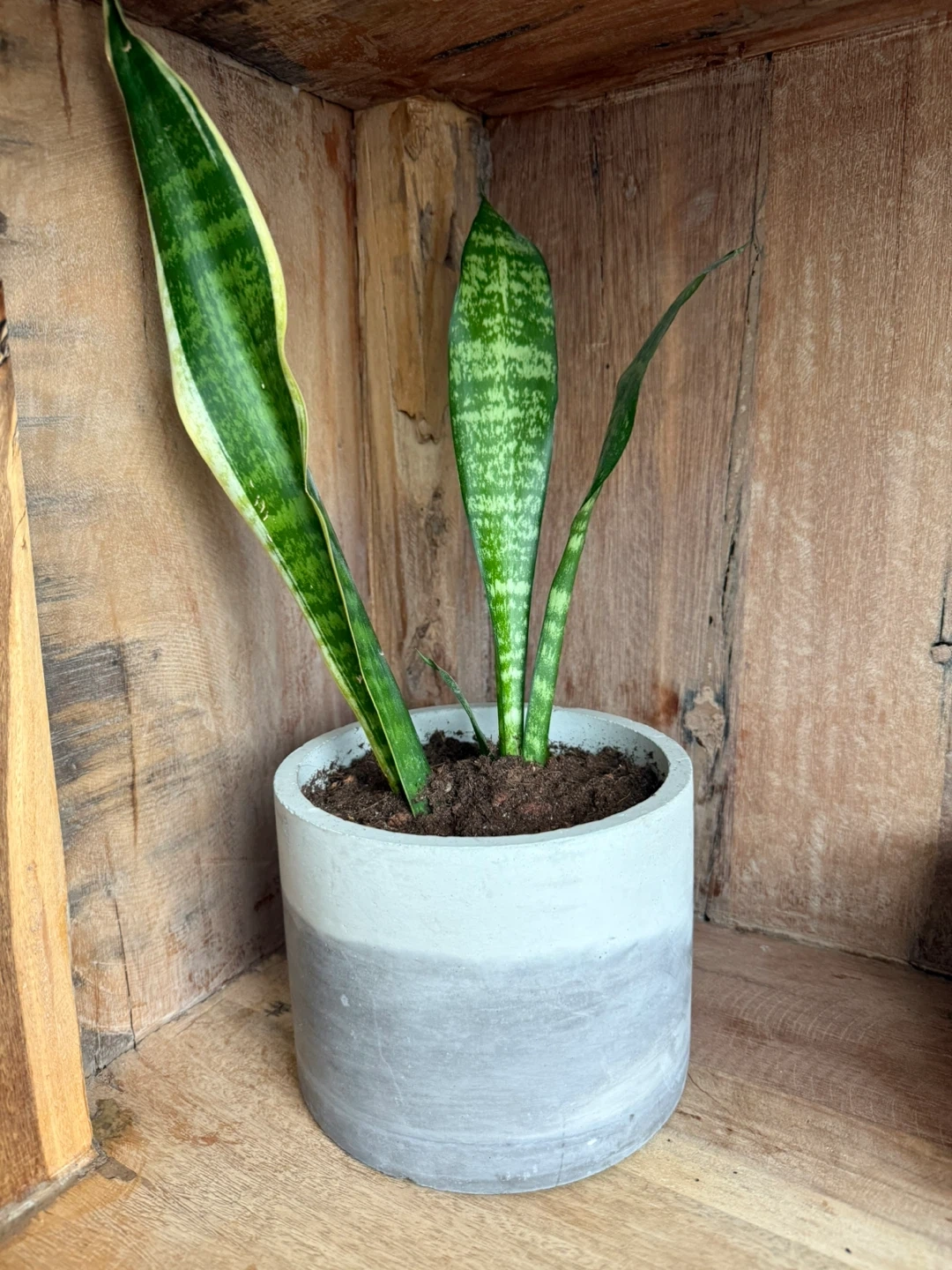 A snake plant in a two toned concrete pot (with drainage hole). Plant is easy to maintain.