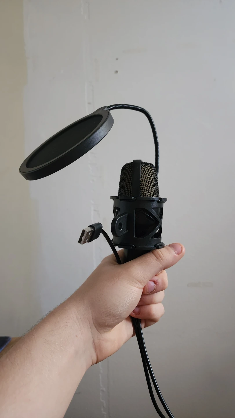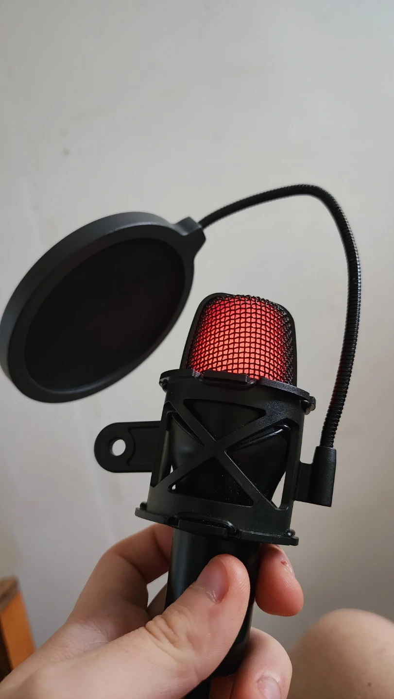 Selling a microphone with a removable pop filter. It's in good working condition and perfect for recording or streaming. The microphone is black and comes with a pop filter attached.