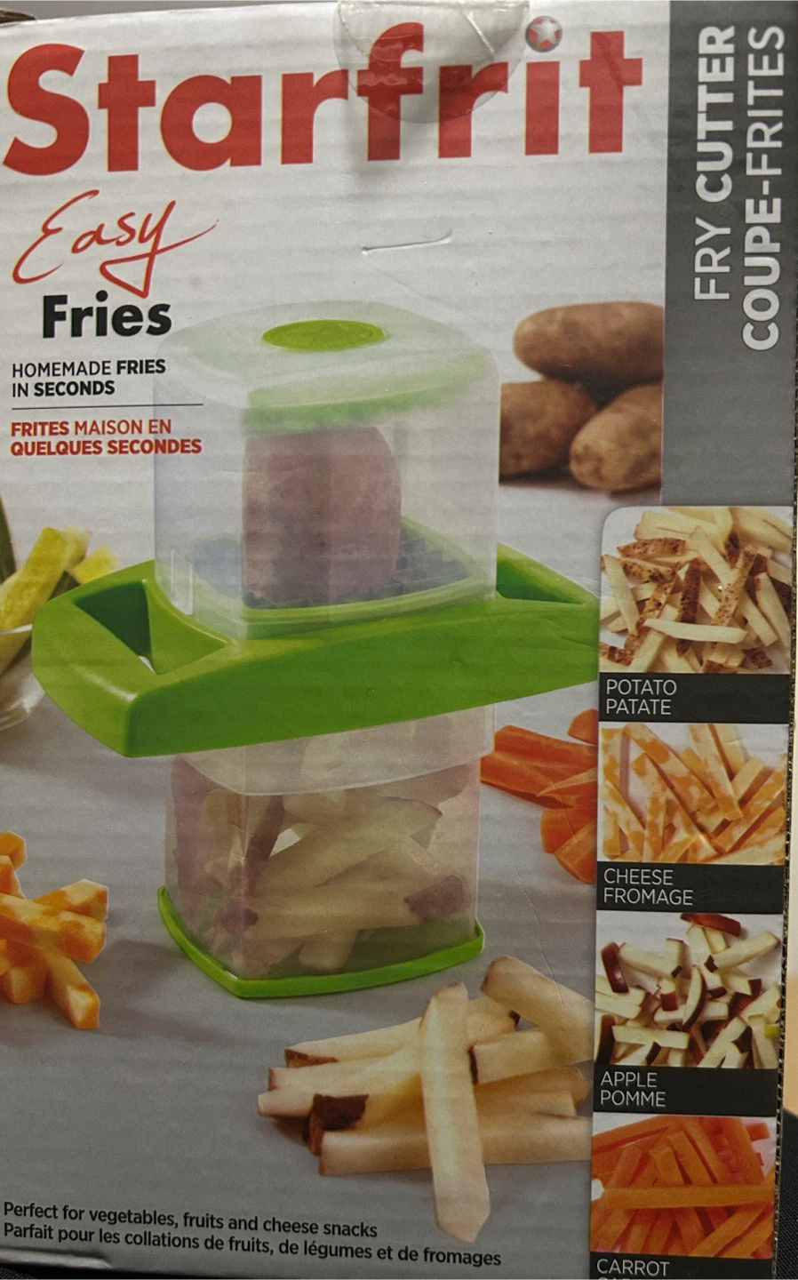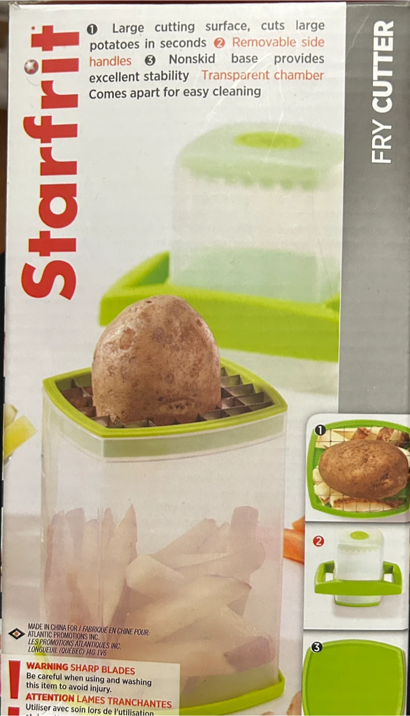 brand new Starfrit Easy Fry Cutter still in its box! It features a large cutting surface and removable side handles. The non-skid base provides excellent stability, and it comes apart for easy cleaning. Perfect for making homemade fries in seconds!