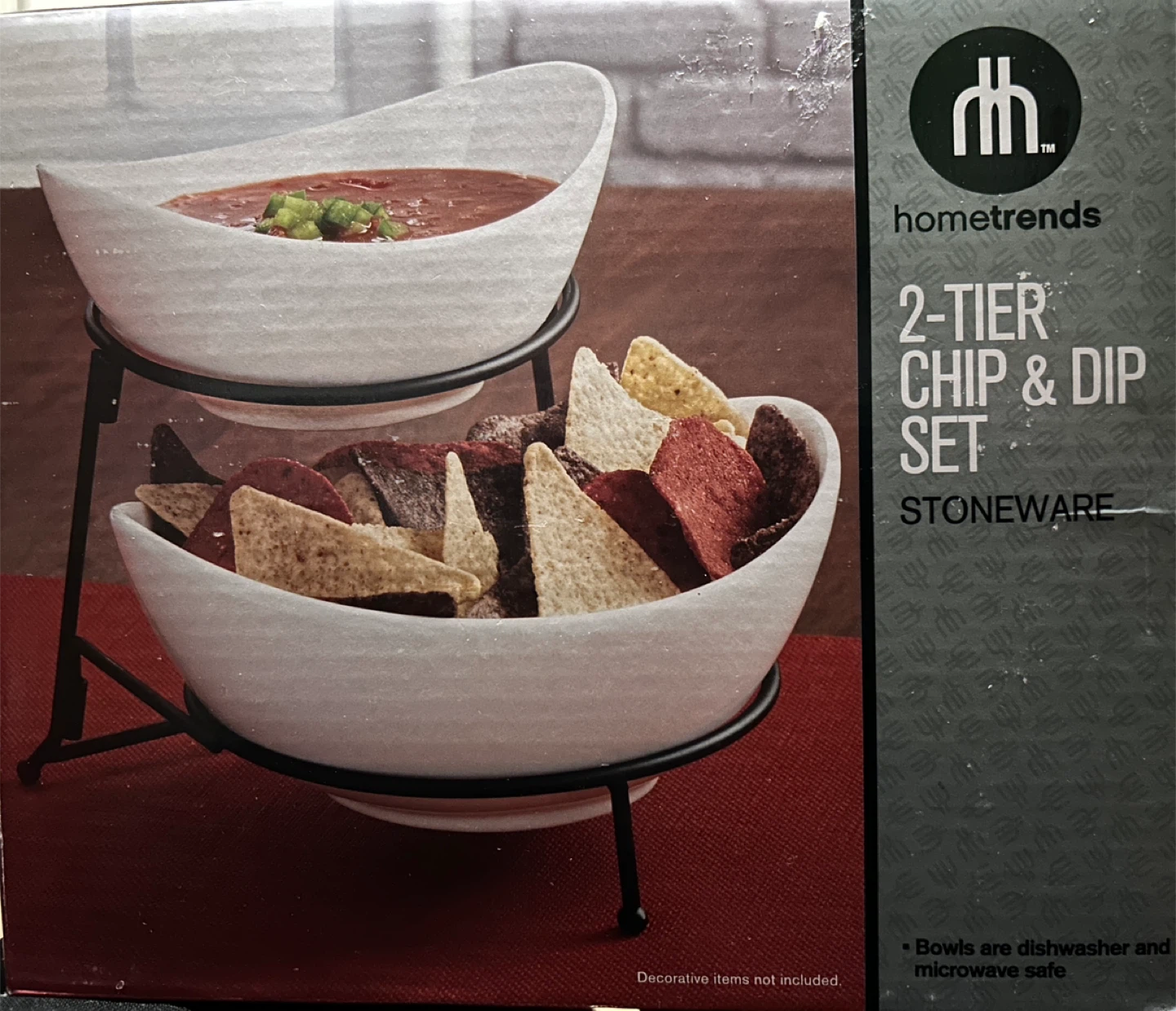 Brand new hometrends 2-Tier Chip & Dip Set! This stoneware set is perfect for your next gathering. The bowls are dishwasher and microwave safe, making cleanup a breeze. Comes in original box/packaging. Great for gifts