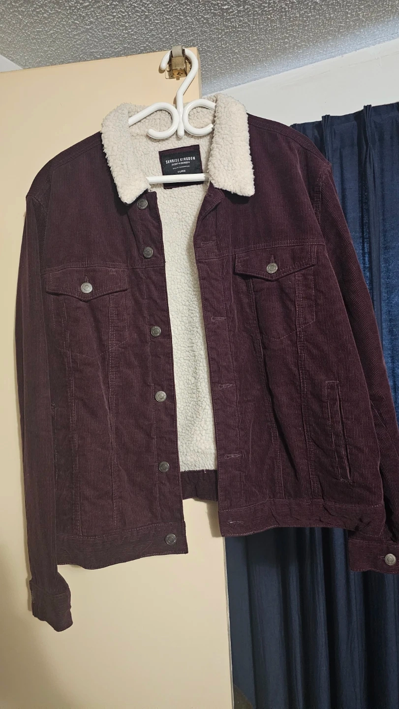 Selling a Sunrise Kingdom corduroy jacket with a sherpa lining. It's in great condition and is a size XL. The outer material is a soft corduroy, and the inner lining is a cozy sherpa material, perfect for cooler weather