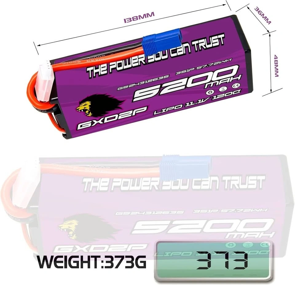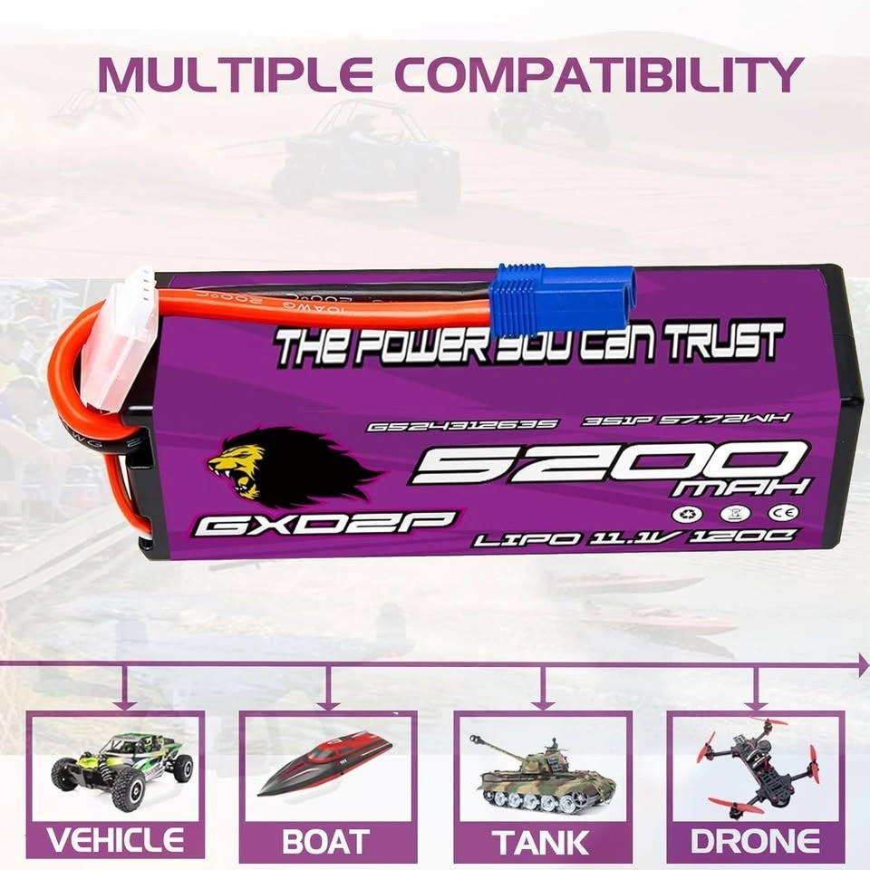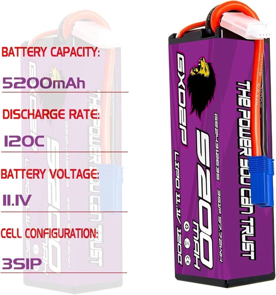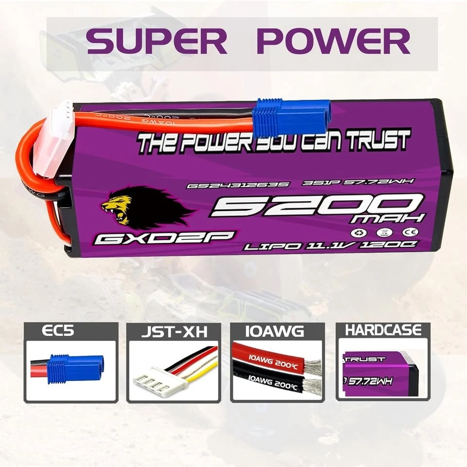 Supercharge your RC adventures with our high-performance 3S LIPO BATTERY, designed for 1/10 and 1/8 scale models. Experience unparalleled power with 11.1V and 5200mAh capacity!