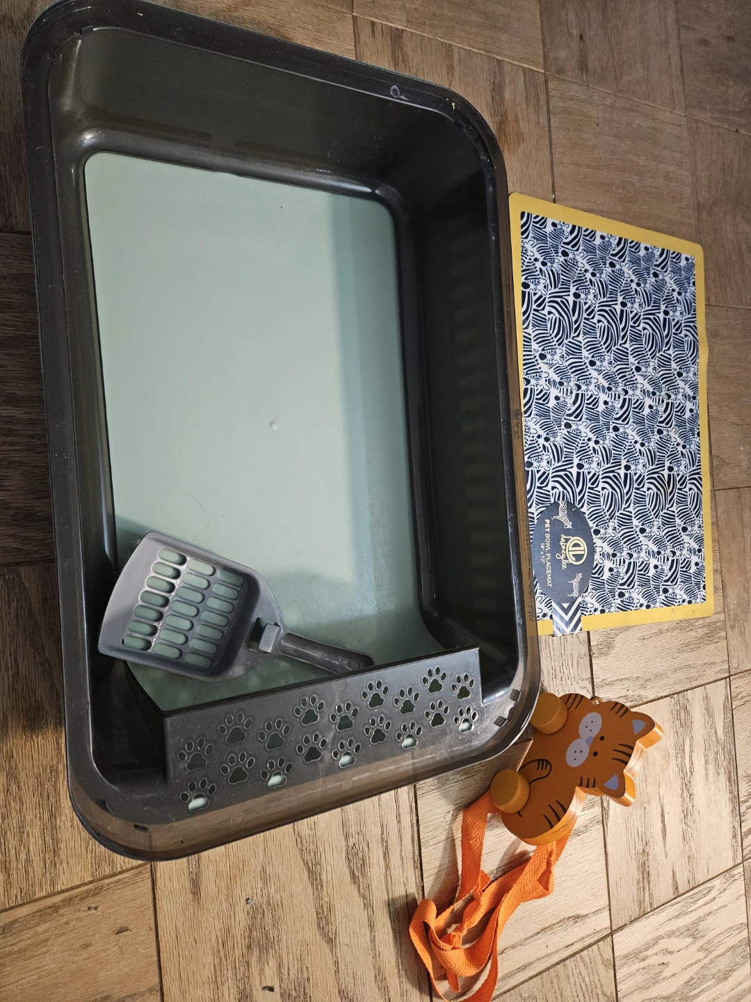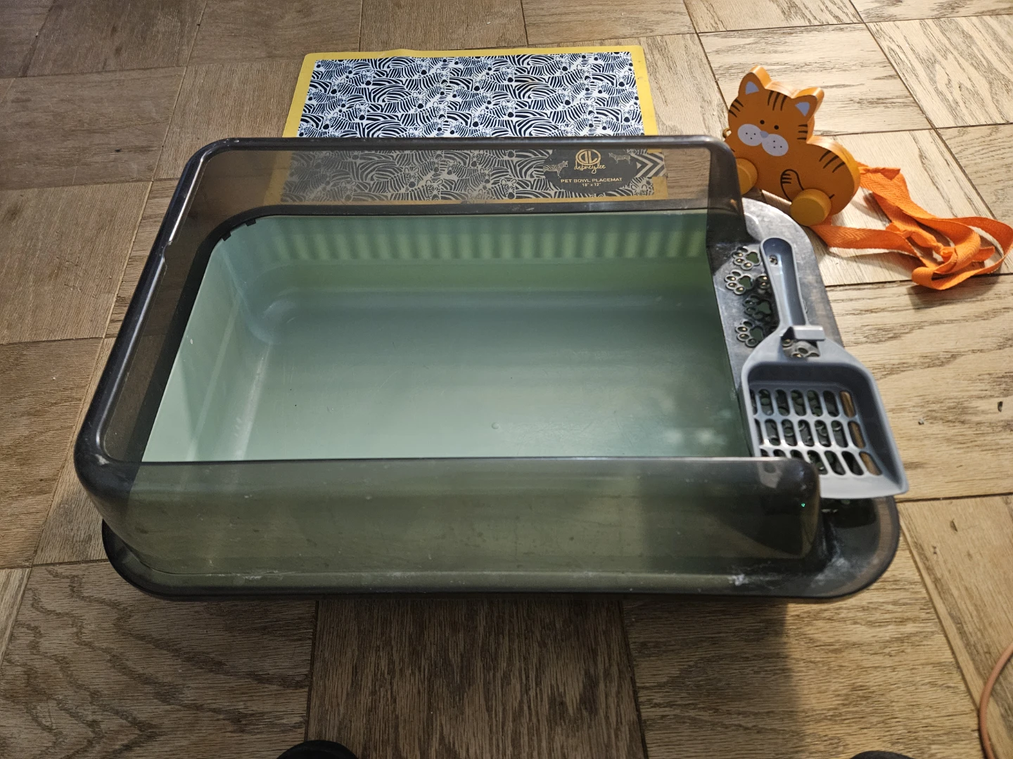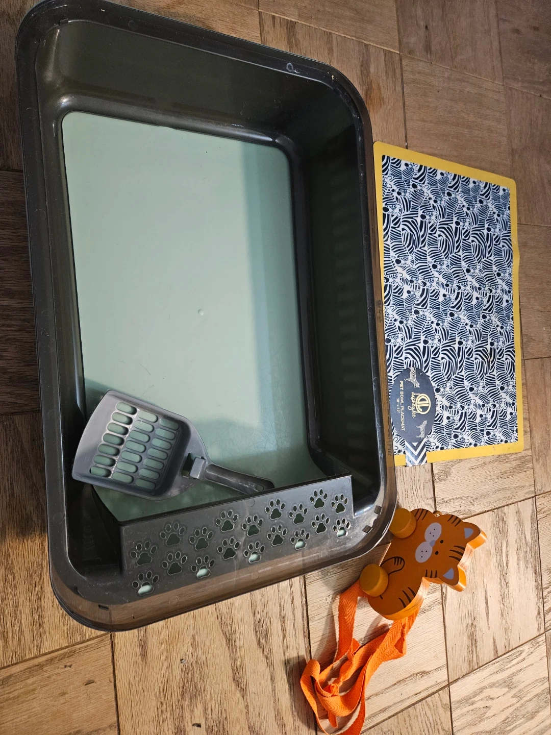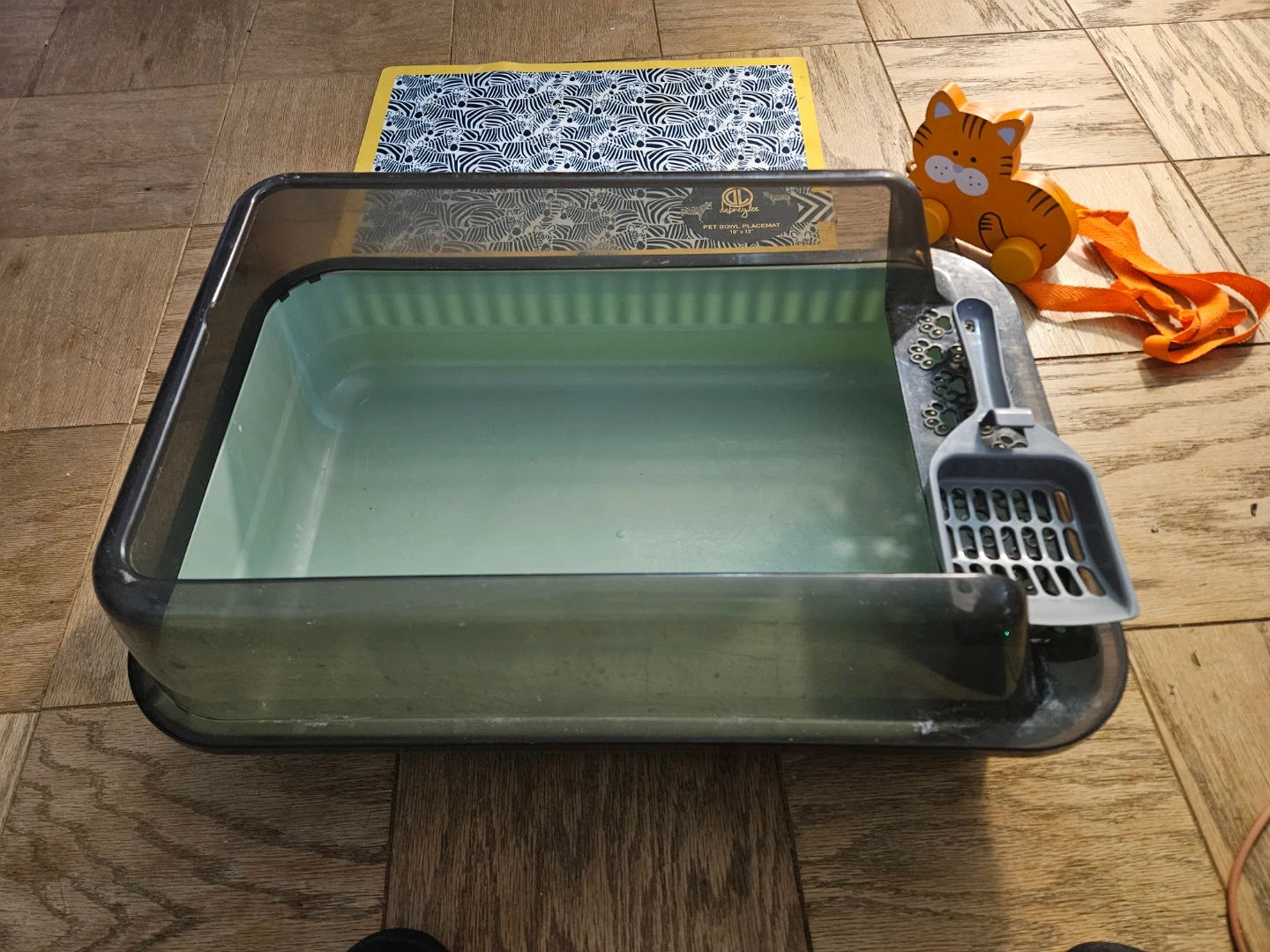 Selling a Pet Zone plastic litter box that's in great shape! It comes with a scoop and a paw-print decorated filter box. The box is a dark gray color with a light green interior. Perfect for keeping your kitty happy and your home clean!