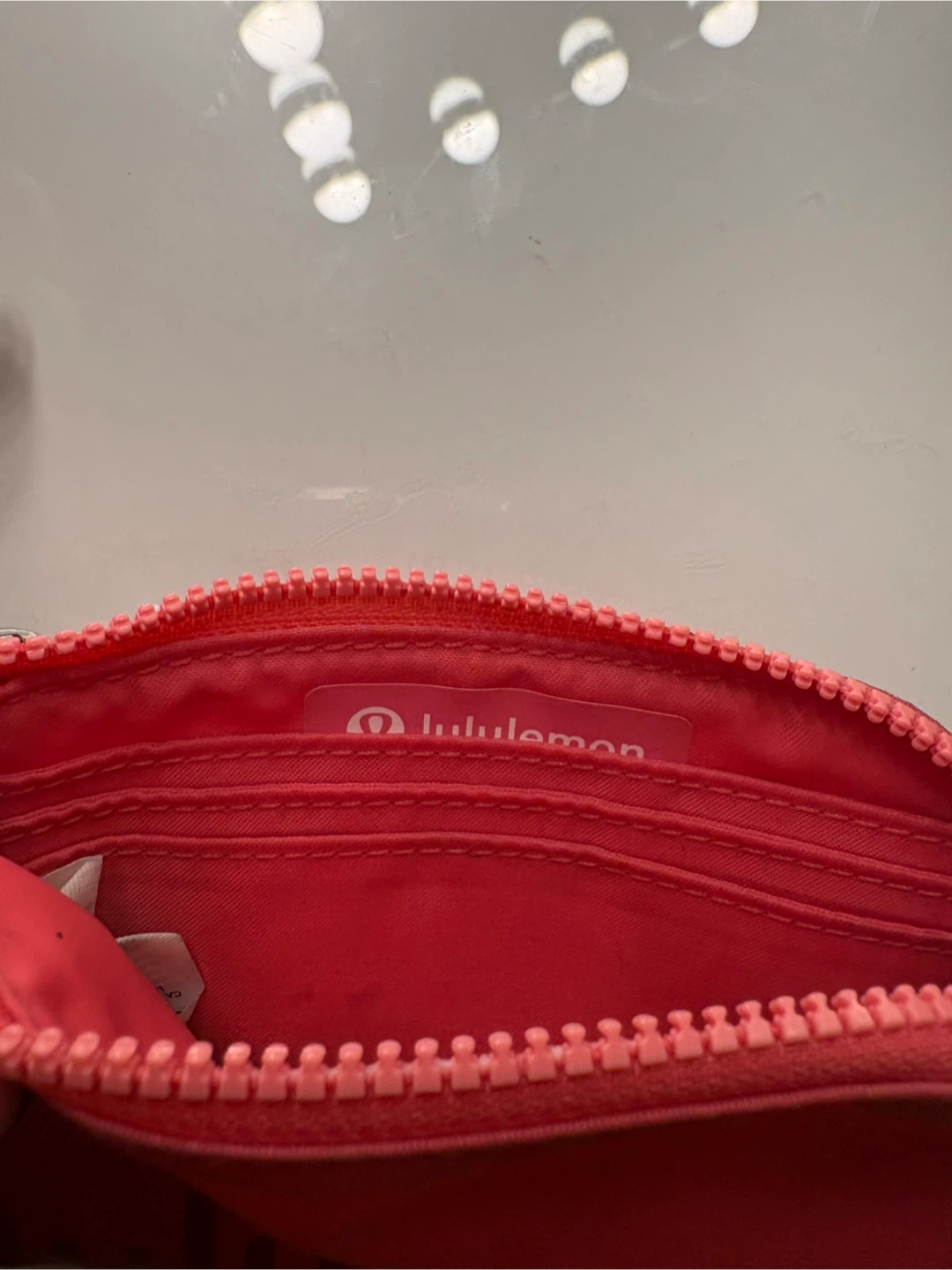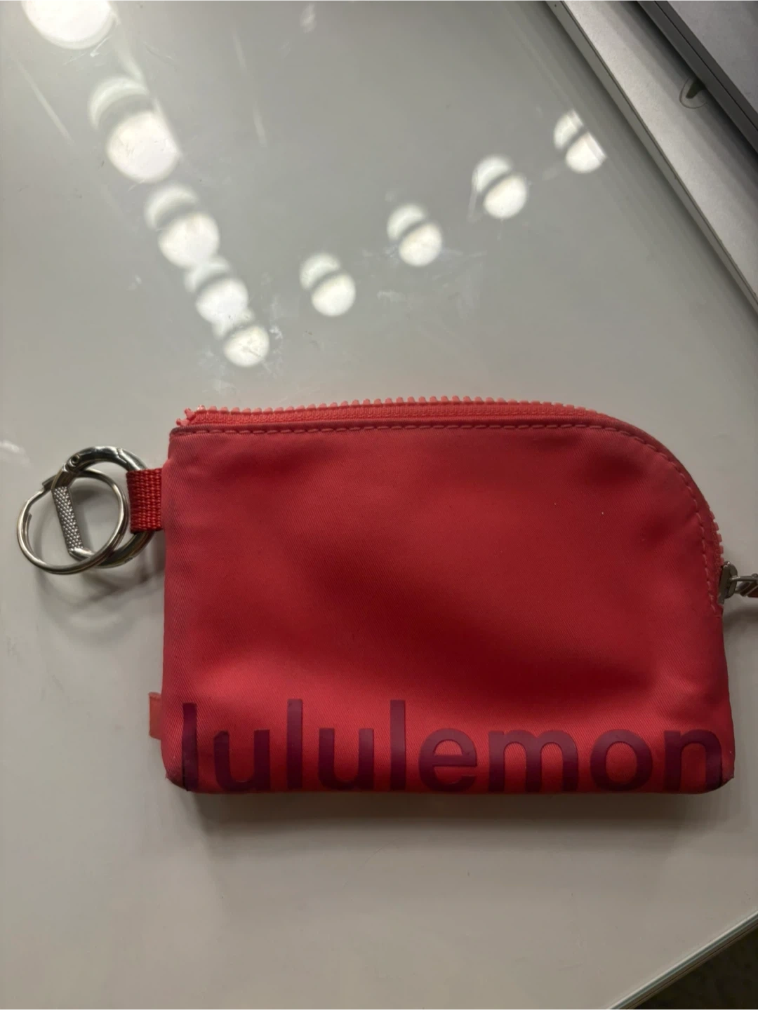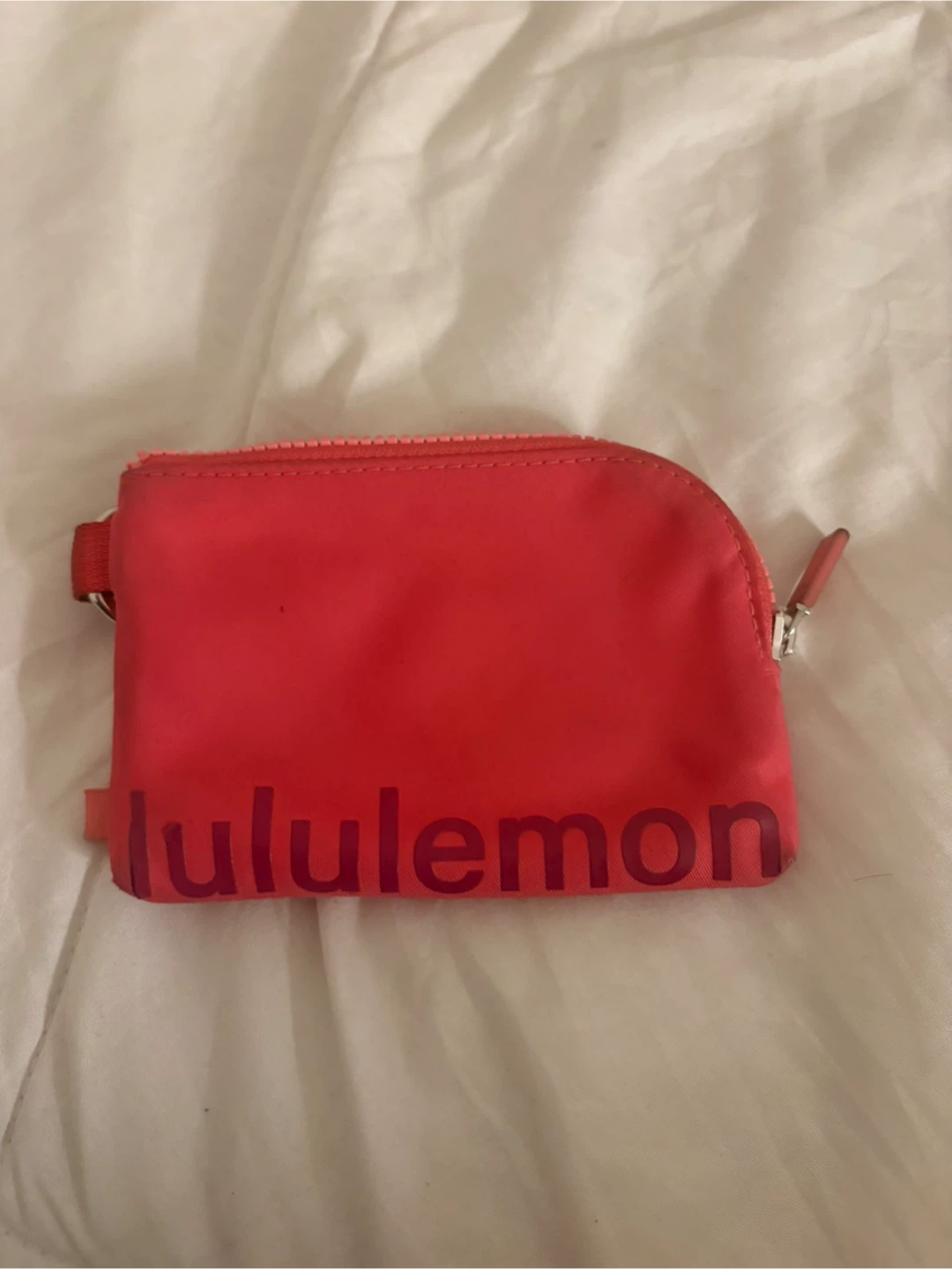 Check out this cute Lululemon mini pouch! It's a vibrant pink colour and perfect for carrying small essentials like cards, cash, or keys. It features the Lululemon logo subtly printed on the front and inside. Great for on the go!
