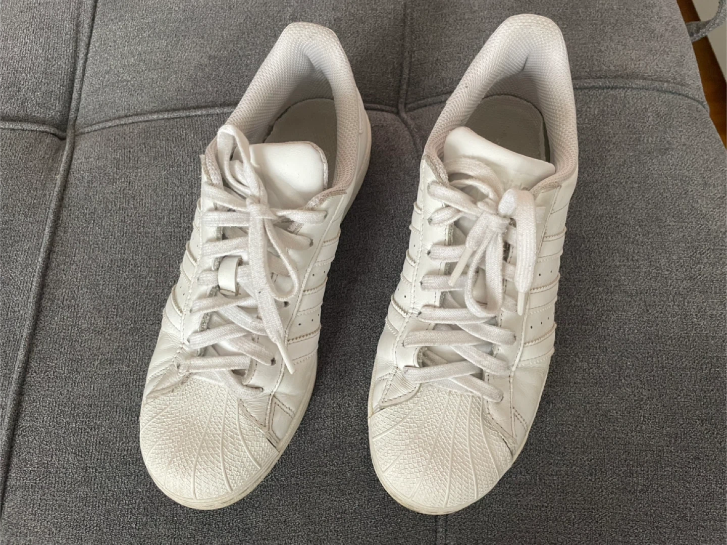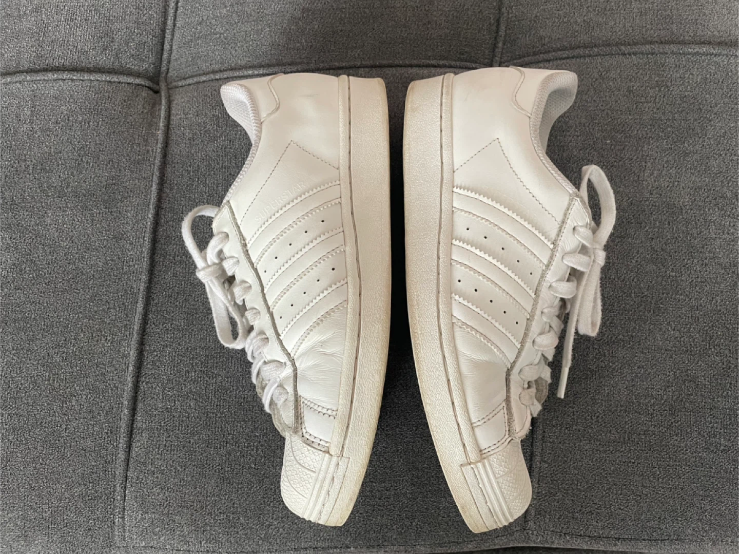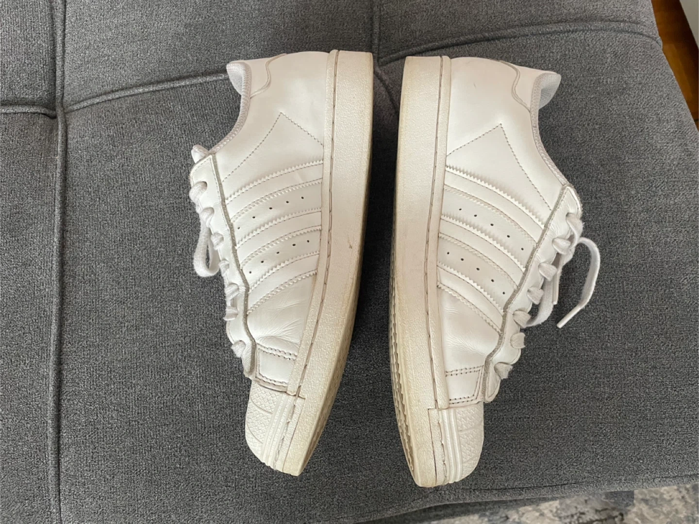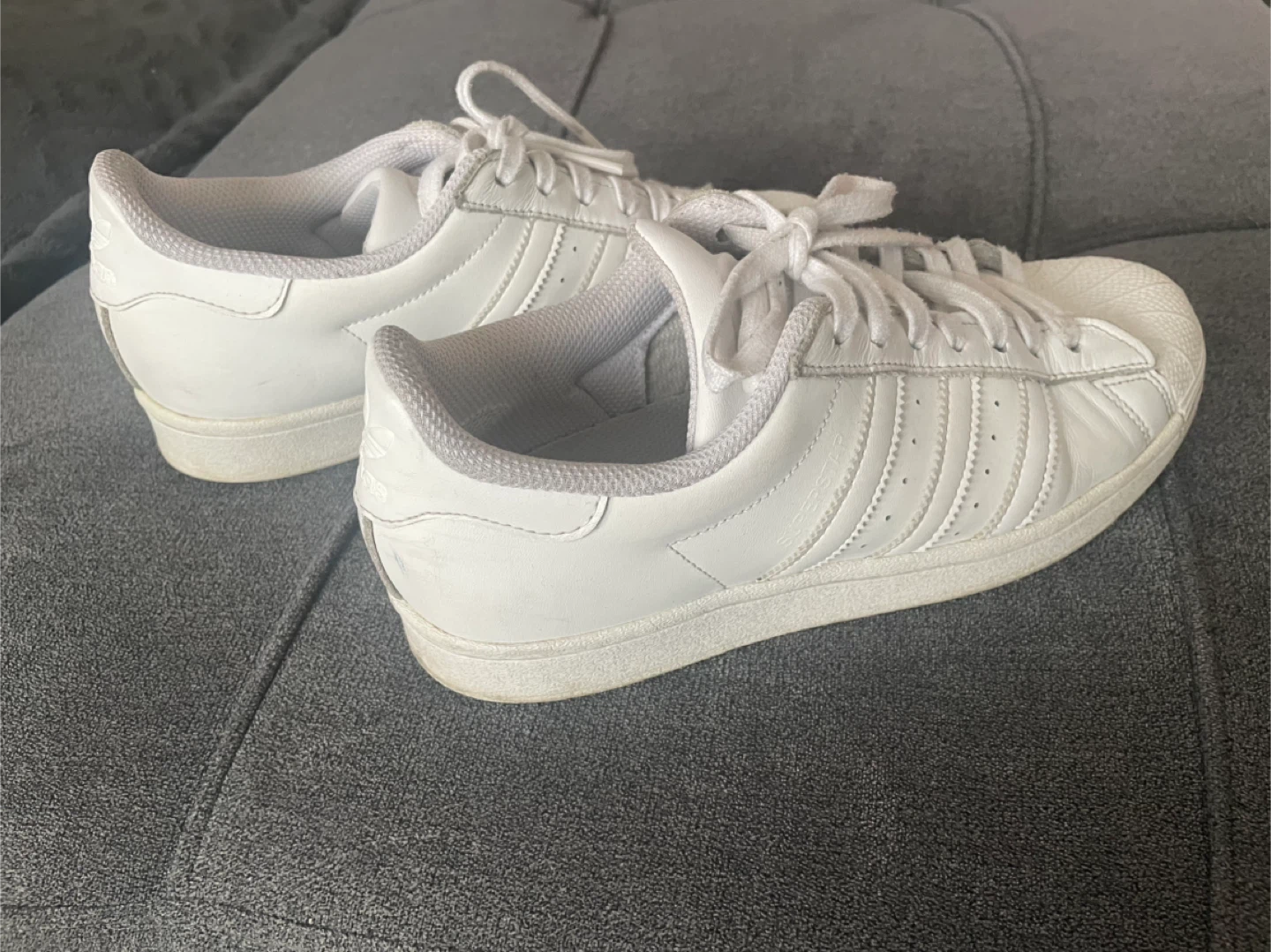 Selling a pair of classic Adidas Superstar leather sneakers in white. They're in good condition and ready for a new home! These are a timeless style that goes with everything