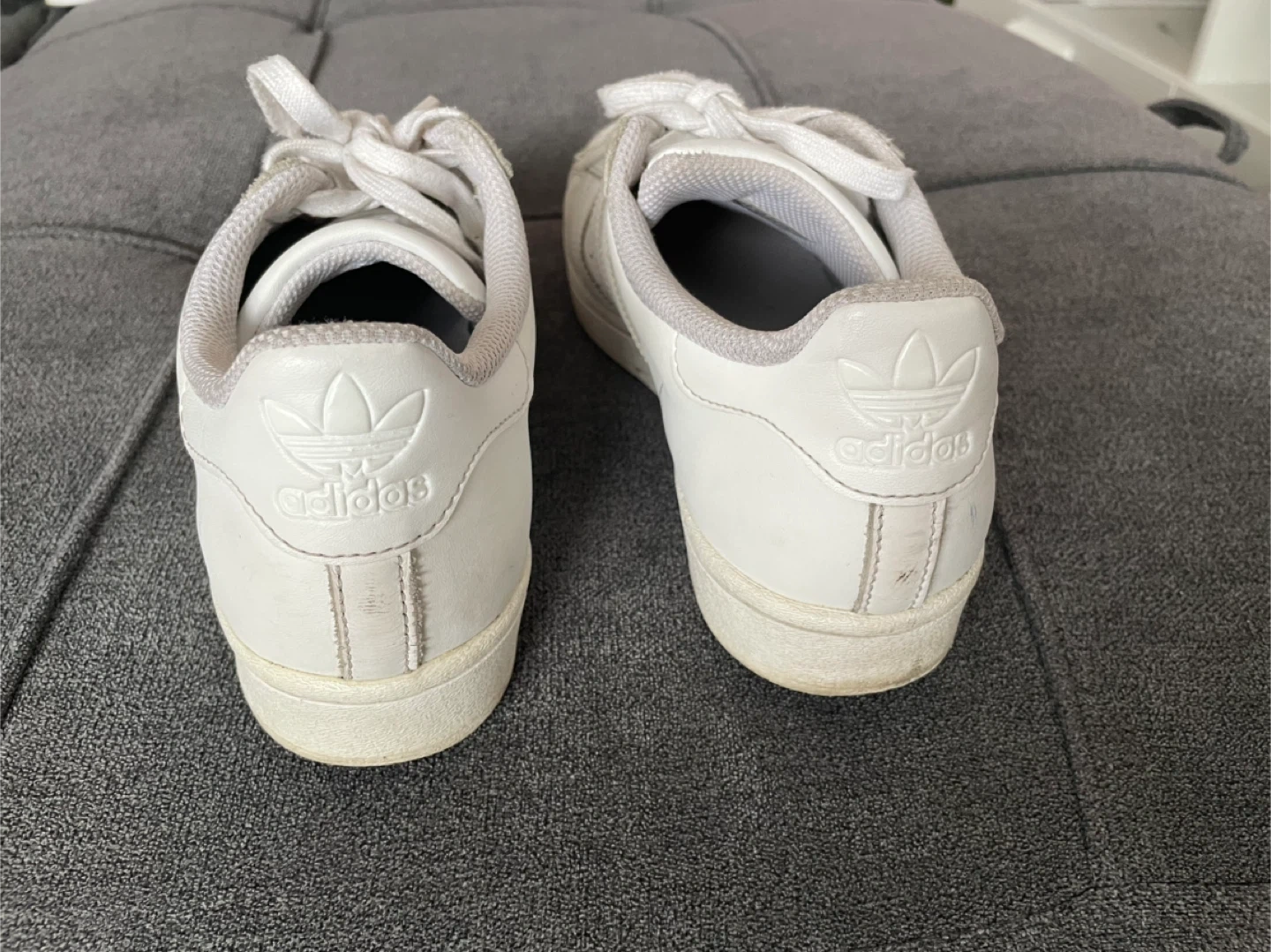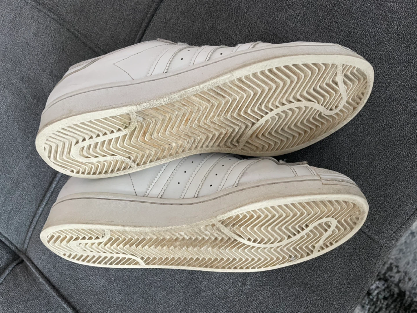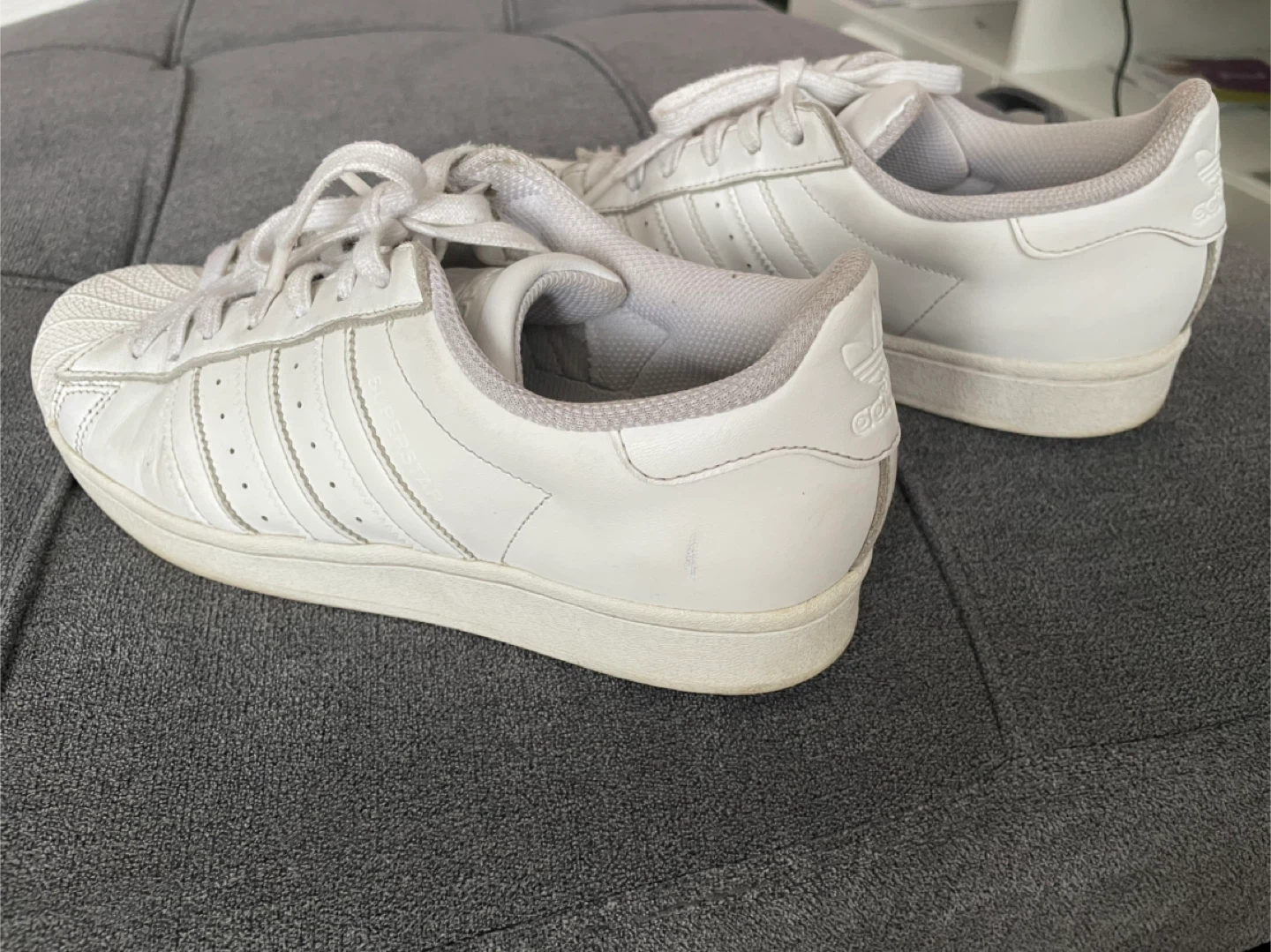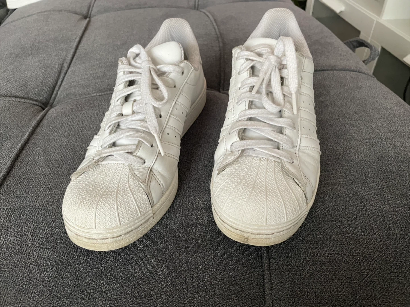 Selling a pair of classic Adidas Superstar leather sneakers in white. They're in good condition and ready for a new home! These are a timeless style that goes with everything