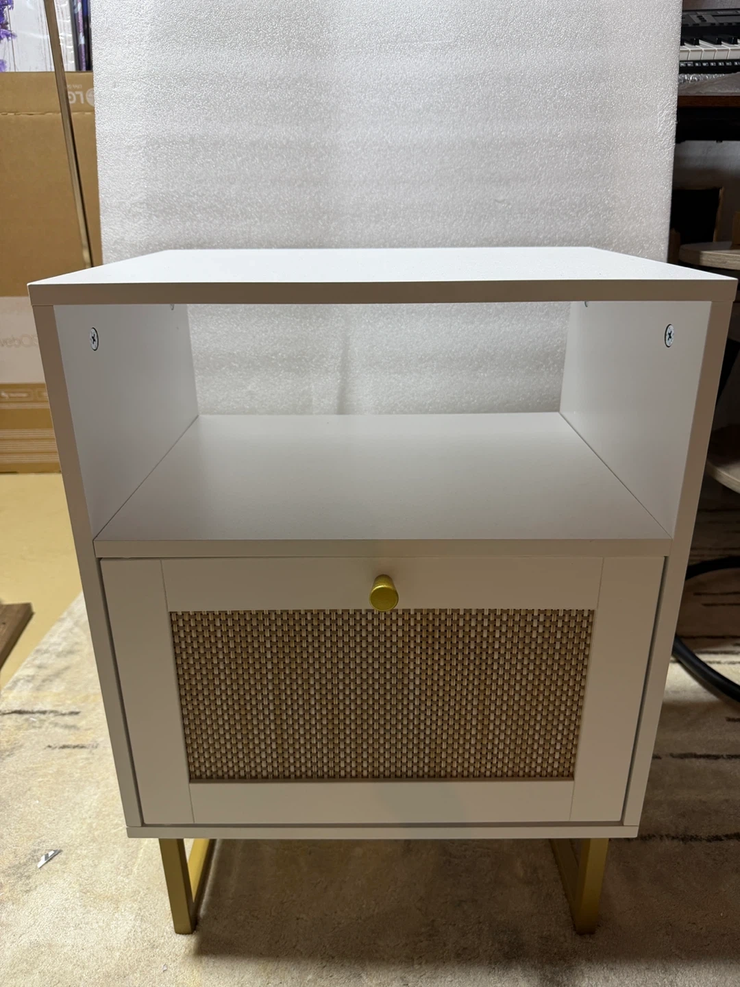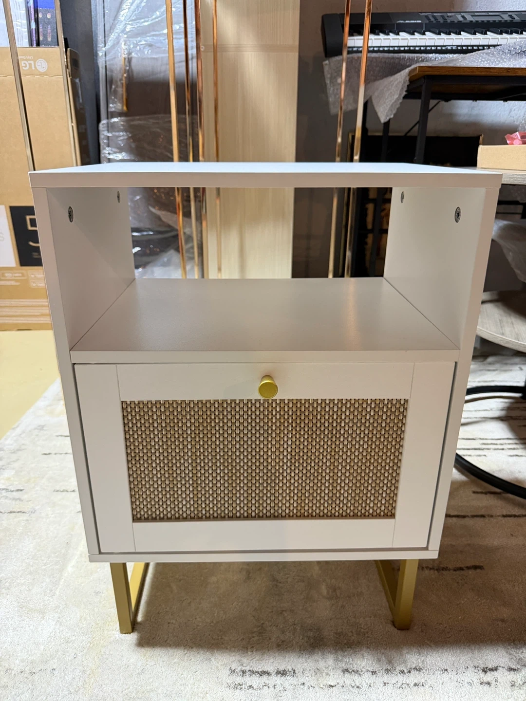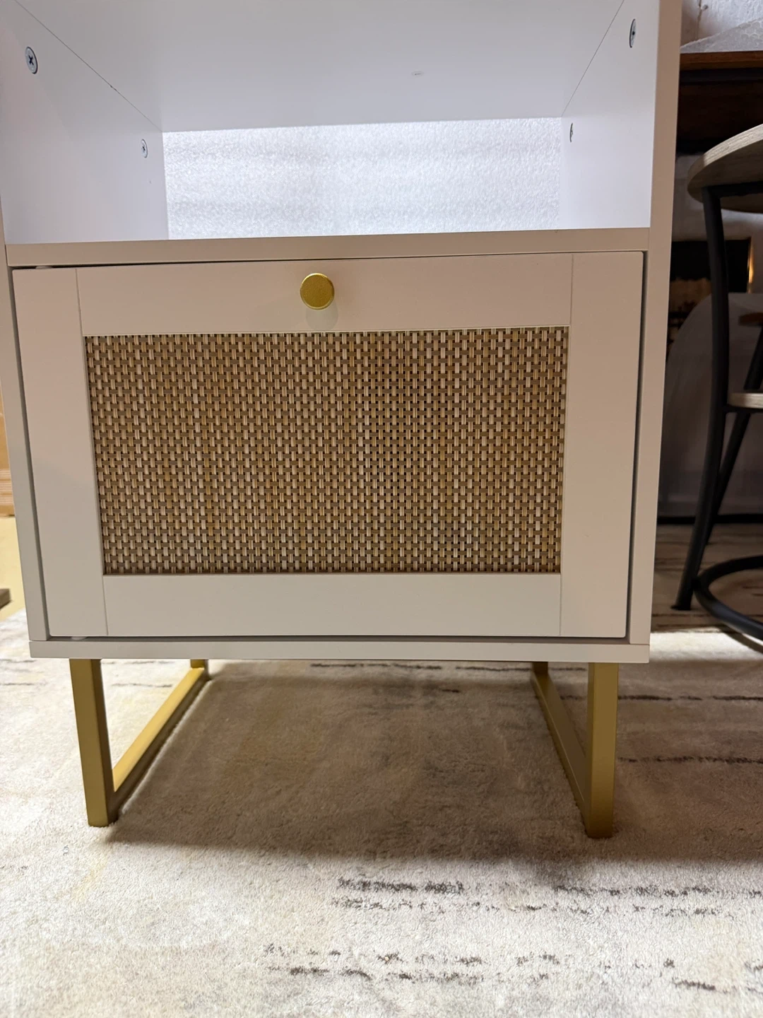 Selling a charming white nightstand! It features a shelf on top, a rattan drawer, and stylish gold legs.