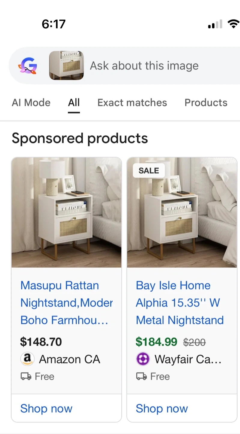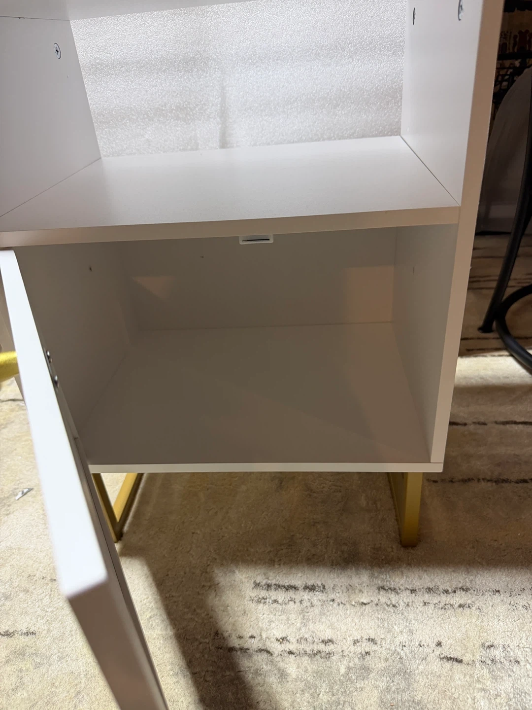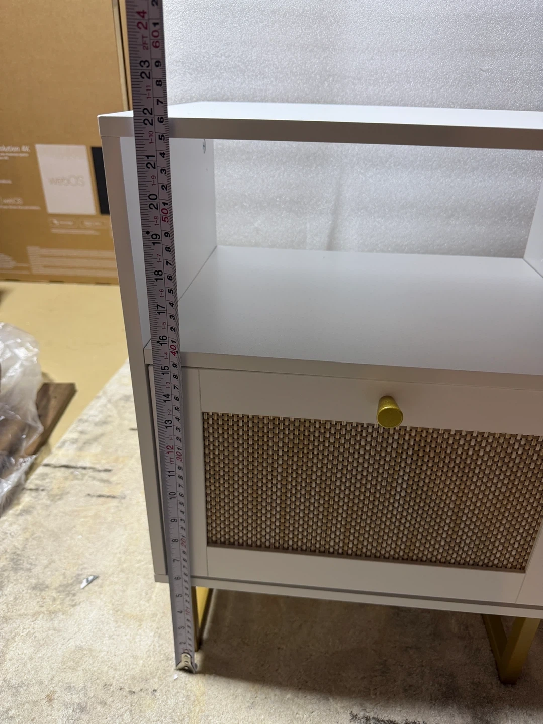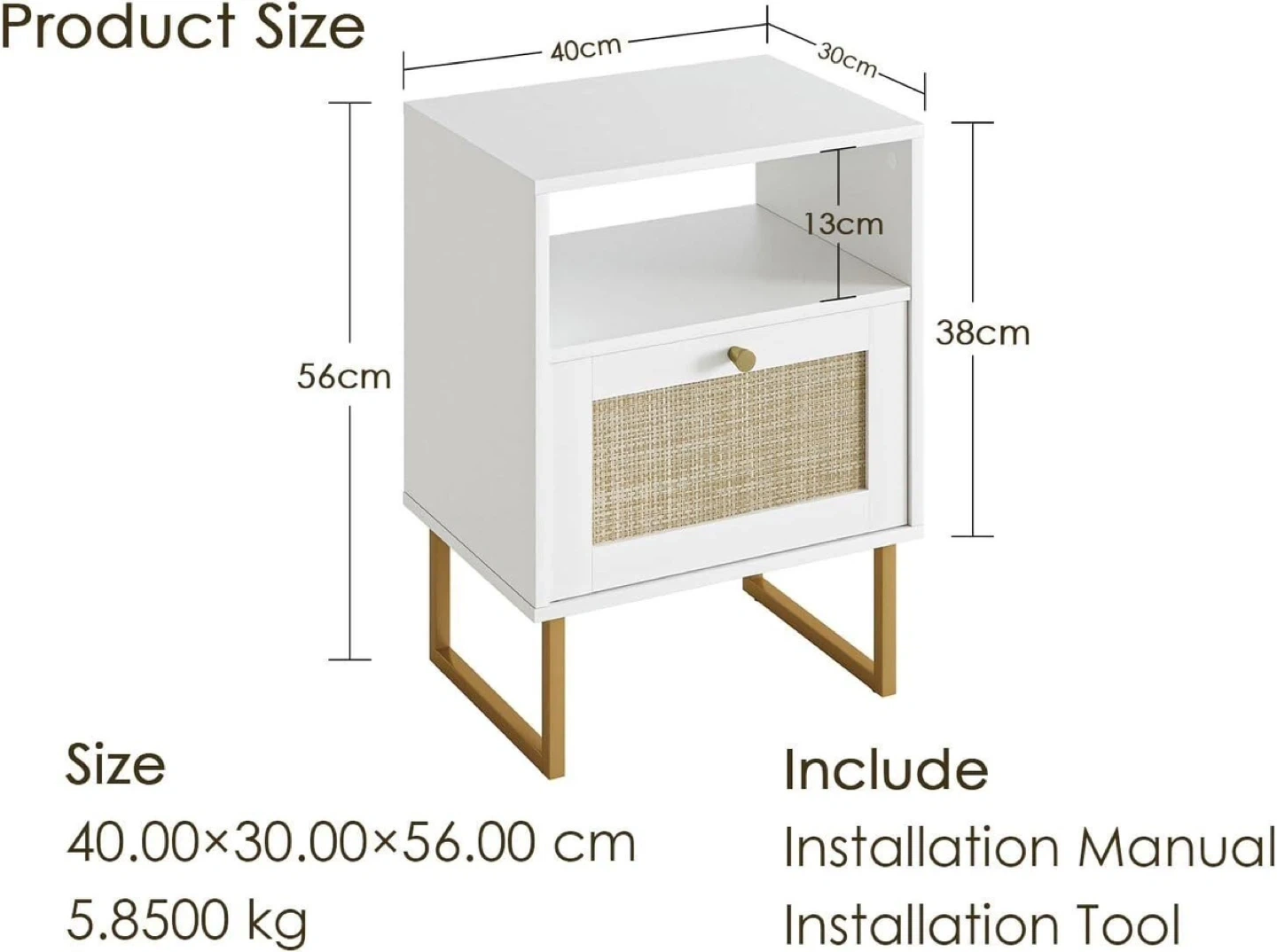 Selling a charming white nightstand! It features a shelf on top, a rattan drawer, and stylish gold legs.