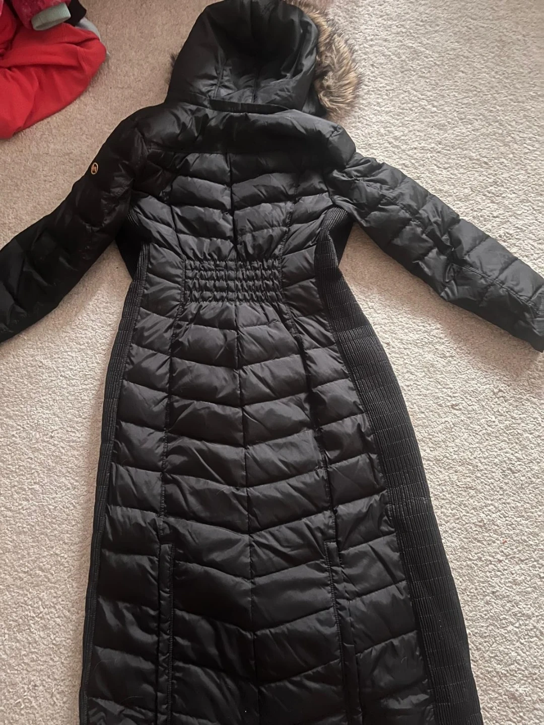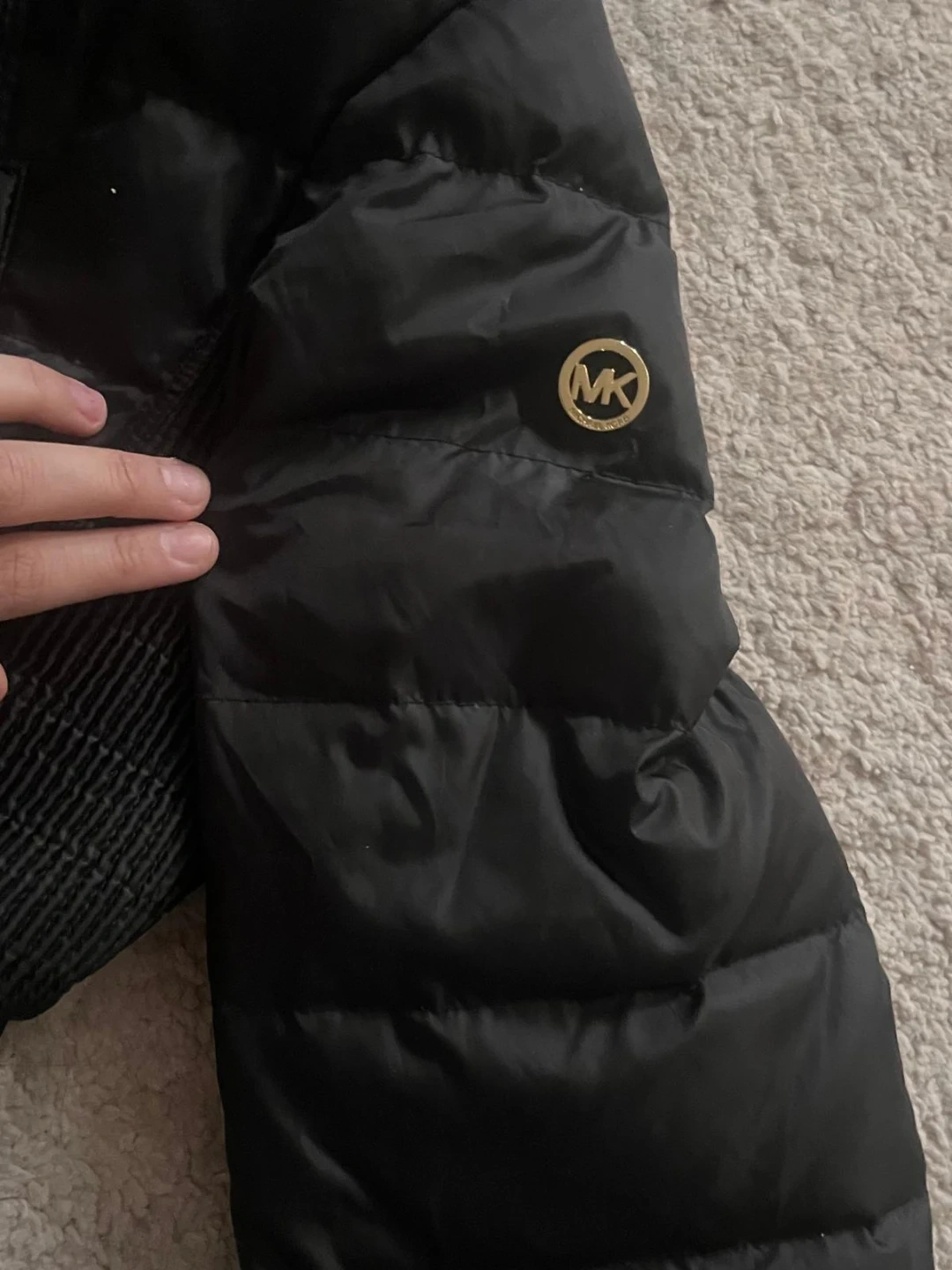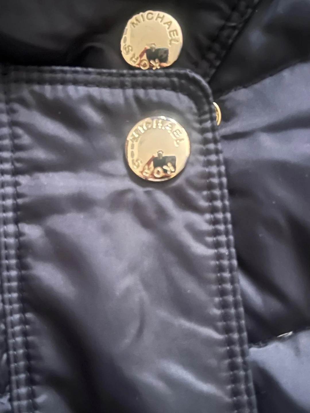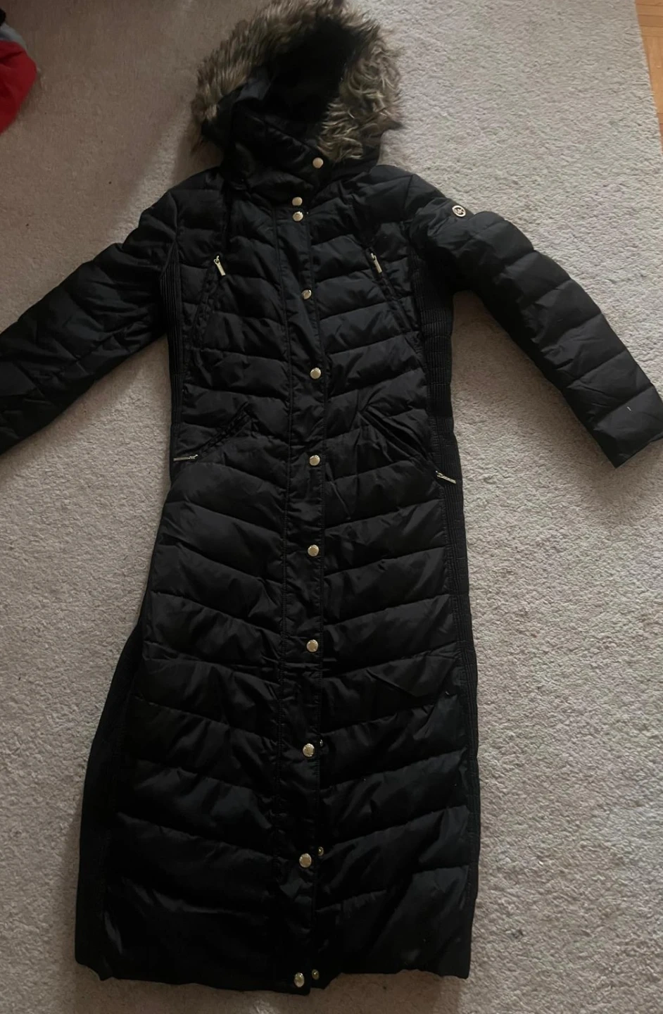 Selling a Michael Kors black puffer coat. It's in great condition and perfect for the colder weather! The coat features a faux fur hood and gold hardware details. It's a stylish and warm choice for the winter season