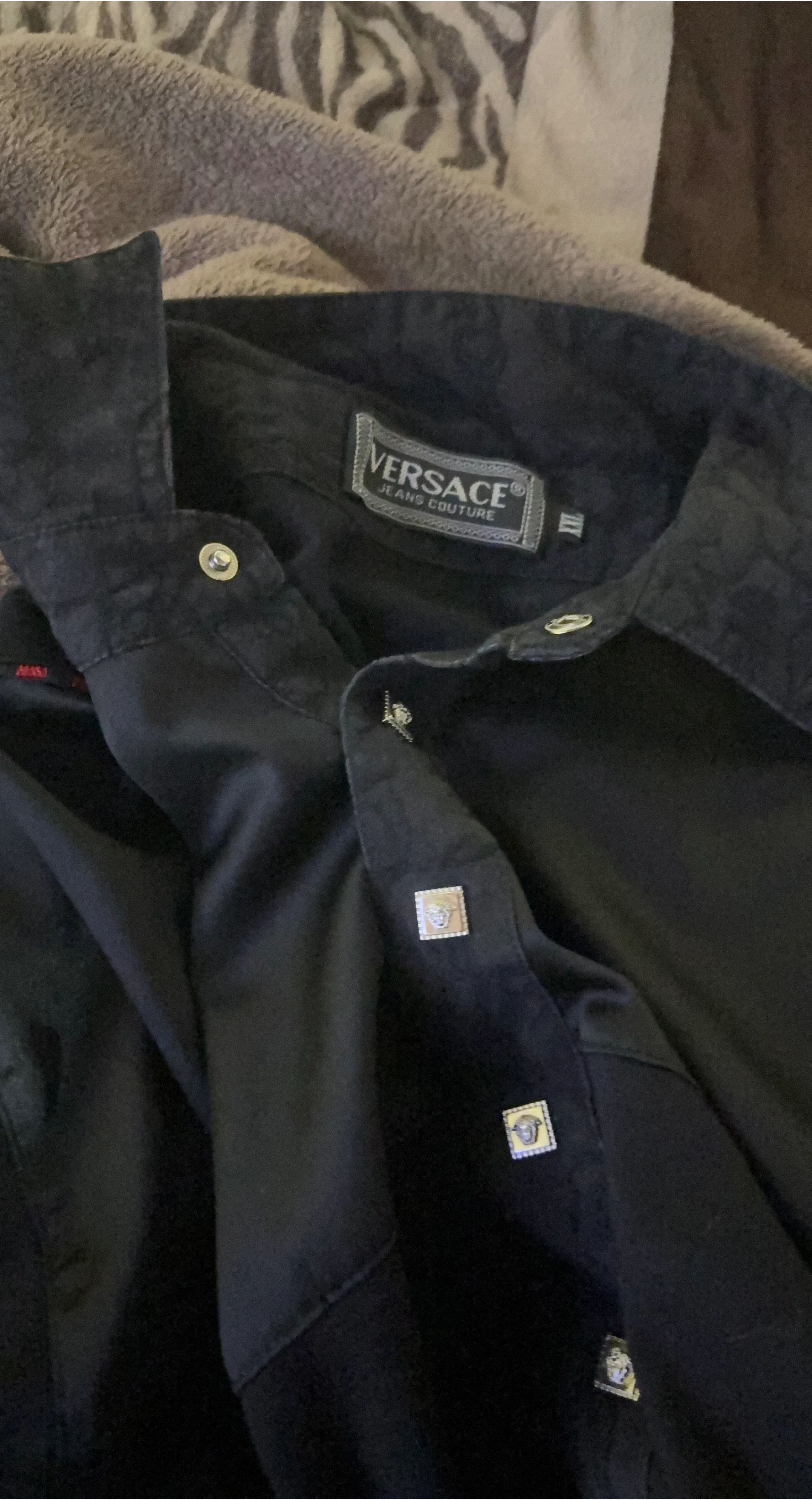 Selling a Versace Jeans Couture shirt in black, size XL . It features unique Versace logo buttons.