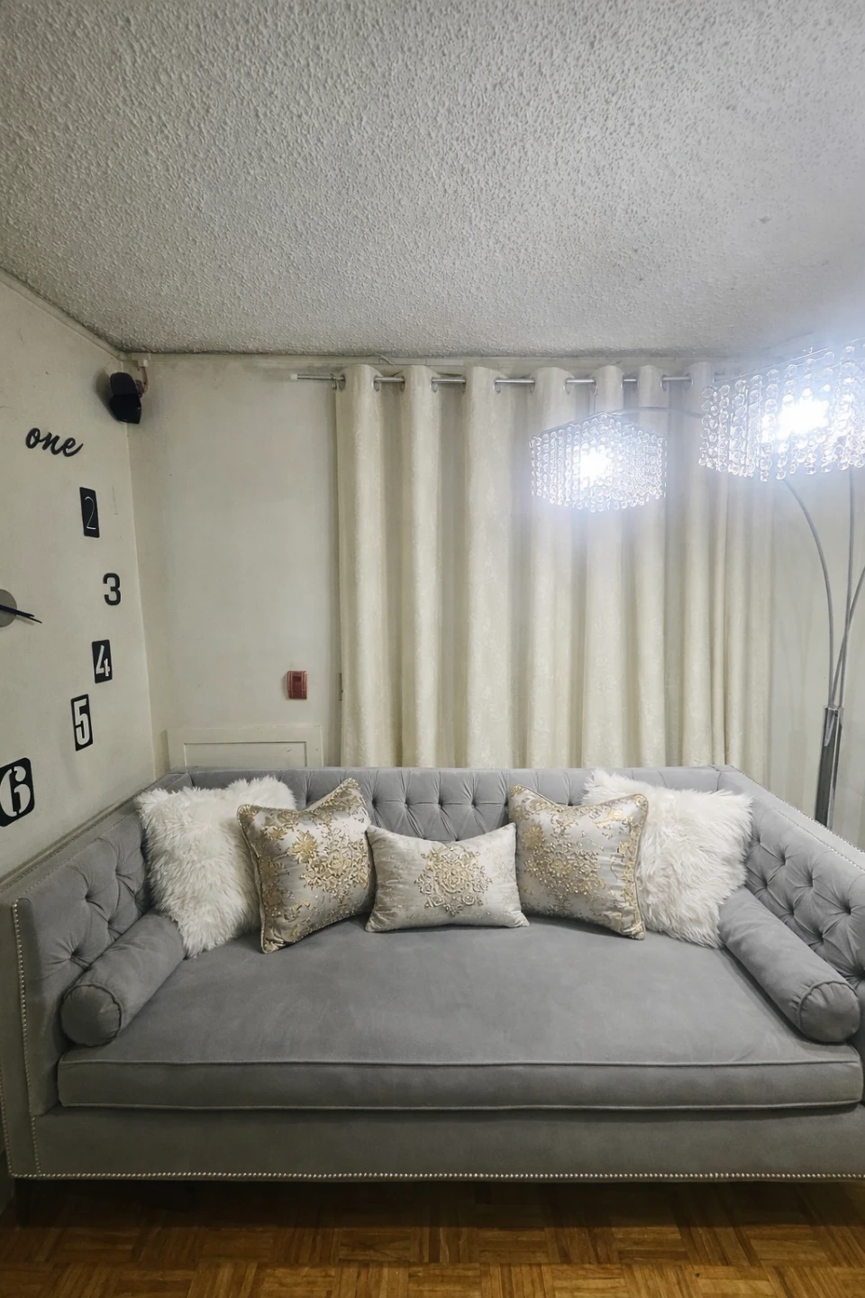 Beautiful modern grey tufted couch with elegant nailhead detailing. Recently cleaned and well-maintained, looks almost new. Super comfortable with a firm yet cozy seat. Perfect statement piece for any living room.