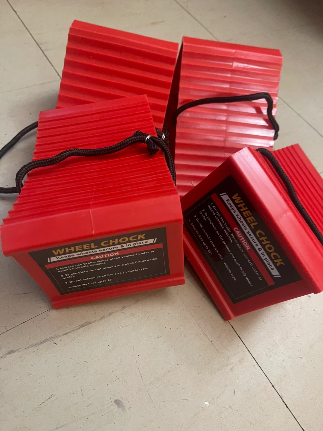 Selling a set of red wheel chocks to keep your vehicle secure and in place! They're designed to keep wheels secure and prevent rolling. Great for various tire sizes, up to 26". Always use brakes with the chocks for maximum safety