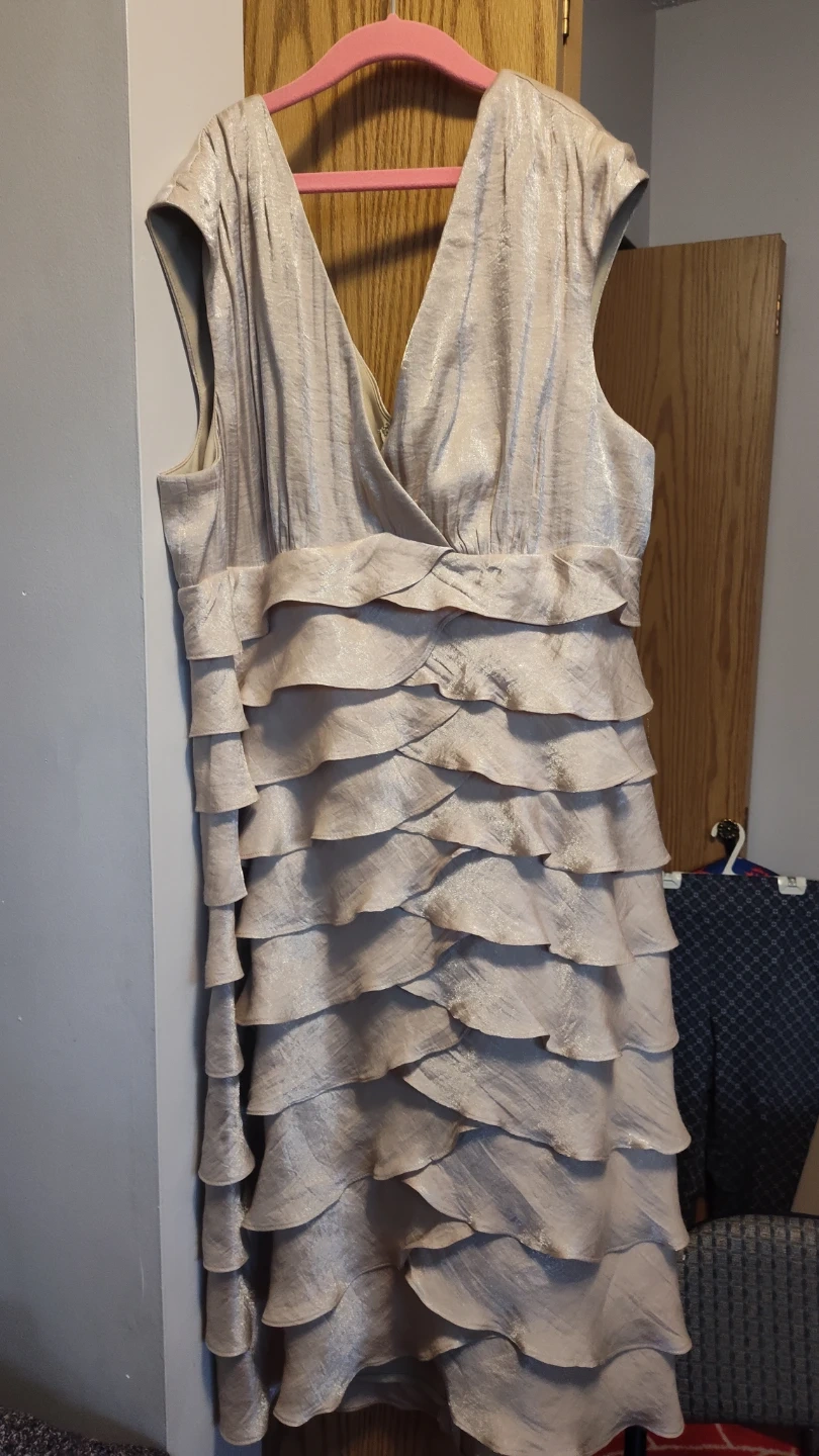 BN just below the knee cocktail dress, zipper in the back, size 18, each ruffle has a lining. The material has a nice shimmer to it(pic does not do it justice). Sadly to small for me so your gain.BN small dog home. PU 216th & Lougheed Hwy or Pitt Meadows.