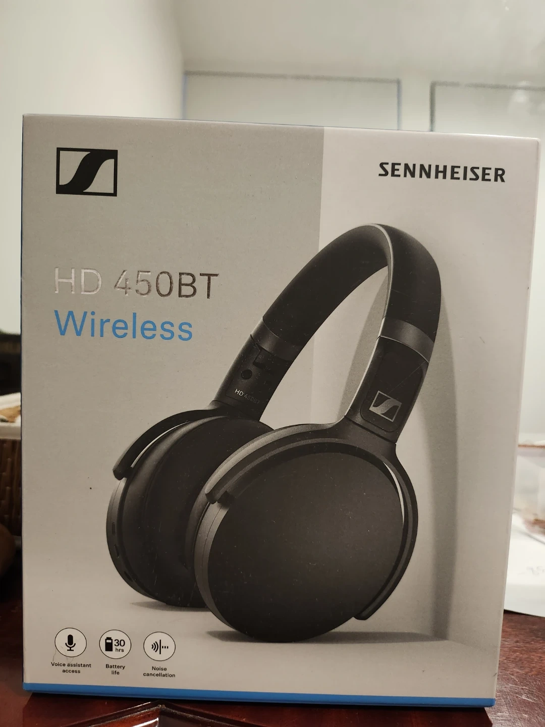 Selling a pair of Sennheiser HD 450BT wireless headphones! The box shows they have voice assistant access, 30 hours of battery life, and noise cancellation