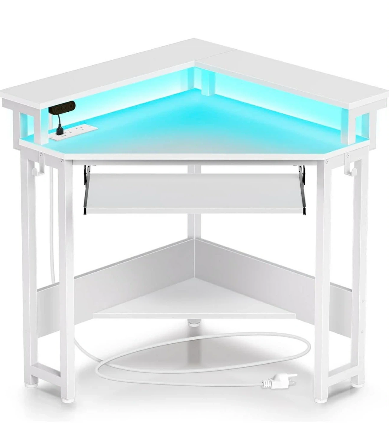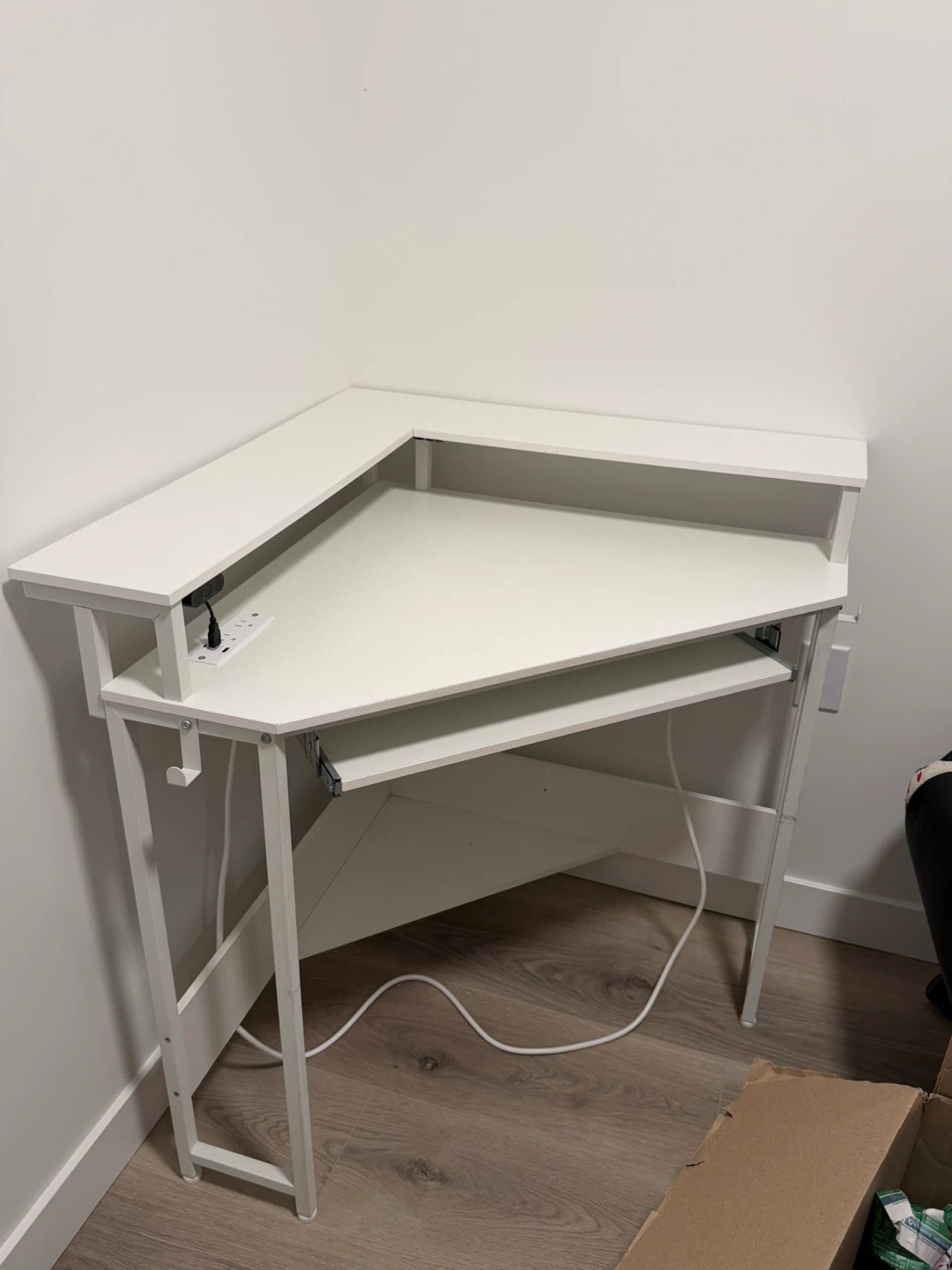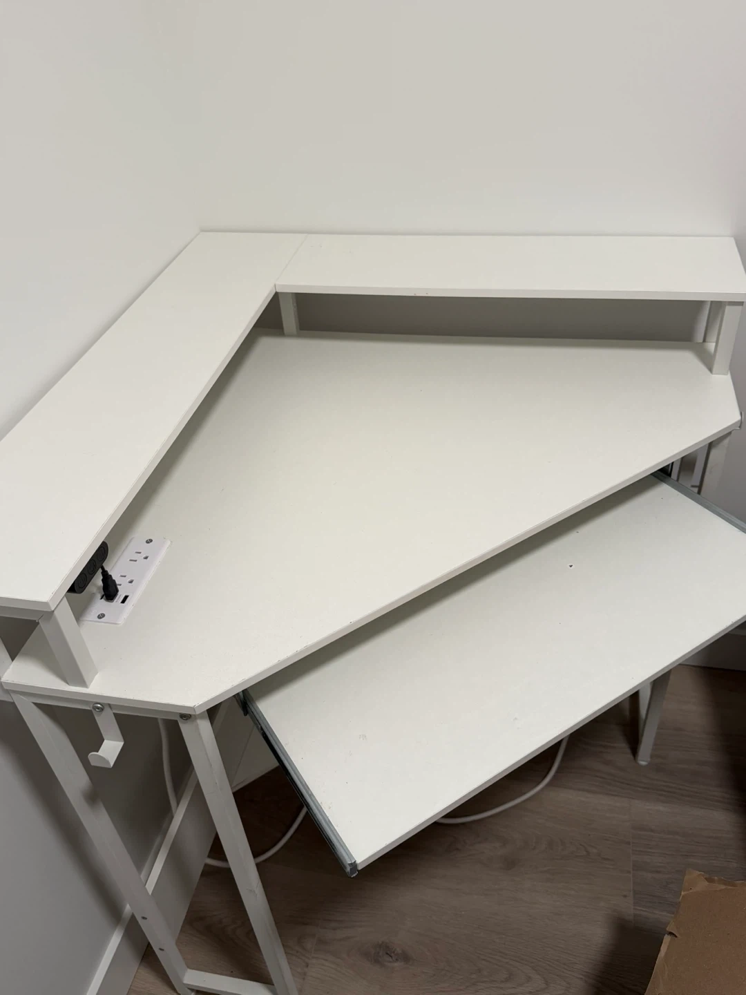 Selling a white corner desk, perfect for smaller spaces! It features a handy keyboard tray, built-in RGB lights, and both USB and regular power sockets for added convenience. The desk is in good condition and makes a great addition to any home office or study area.