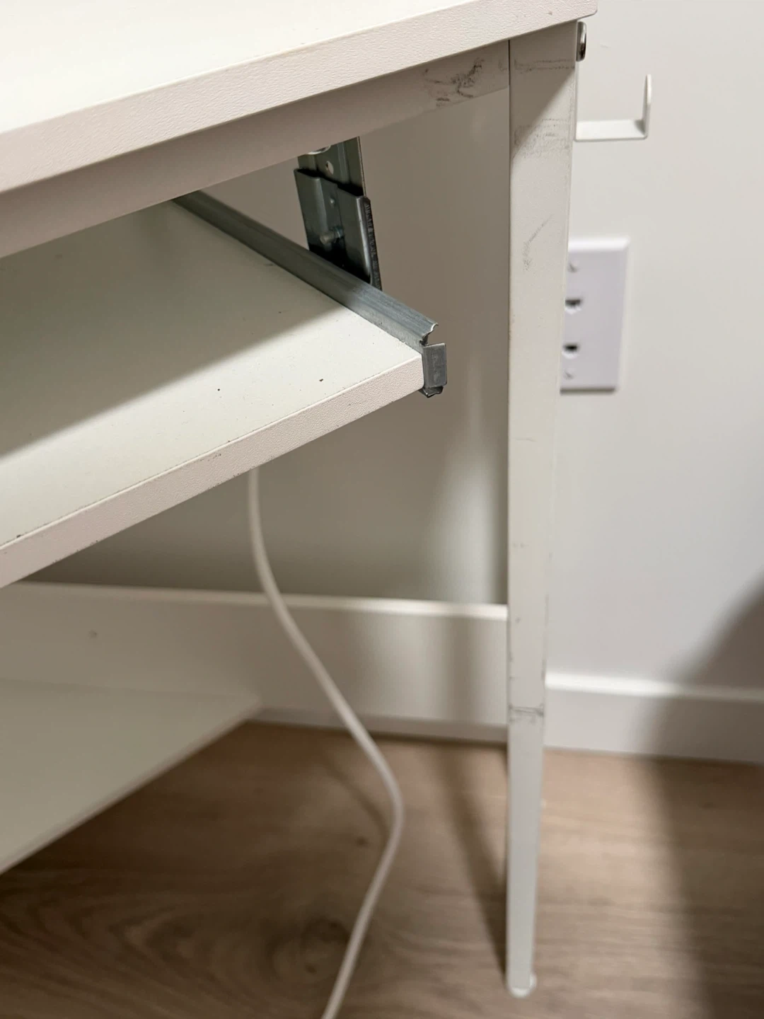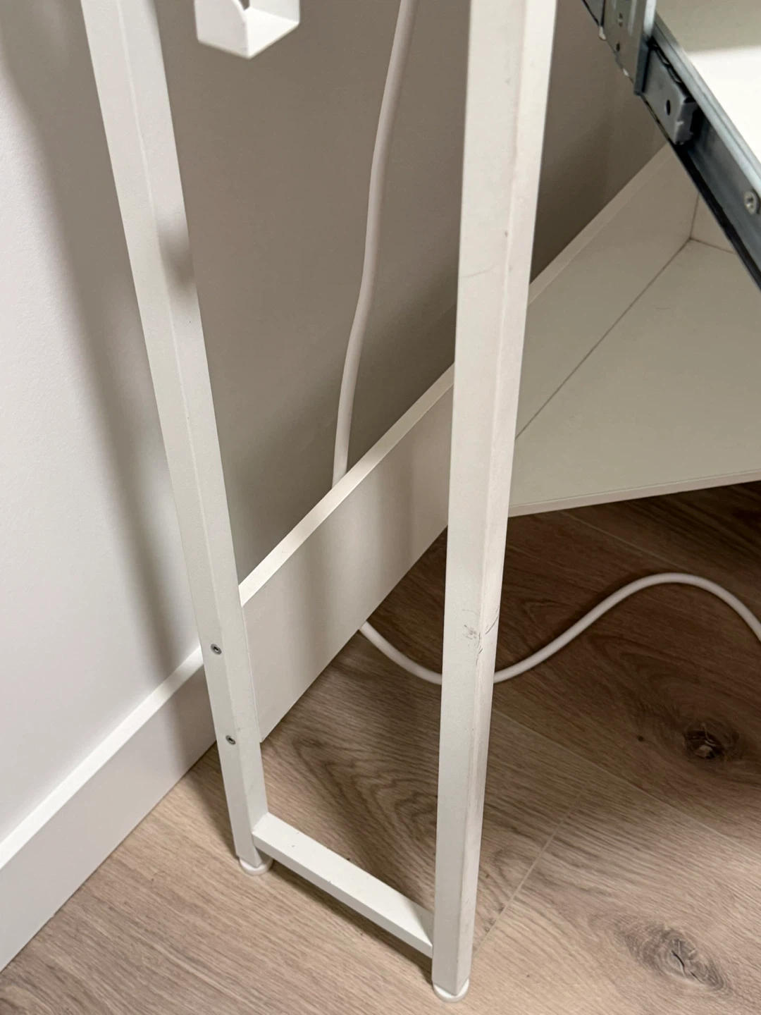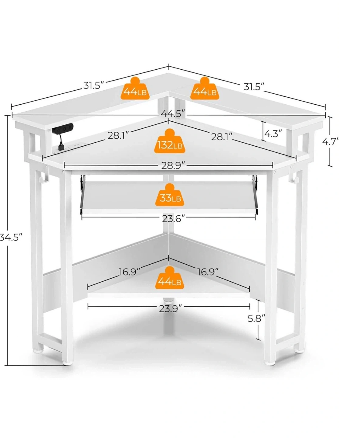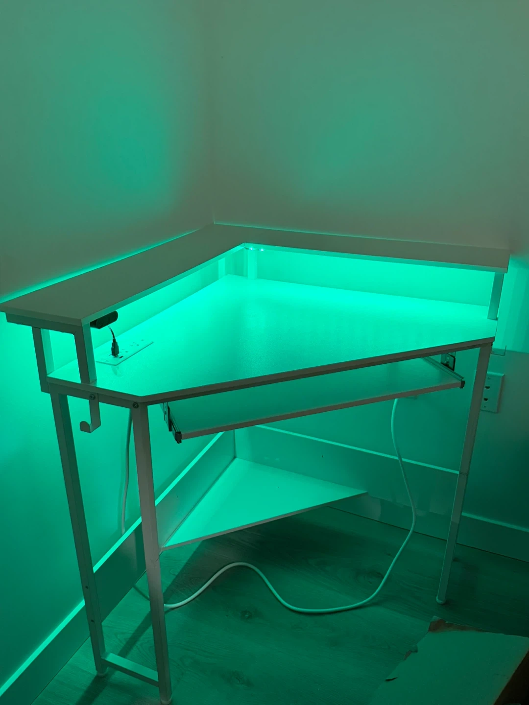 Selling a white corner desk, perfect for smaller spaces! It features a handy keyboard tray, built-in RGB lights, and both USB and regular power sockets for added convenience. The desk is in good condition and makes a great addition to any home office or study area.