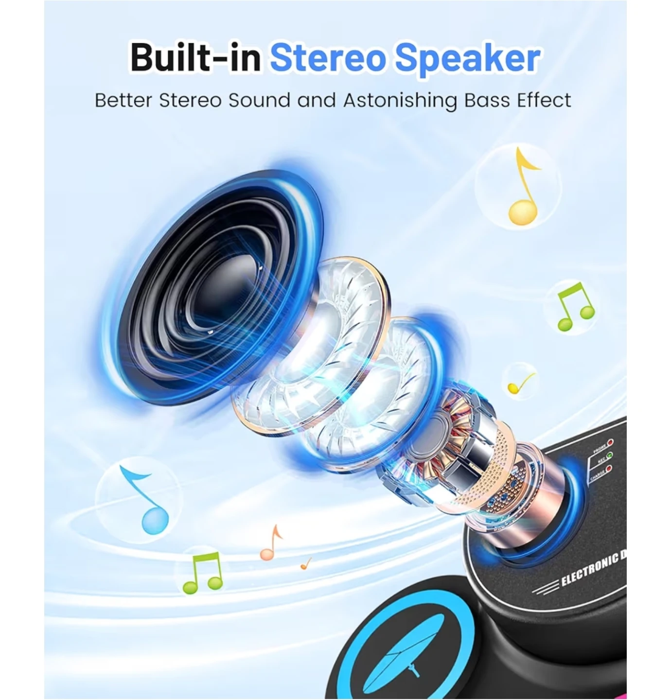 - Built-in stereo speaker for better sound and bass