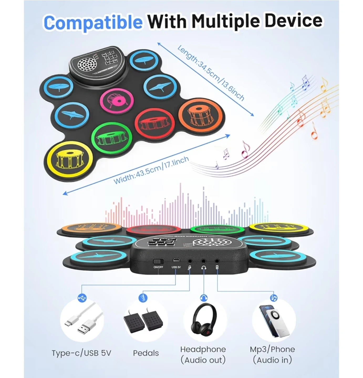 - Includes type-C/USB 5V, pedals, and audio out for headphones and audio in for MP3/Phone