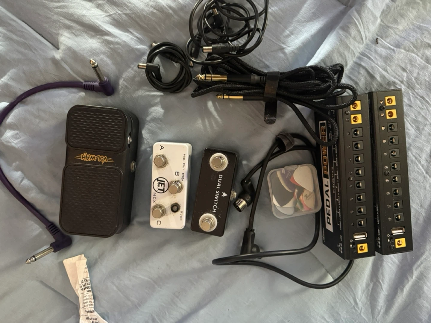 Selling a Squier Precision Bass guitar. It's in good condition and ready for a new player! Includes some accessories such as cables, pedals, and picks.