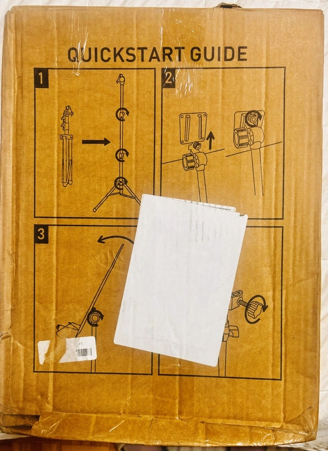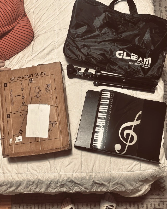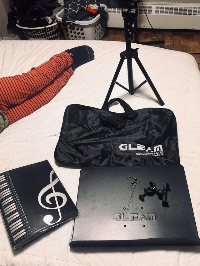 I am selling a brand new Gleam sheet music stand still in its original box, perfect for musicians of all levels. The stand is adjustable, ranging from 35 to 55 inches (90-140 cm), and features a tray dimension of 17.4 x 13.5 inches (44 x 34 cm). Constructed from iron and ABS plastic, it has a bearing capacity of 10 lbs (4.5 kg). This music stand also includes a sheet music binder and a carrying bag for easy transport and storage. If the ad is up, it's still available!