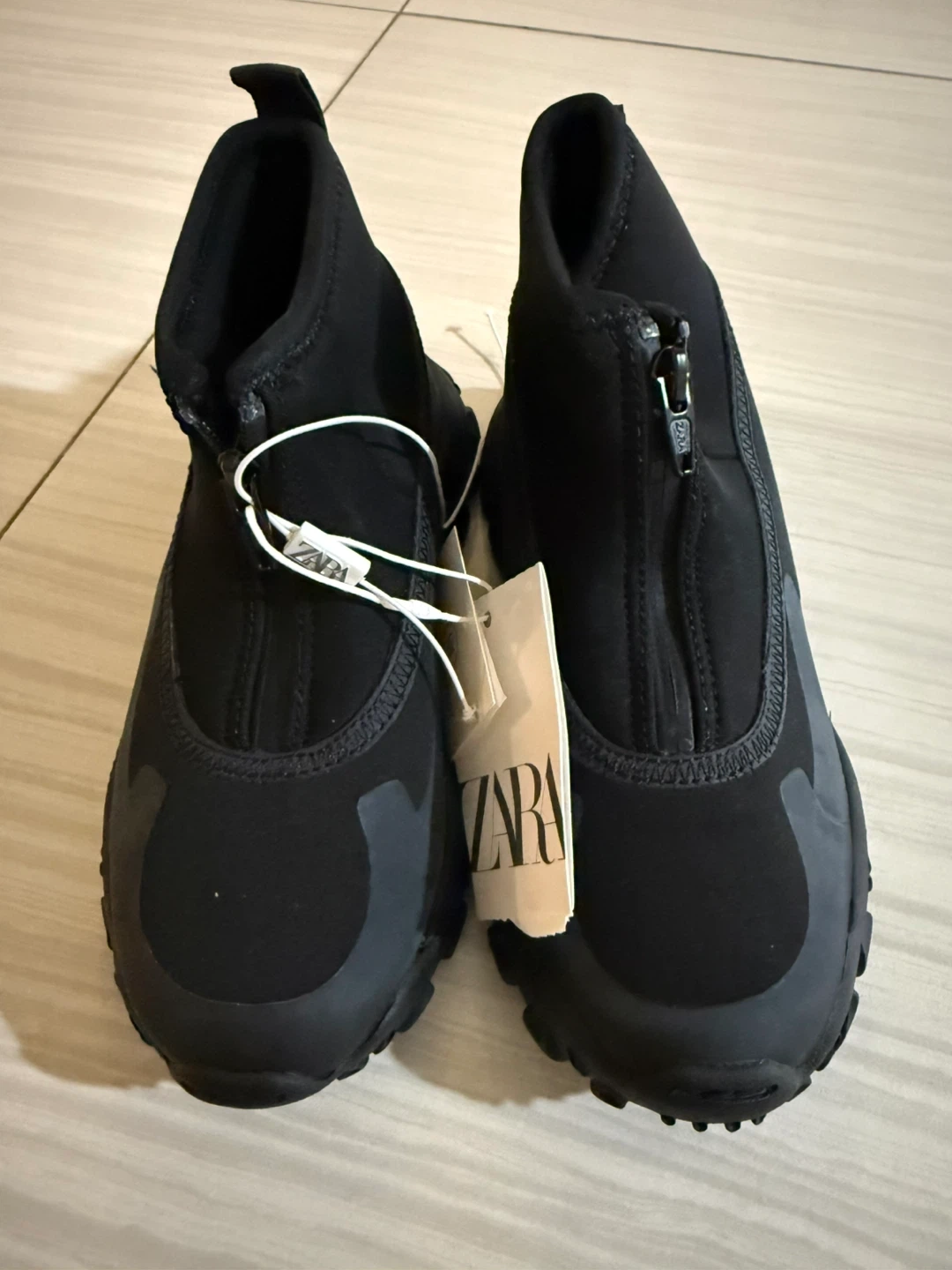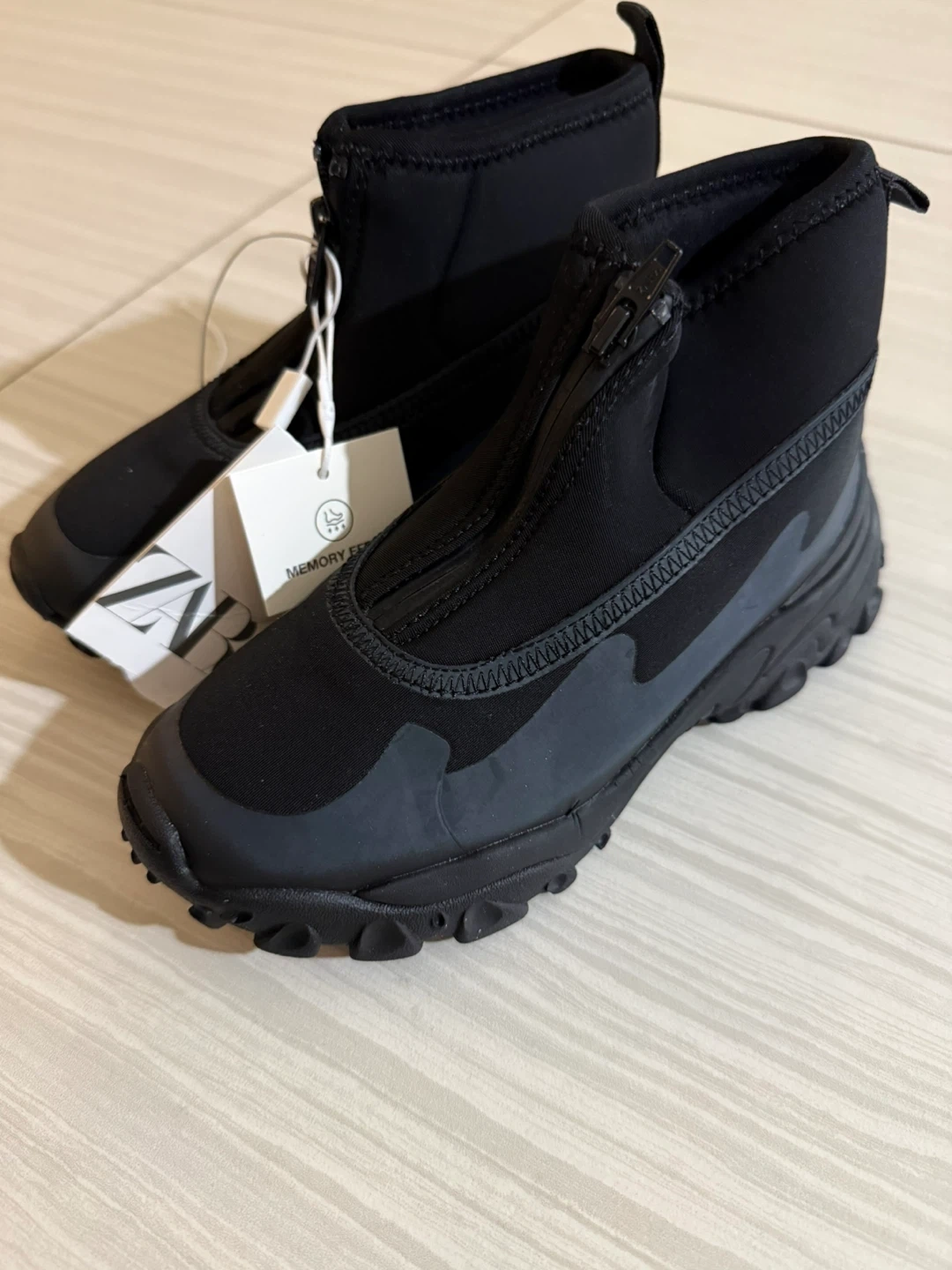 Selling a pair of Zara black ankle boots. They feature a front zipper and a rugged sole. The tag indicates they have a 'Memory Foam' insole for added comfort.