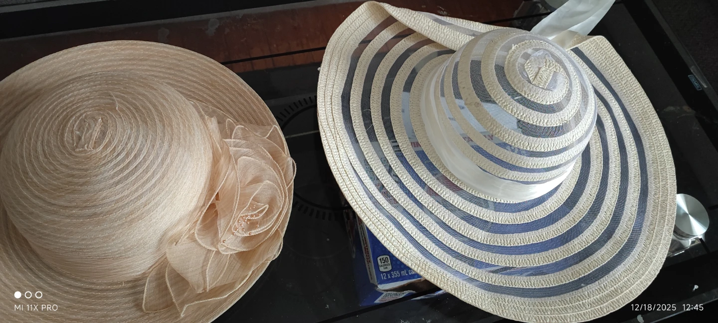 Two ladies hats in good condition! One is beige with a floral design, and the other is a striped wide-brimmed hat. Perfect for adding a touch of elegance to your outfit