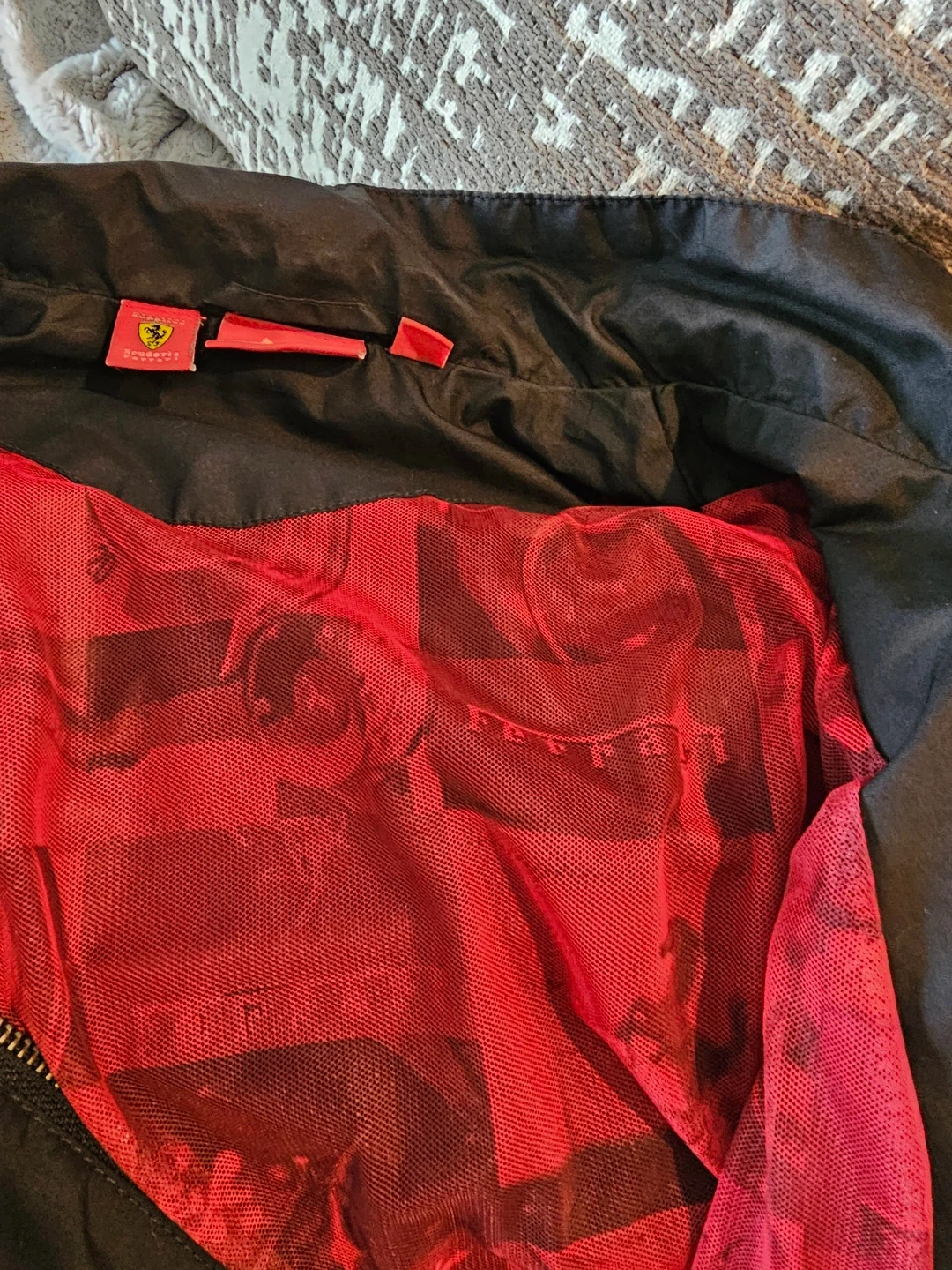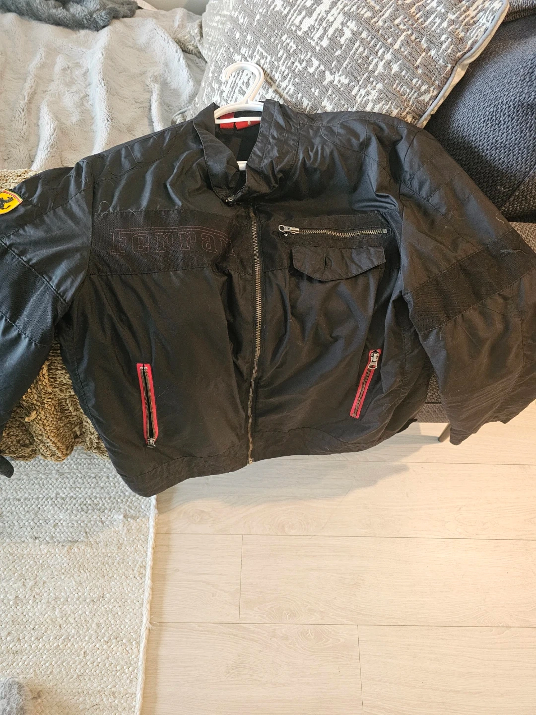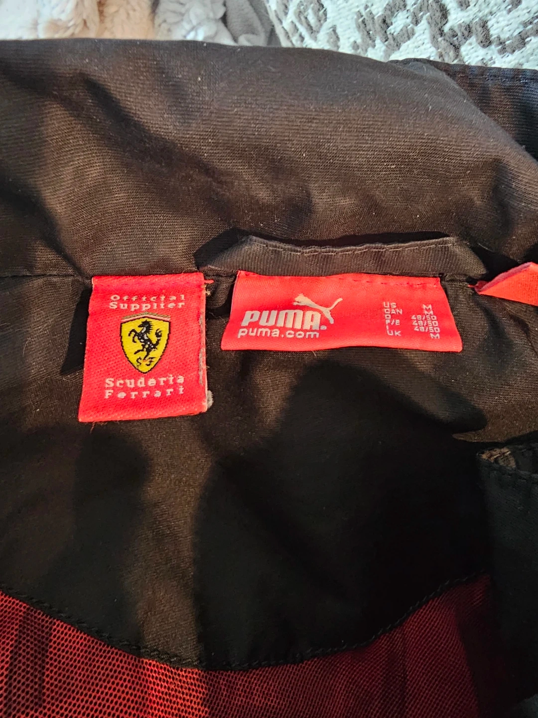 Selling a Puma Ferrari jacket. It is black with red accents and features the Ferrari logo. A stylish piece for any fan!