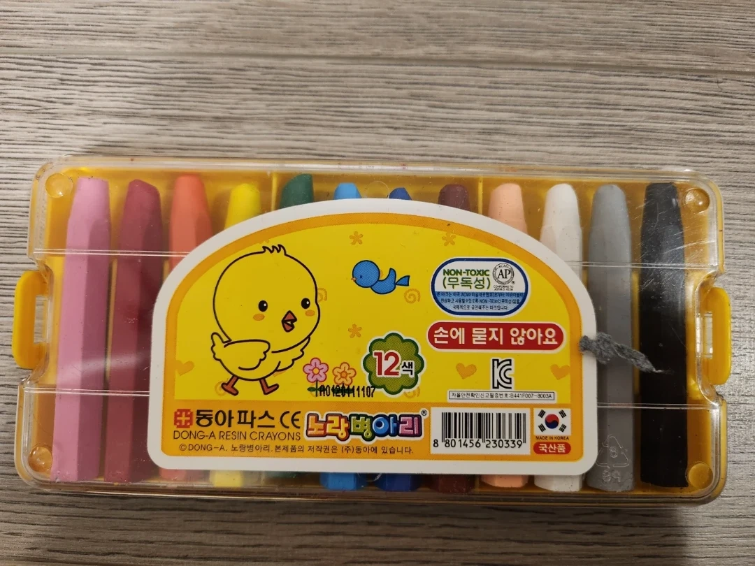 Selling a set of DONG-A Resin Crayons! This set includes 12 vibrant colours. These crayons are non-toxic and safe for children to use. They are also designed to not stain hands, making them perfect for little artists!