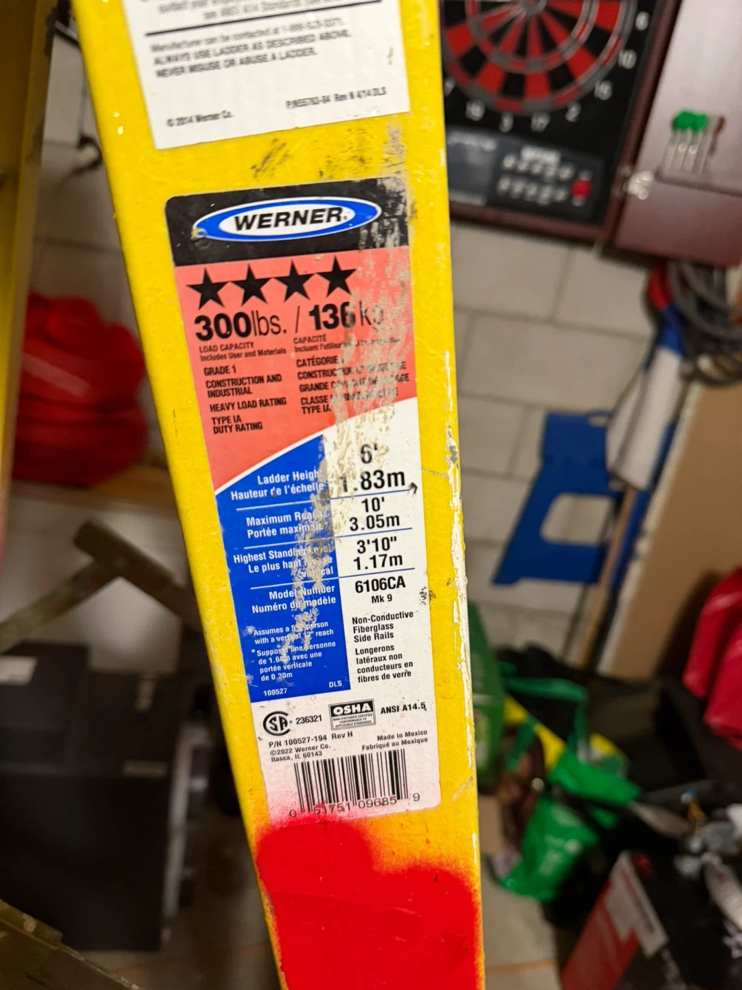 Selling a Werner 6ft ladder in good condition. It has a load capacity of 300lbs/136kg and is classified as a Type 1A duty rating. The ladder height is 1.83m (6ft) with a maximum reach of 3.05m (10ft). It's a non-conductive fibreglass ladder, model number 6106CA. Great for various tasks around the house or job site!