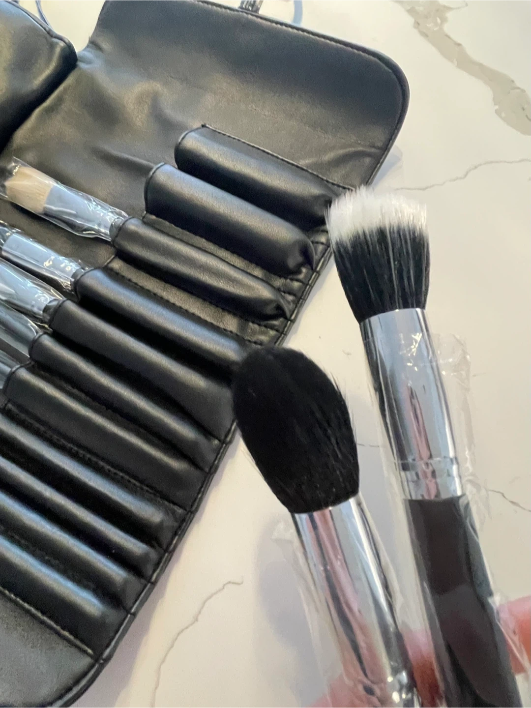 Selling a brand new 11pc makeup brush set. Comparable to Sephora quality. Comes with a cute PU leather wrap case that can be used to hold various beauty tools like eyeliner, lip brushes, tweezers. etc.