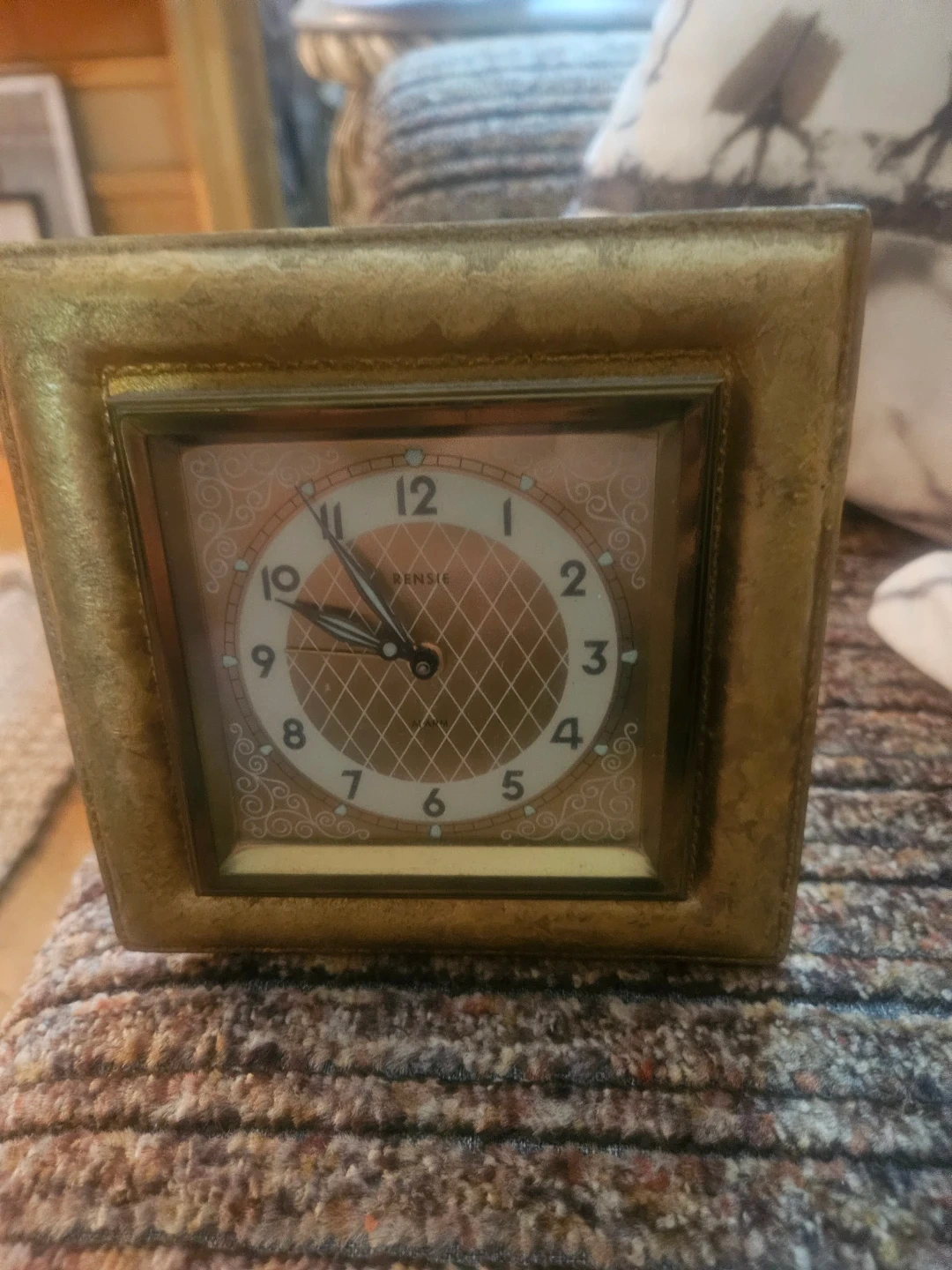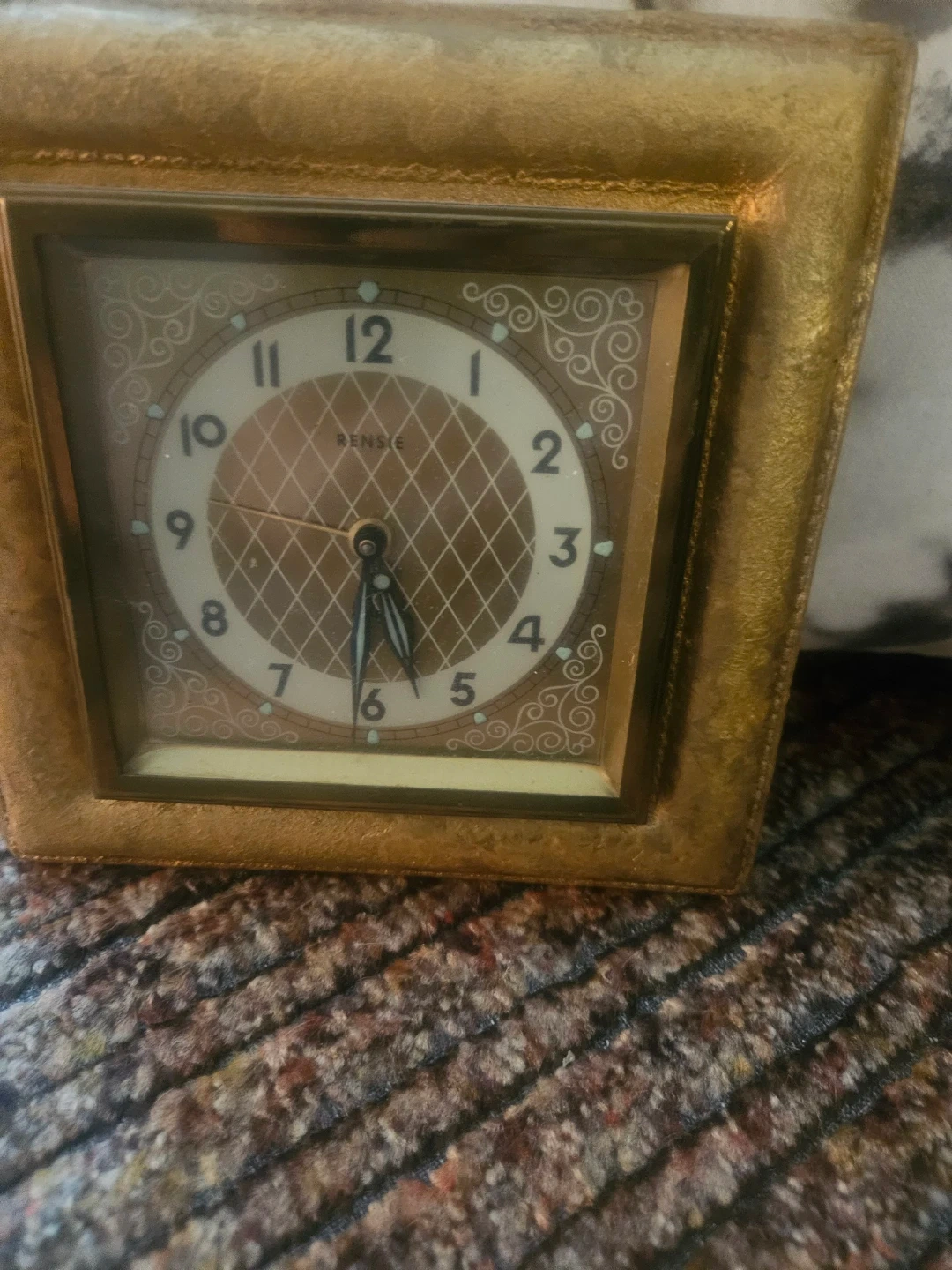 Selling a vintage Rensie Germany Leather frame alarm clock. It's gold in color and has a unique square design. Perfect for adding a touch of retro charm to your space! EXCELLENT WORKI G.