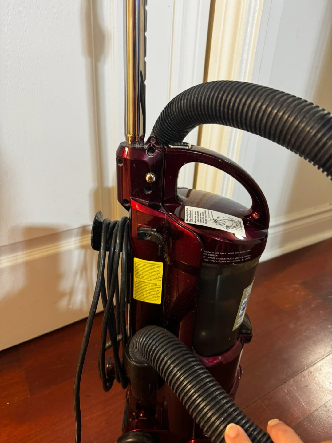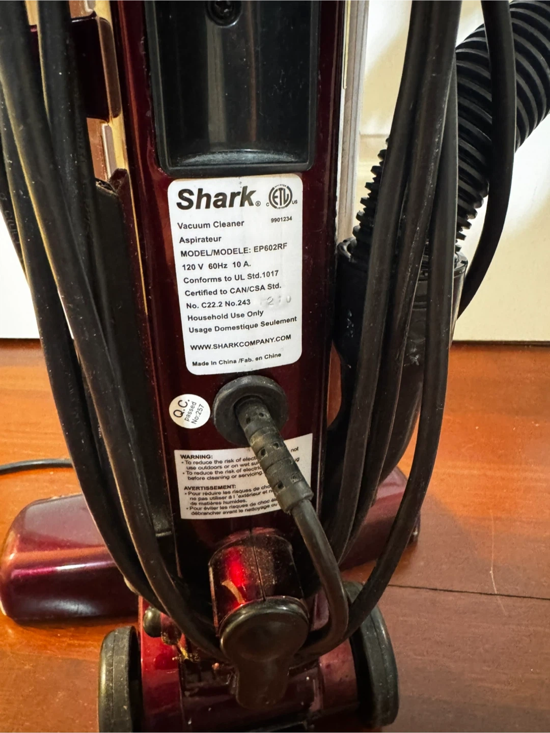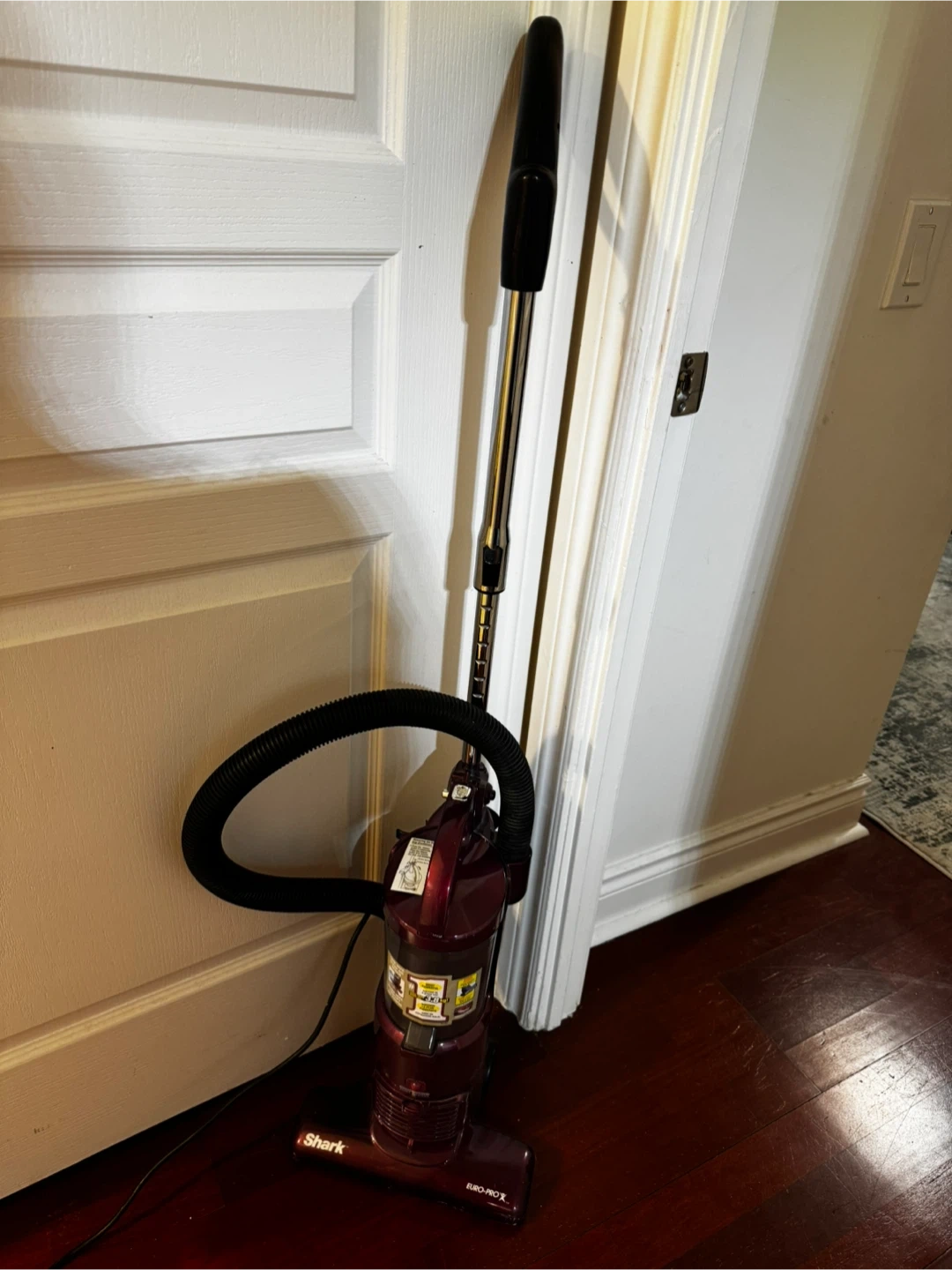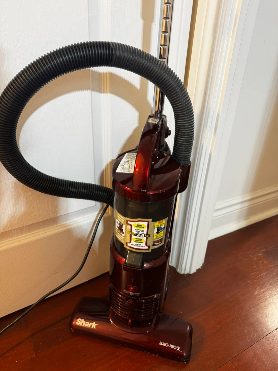 This is a burgundy Shark Euro-Pro vacuum cleaner, model EP602RF, in perfect condition. It's ready to tackle any mess with its powerful suction.