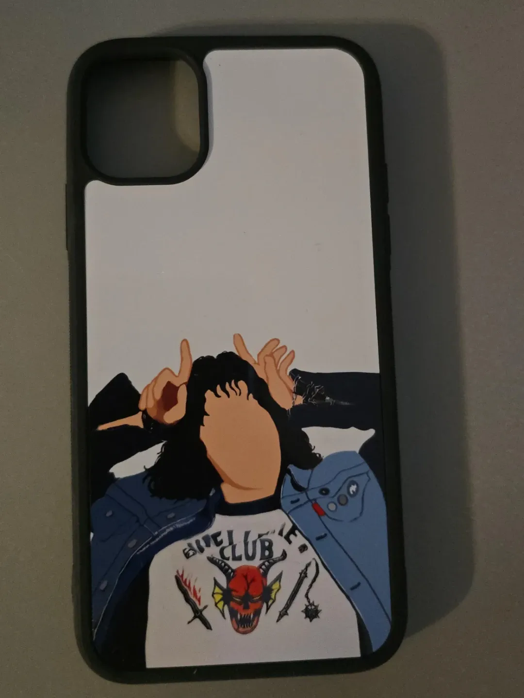 Selling a custom iPhone 11 case featuring an illustration of Eddie Munson! It's in great condition and ready to protect your phone with a bit of Stranger Things flair