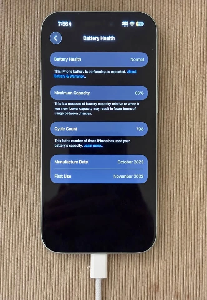 Battery health: 86% (lasted me the whole day, charges very fast)
