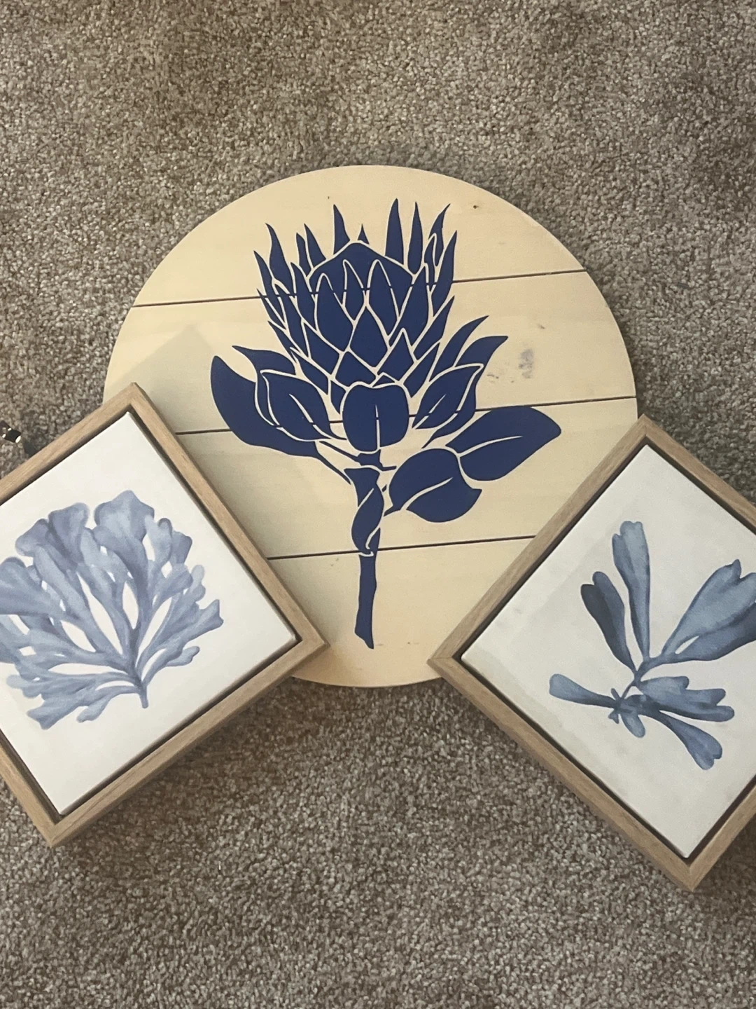 Here's a lovely set of coastal-themed wall art! It includes a round piece with a blue flower design and two square framed pieces with blue coral/seaweed designs. They would look great in any room! The whole set is $8
