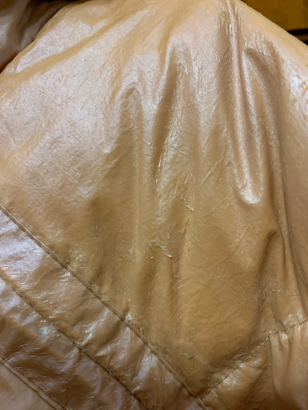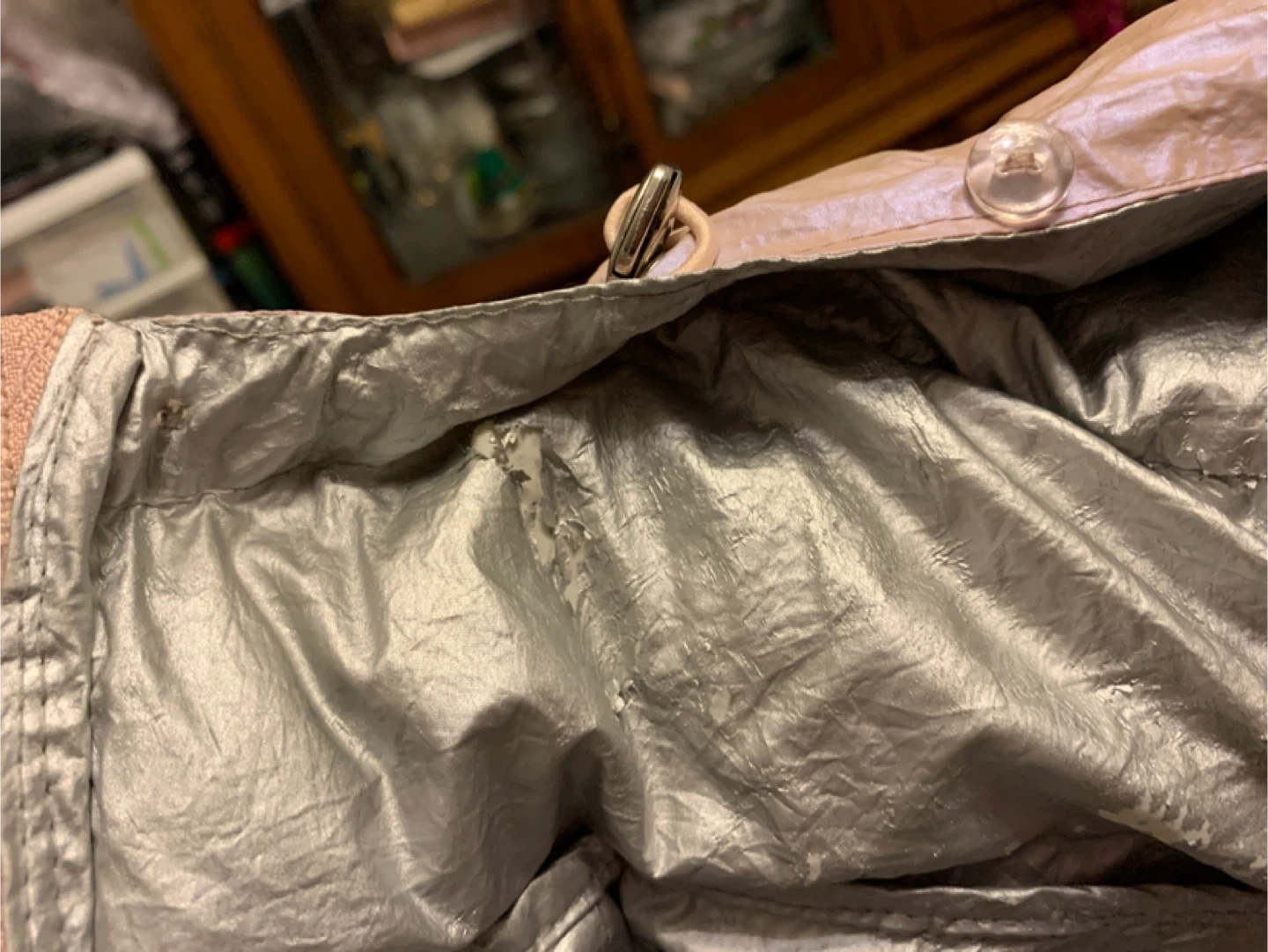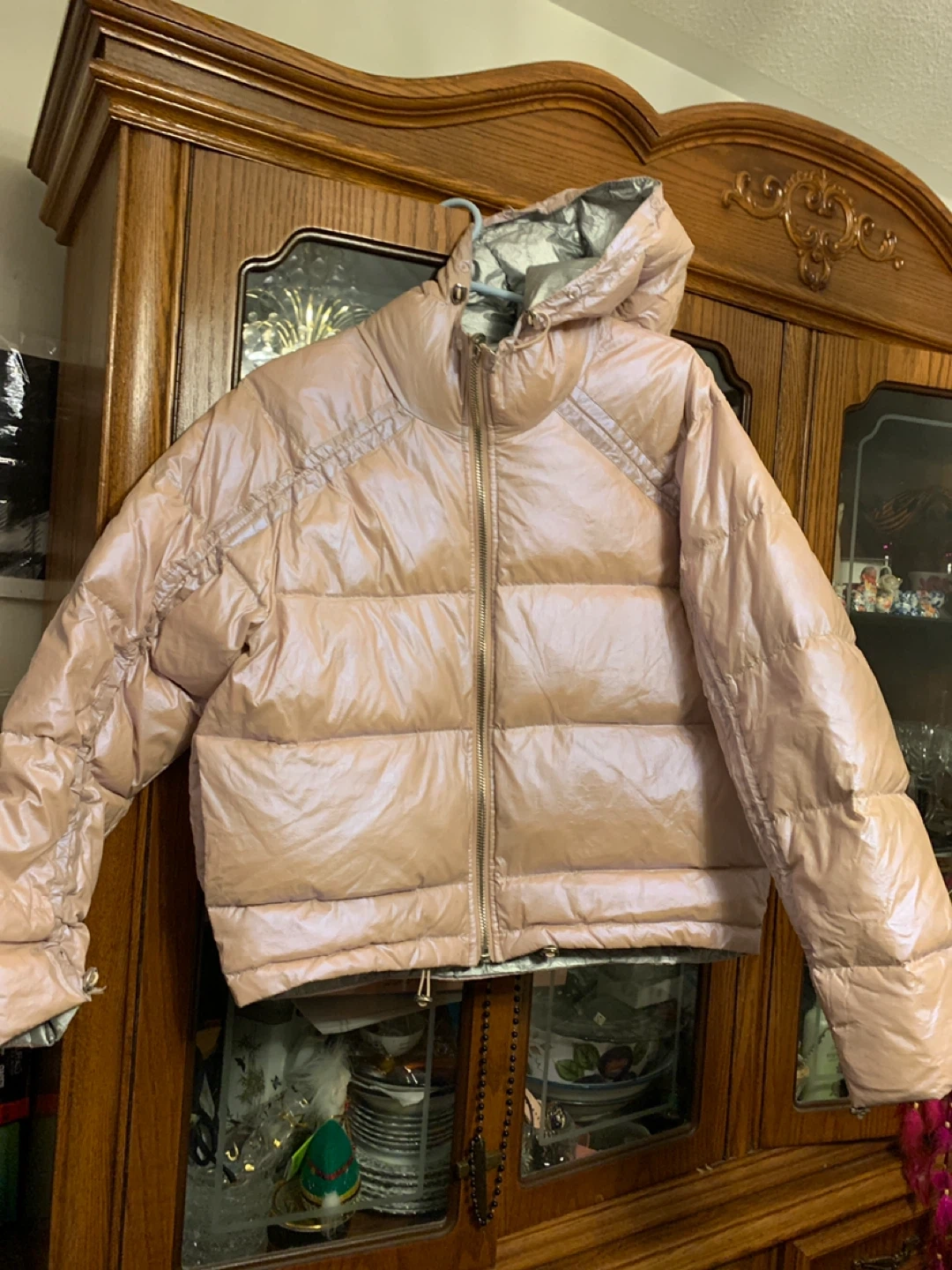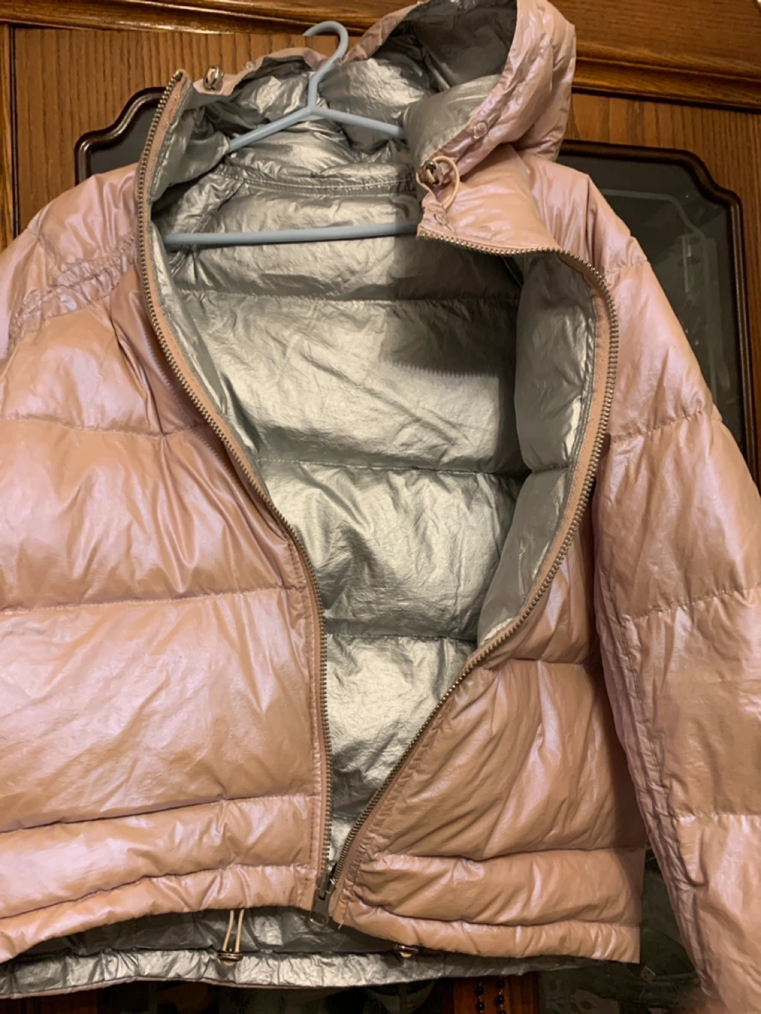 Selling a light pink puffer jacket. It has some signs of wear inside the jacket, as shown in the photos.