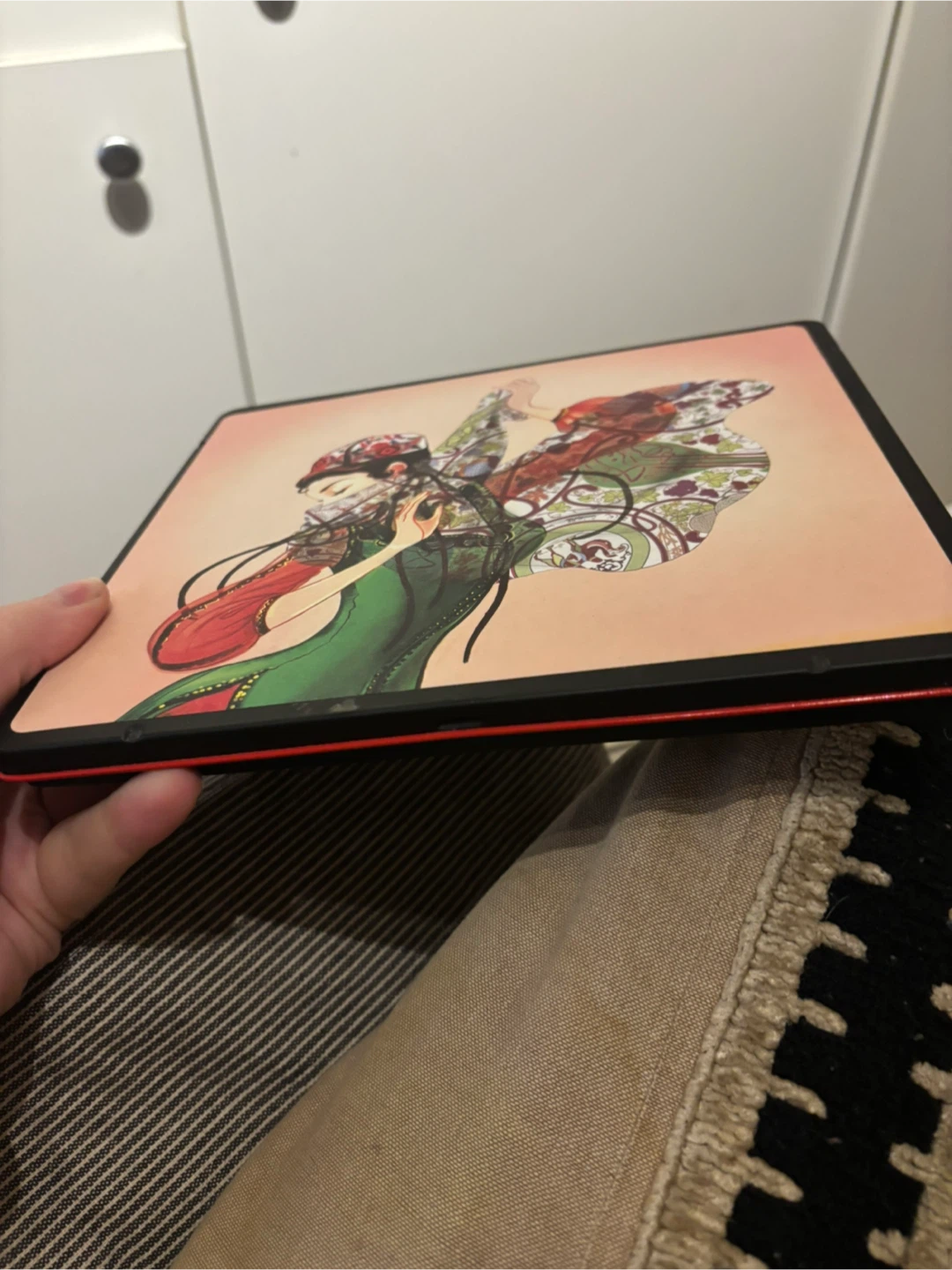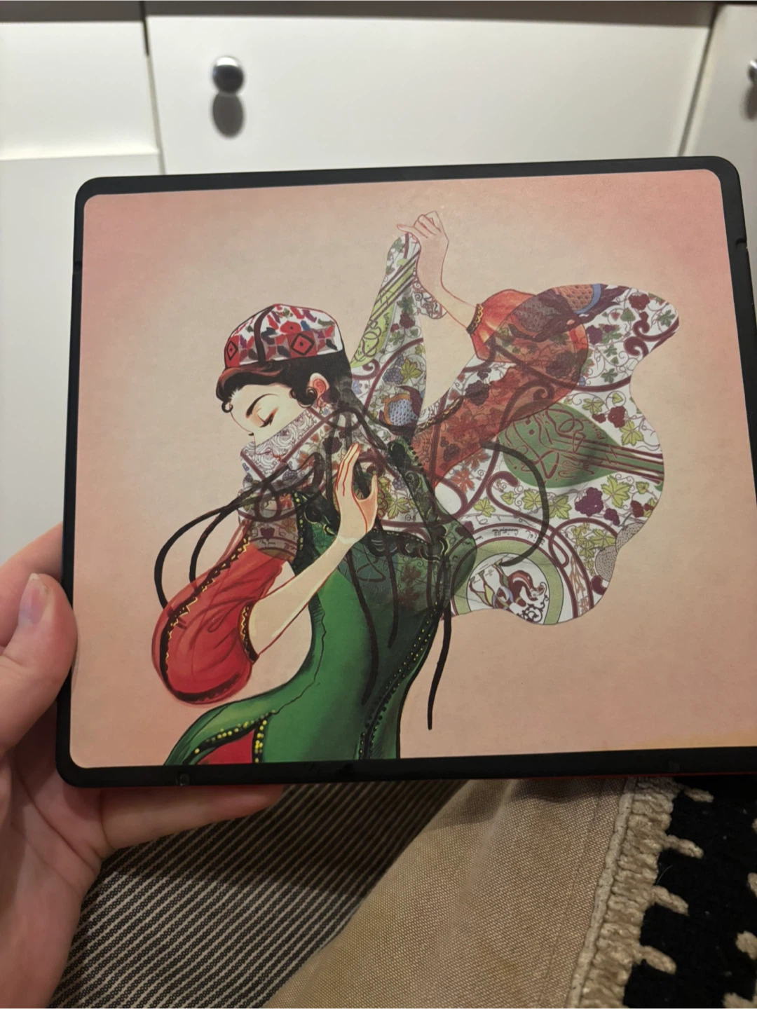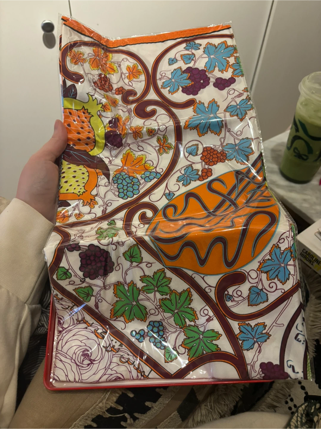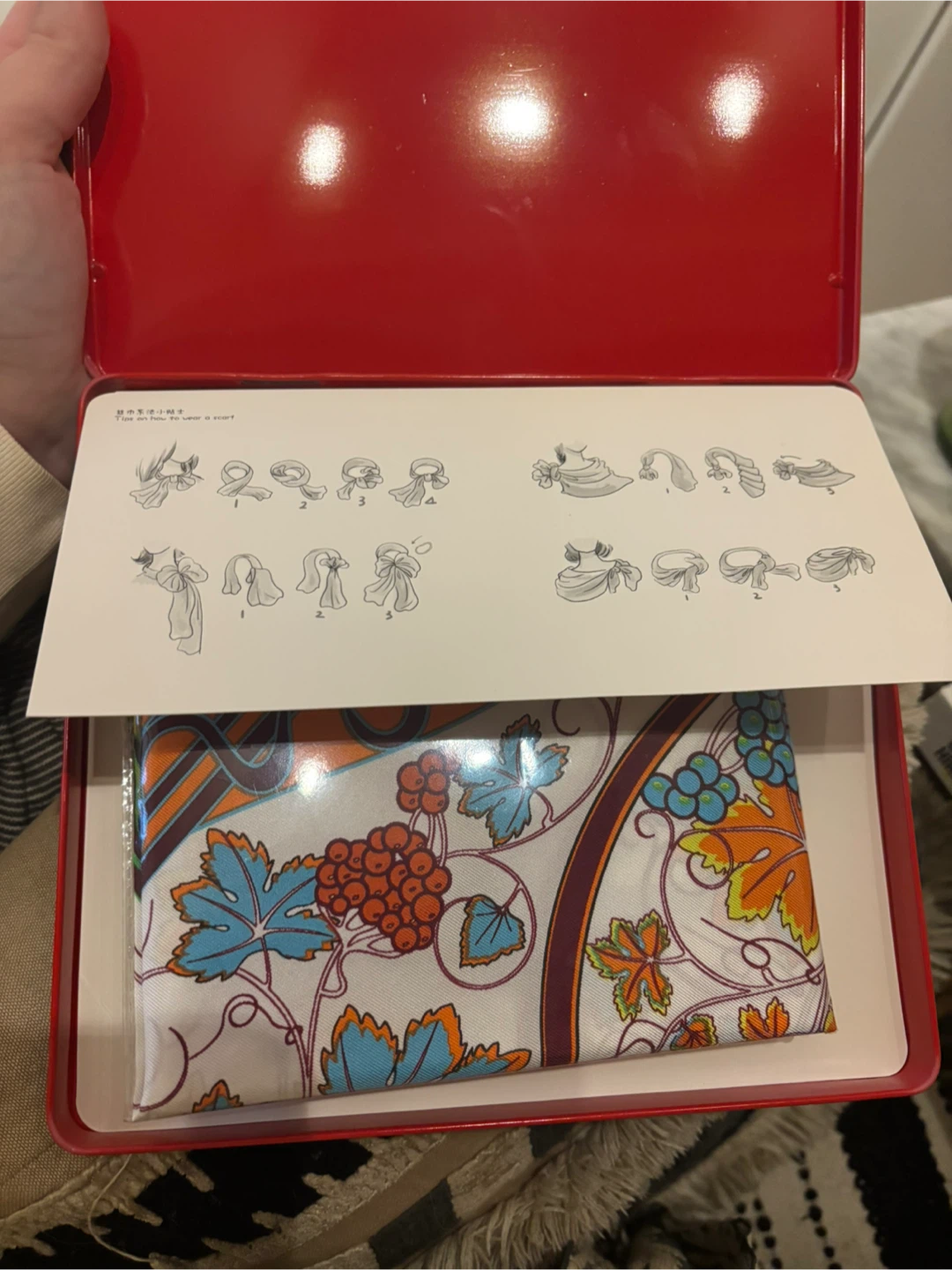 Selling a beautiful silk-like scarf! It comes with its original box and an instruction card showing different ways to tie it. The scarf features a lovely pattern with floral and fruit motifs in vibrant colours. Perfect for adding a touch of elegance to any outfit!