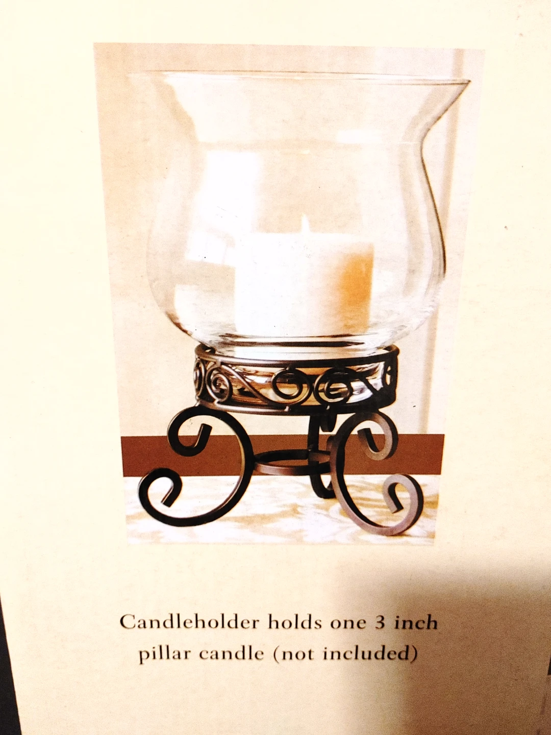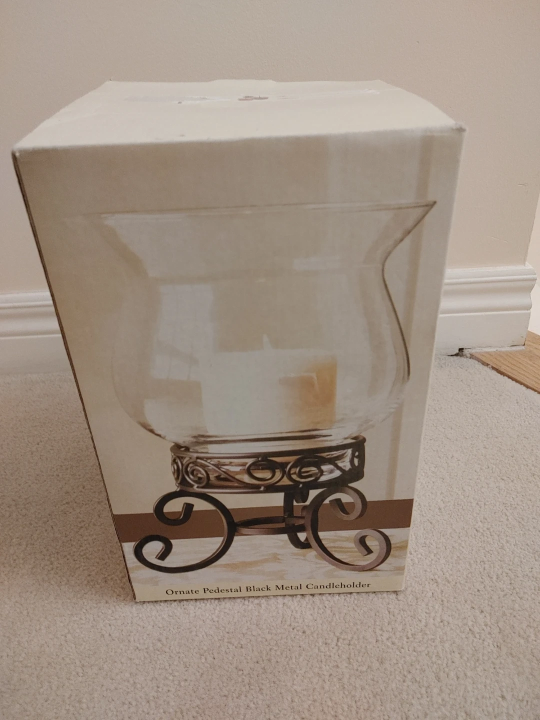 Selling an ornate pedestal black metal candleholder! The box says it holds one 3 inch pillar candle, but please note that the candle is not included. It's in great condition and comes with the original box