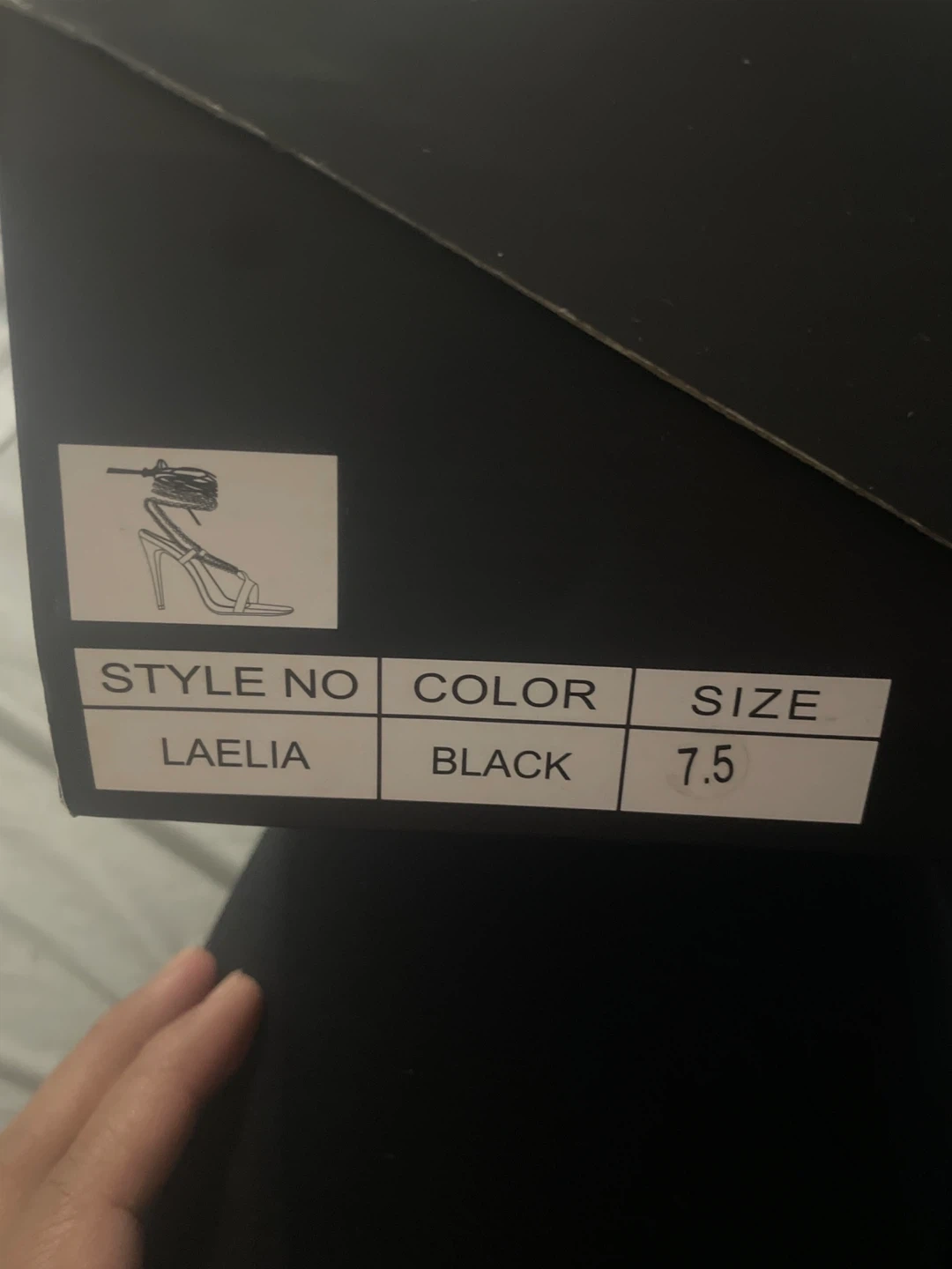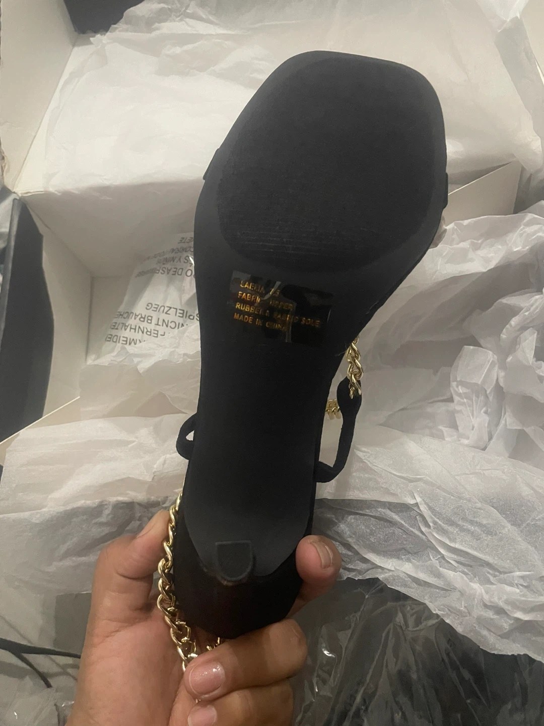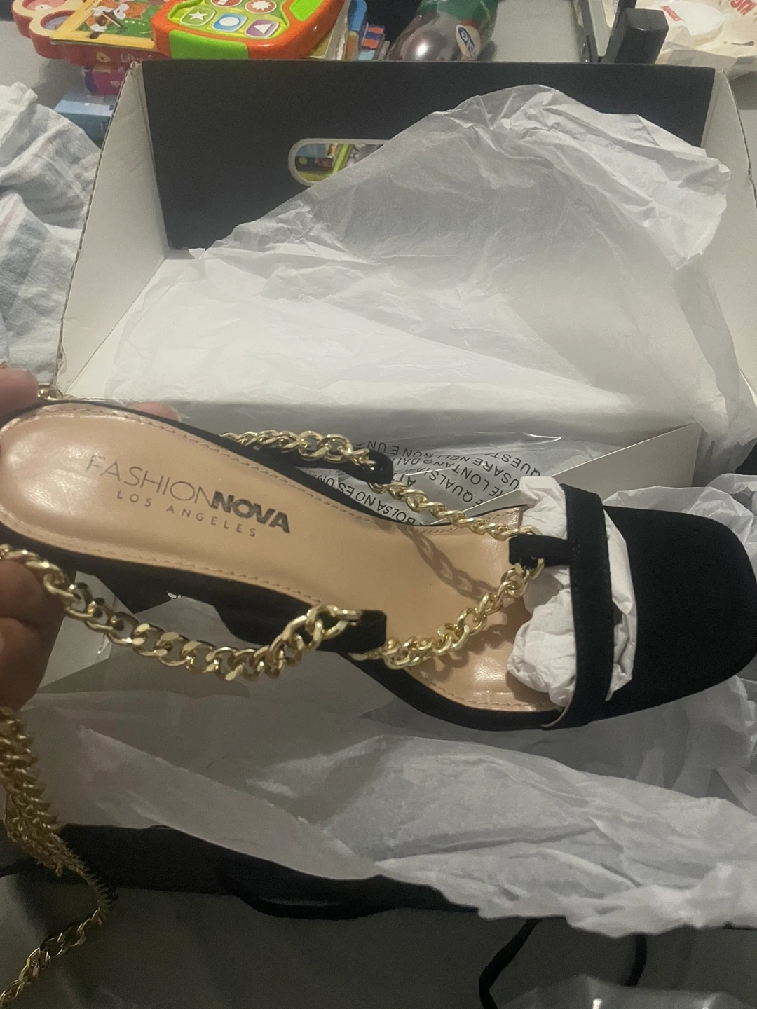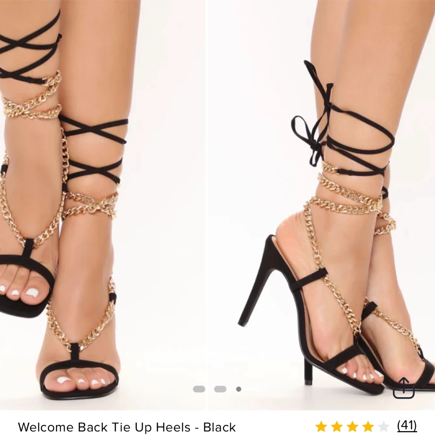 Selling a pair of Fashion Nova tie-up heels in black. They are size 7.5 and in new condition. The heels feature a stylish chain detail. Comes with the original box!
