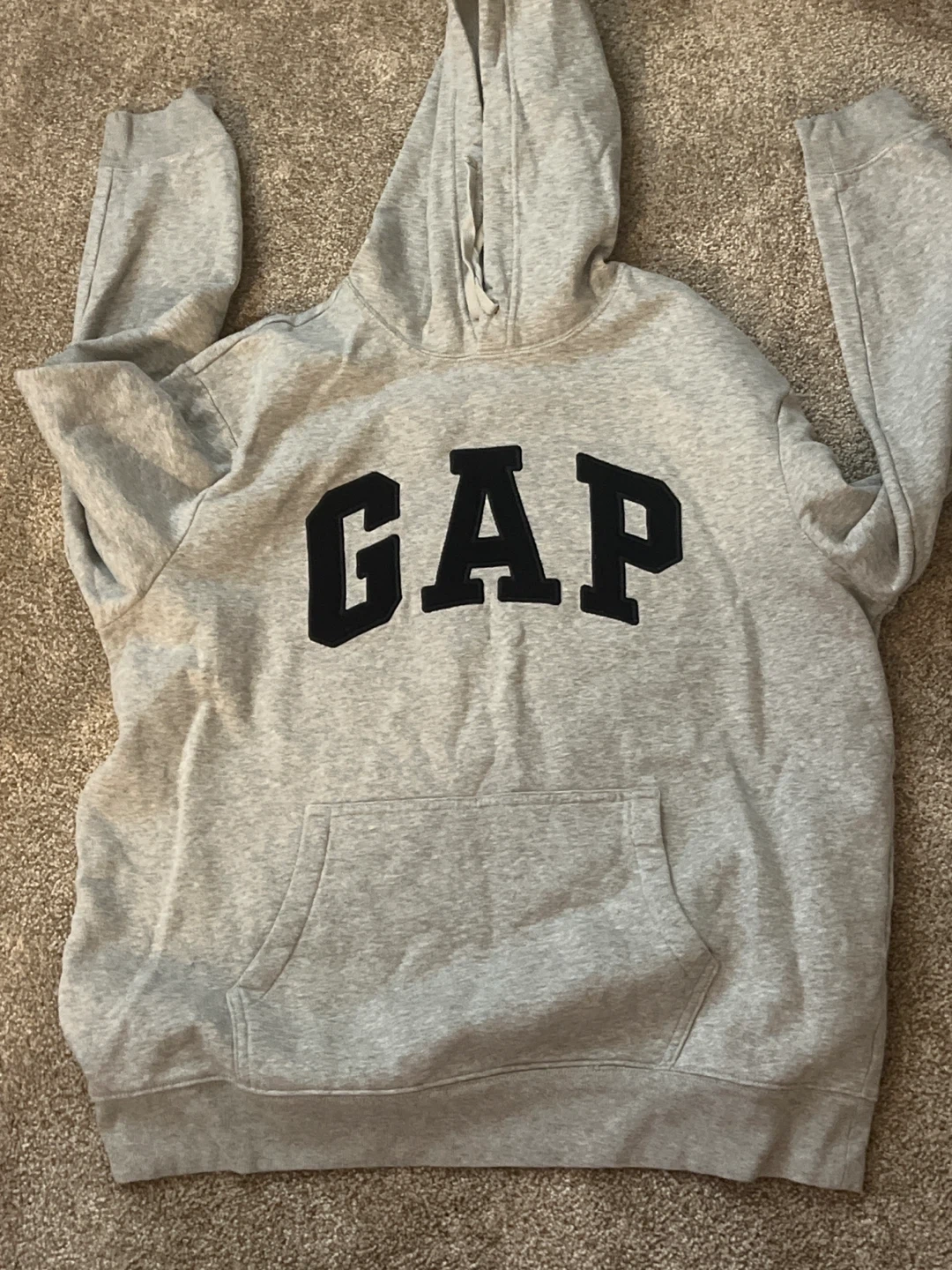 Selling a comfy grey GAP hoodie! It's in great condition and ready for a new owner. Perfect for those cooler days or just lounging around the house. It has the classic GAP logo on the front and a handy pocket.