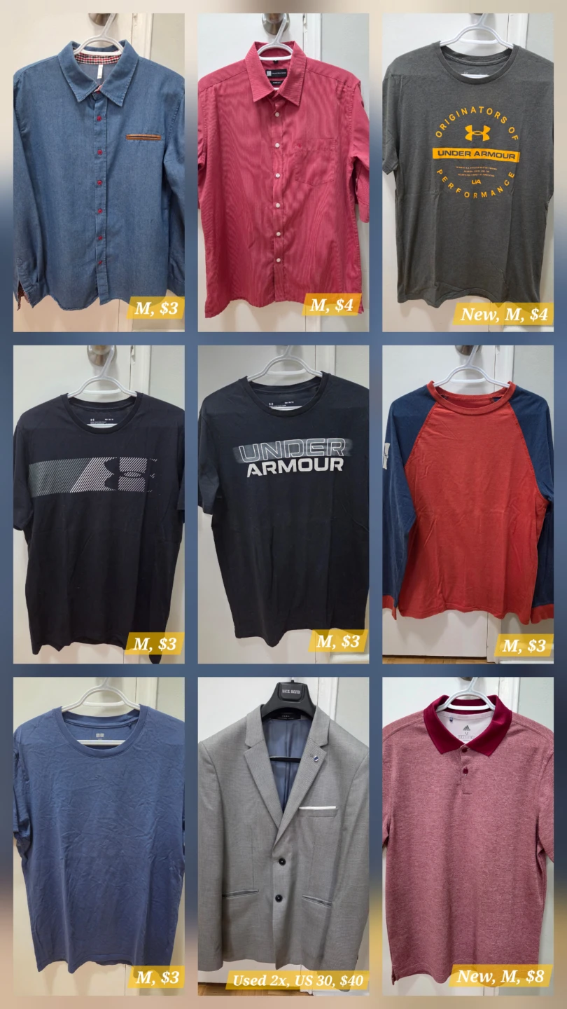 Buy one or more of these men's tops (shirt, polo shirt, long sleeves, etc.), some are branded. I put in the picture if it's brand new, the size (M for Medium, L for Large), and the price. My size is between M or L. The prices are final, even if you're buying more than one. They're the lowest I will give (save $$), or you can buy elsewhere. Everything's in perfect or great condition. If picture is posted, it's available. Just let me know which one(s) you're buying.