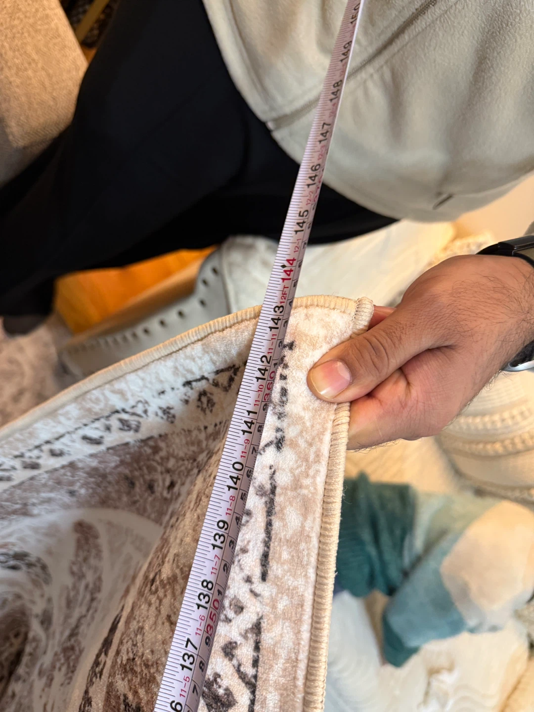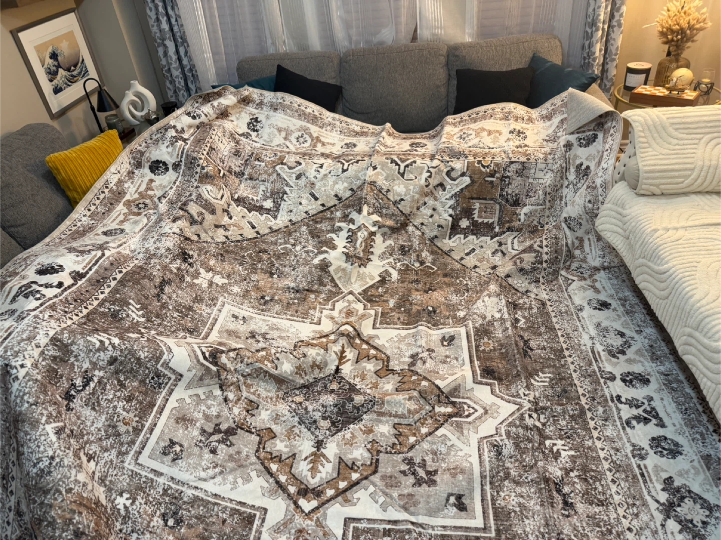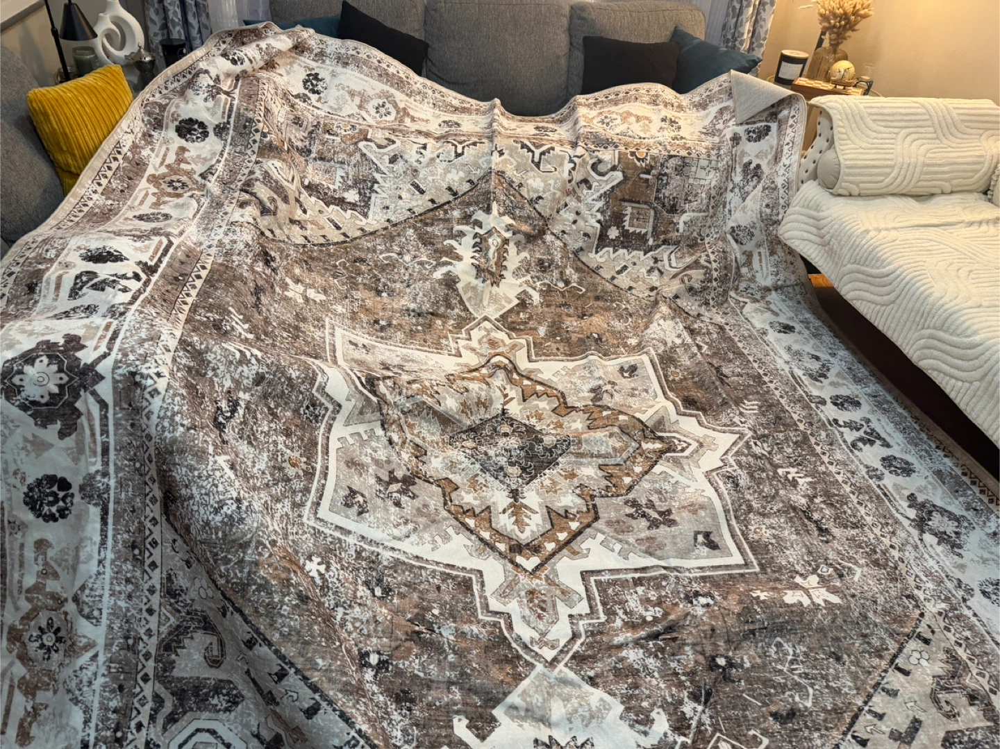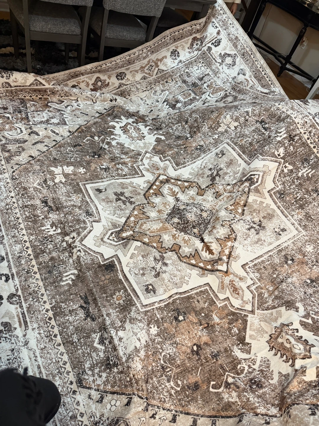 Selling an area rug with a neutral colour palette. It features a detailed, symmetrical pattern in shades of brown, grey, and white.