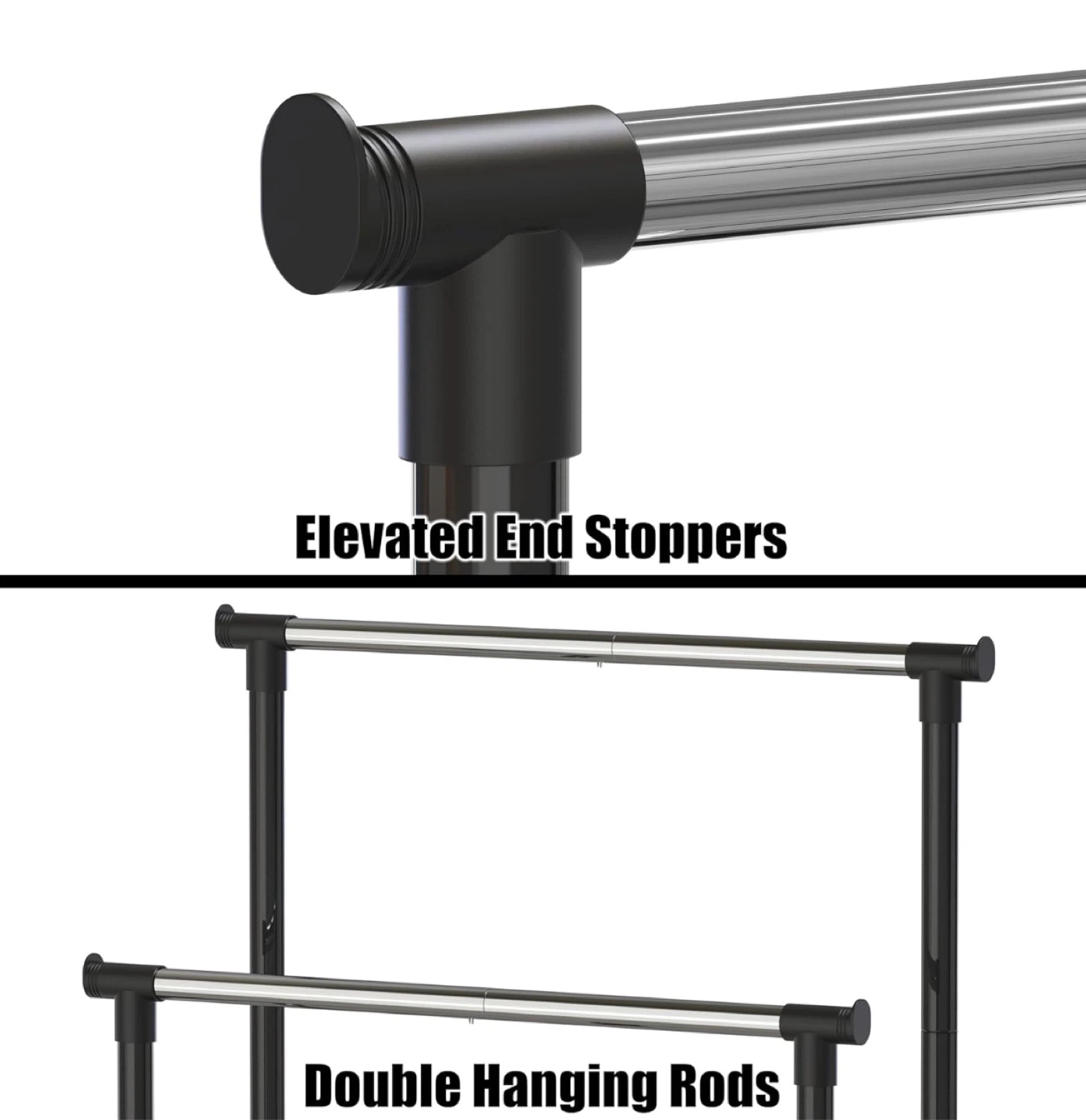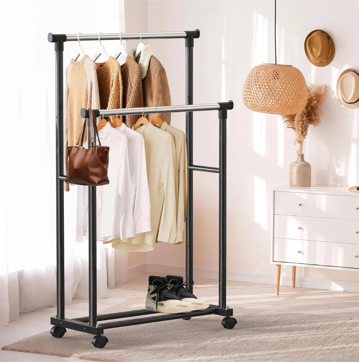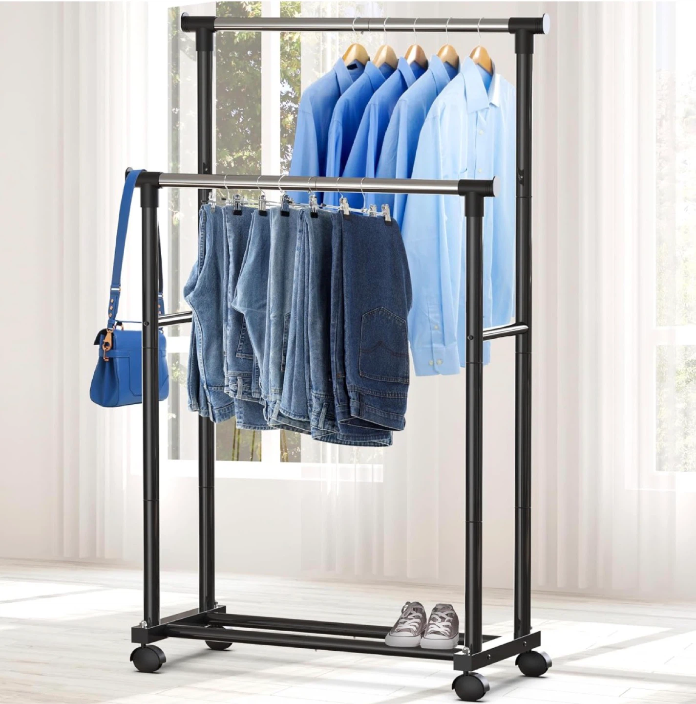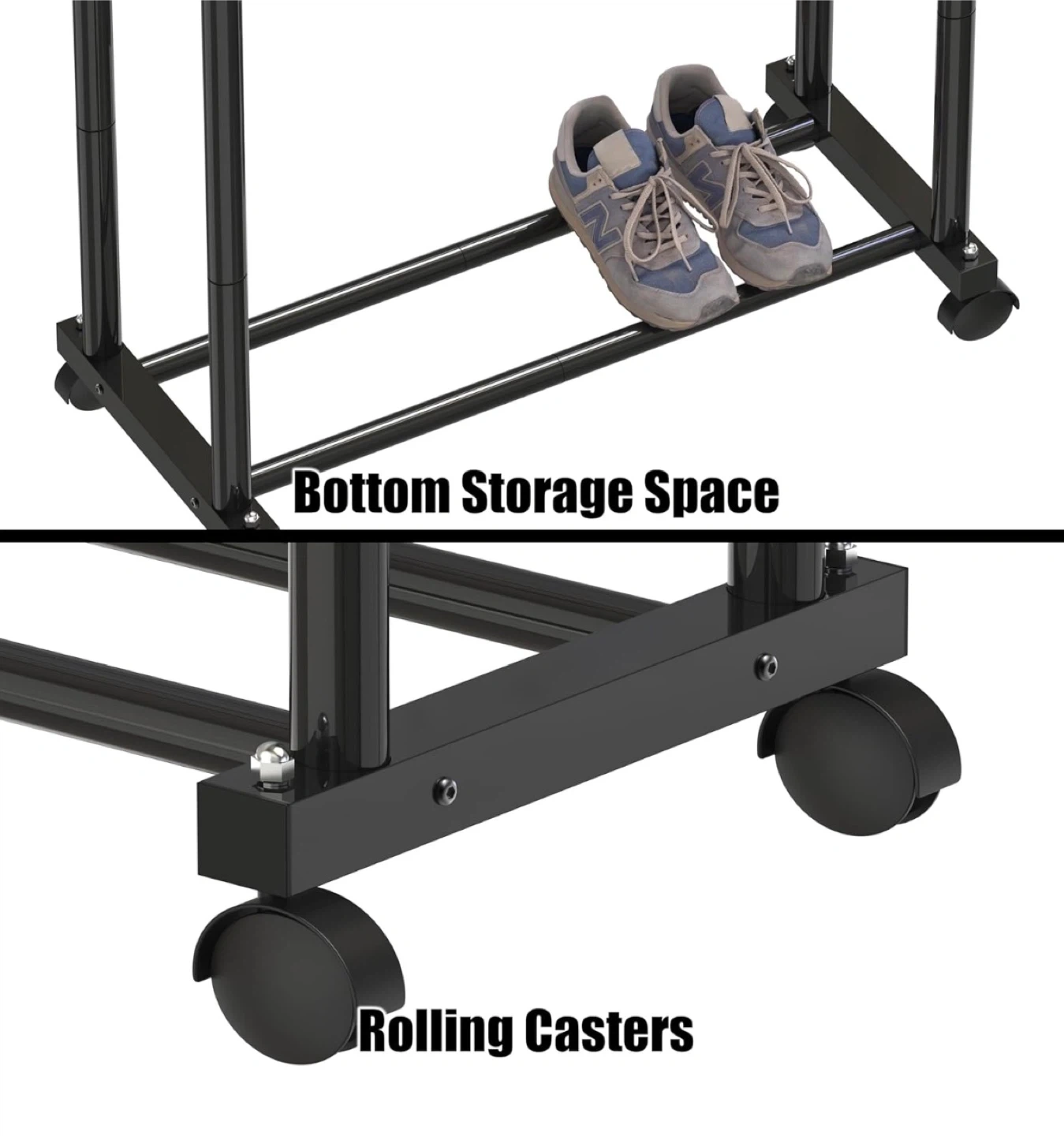 This is a rolling clothes rack with a double rod design. It's black and has wheels for easy moving. There's also a bottom storage space for shoes or other items, and elevated end stoppers to keep your clothes from sliding off