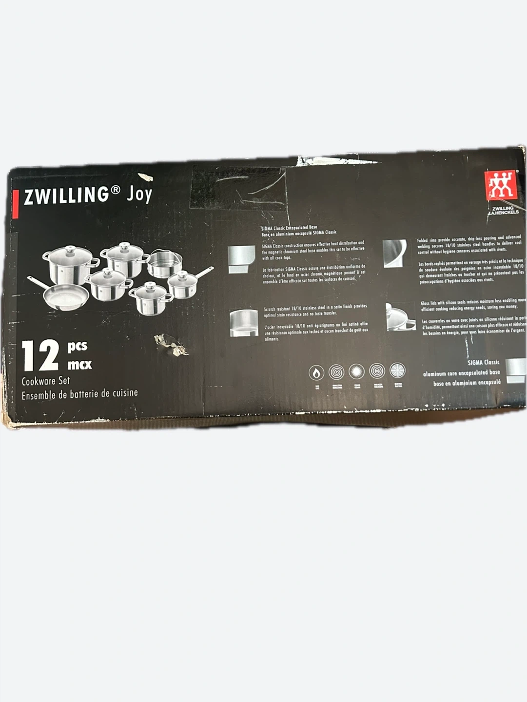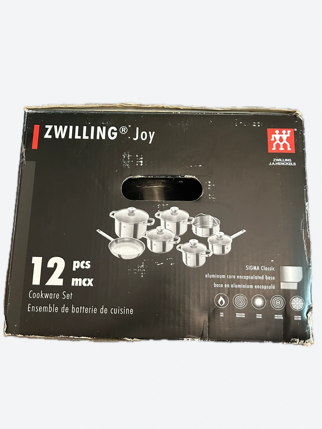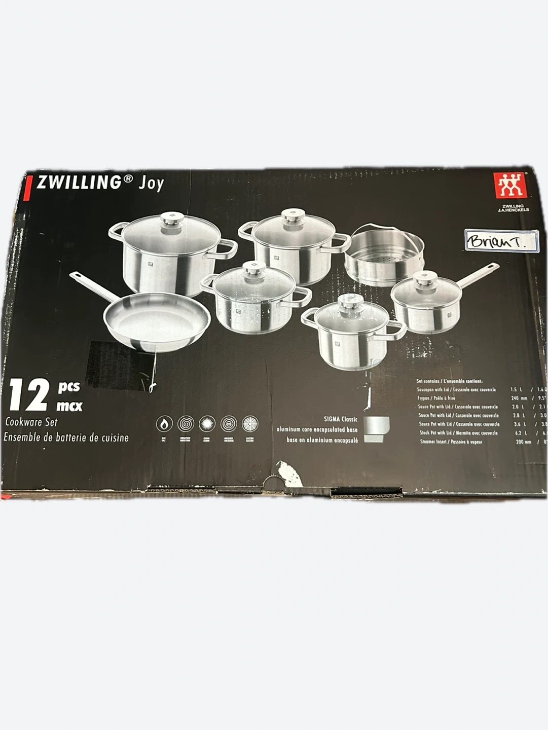 Selling a brand new Zwilling Joy 12-piece cookware set! This set features SIGMA Classic aluminum core encapsulated bases for even heat distribution. It includes various sized saucepans and pots with lids, as well as a frying pan. Perfect for any kitchen!