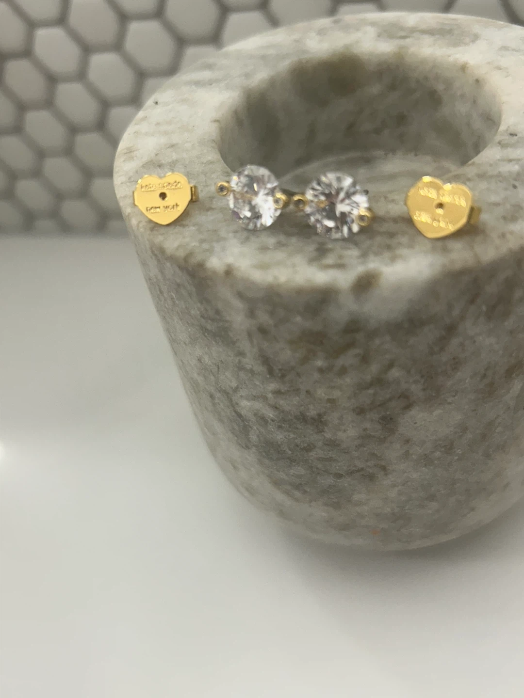 Selling a pair of Kate Spade New York stud earrings. They are gold with princess cut diamond like stones. The backs of the earrings are heart shaped and engraved with the Kate Spade logo. They are new ordered extra pair .so selling the new ones