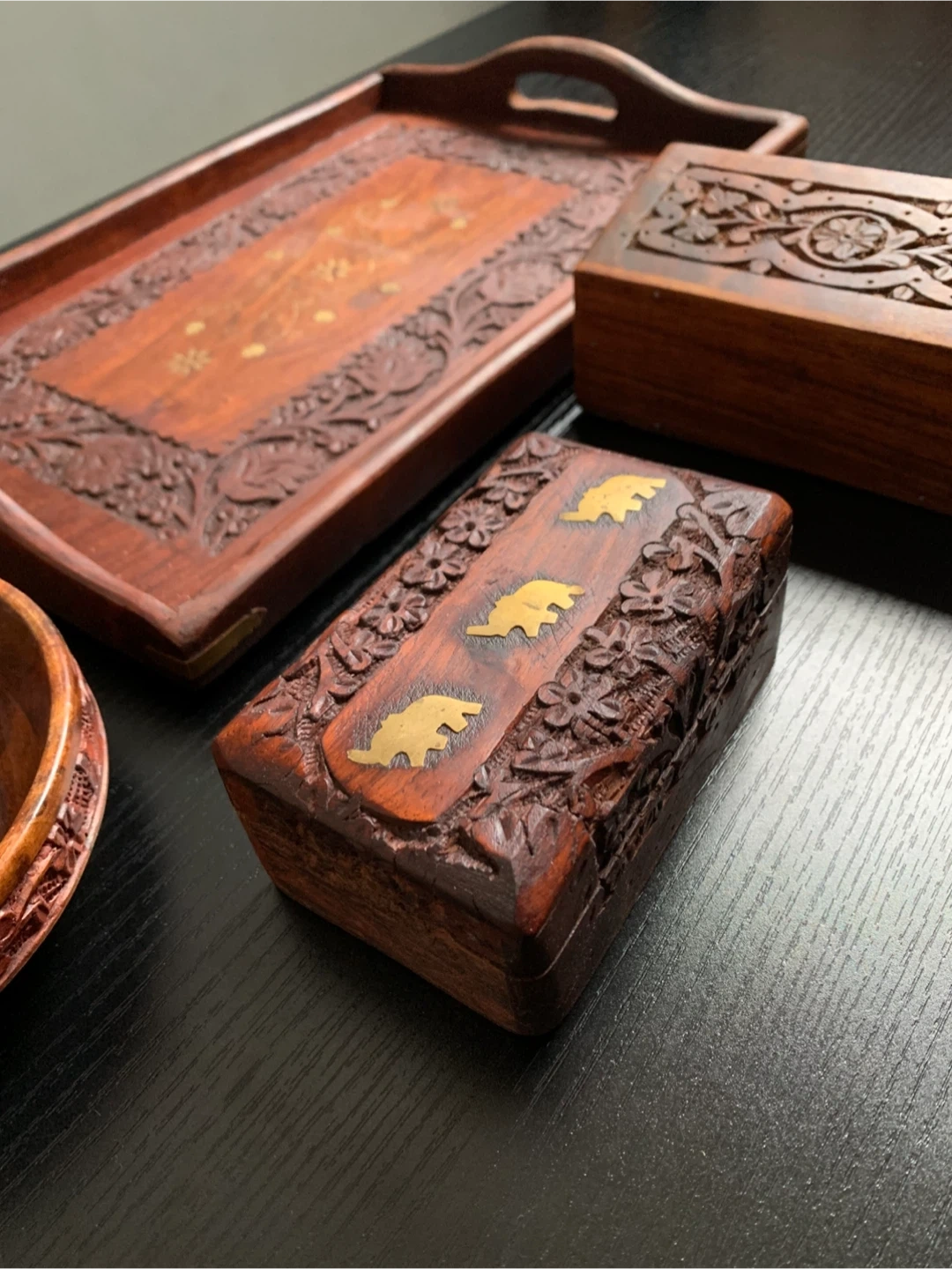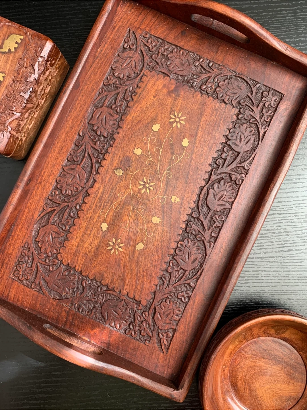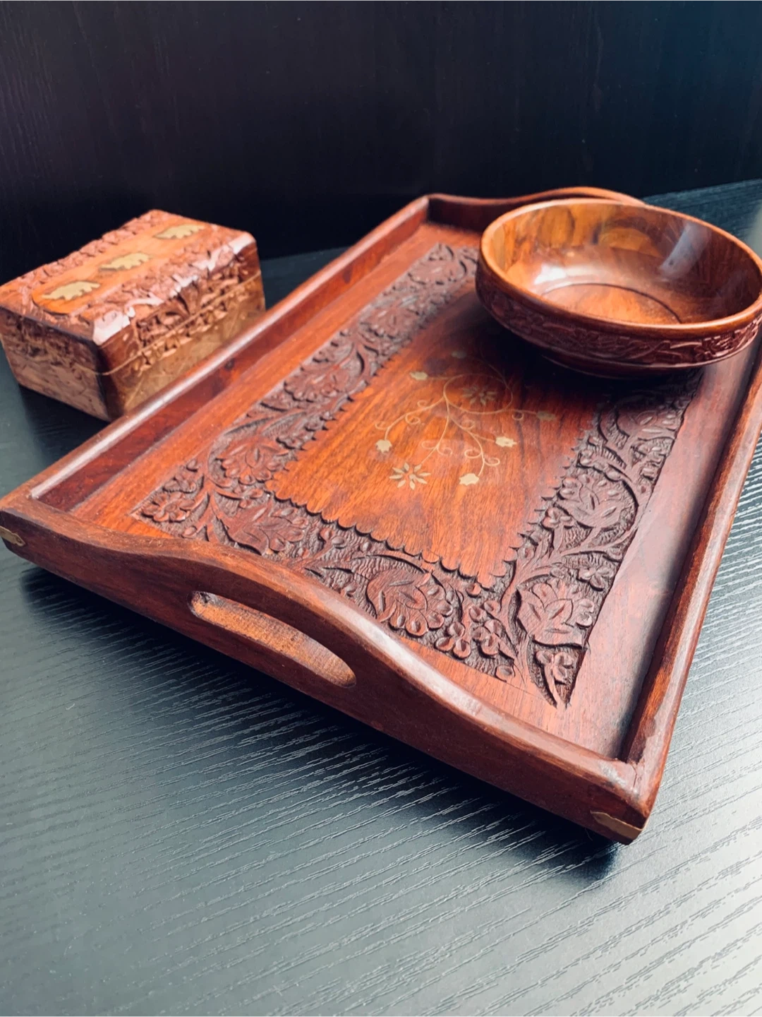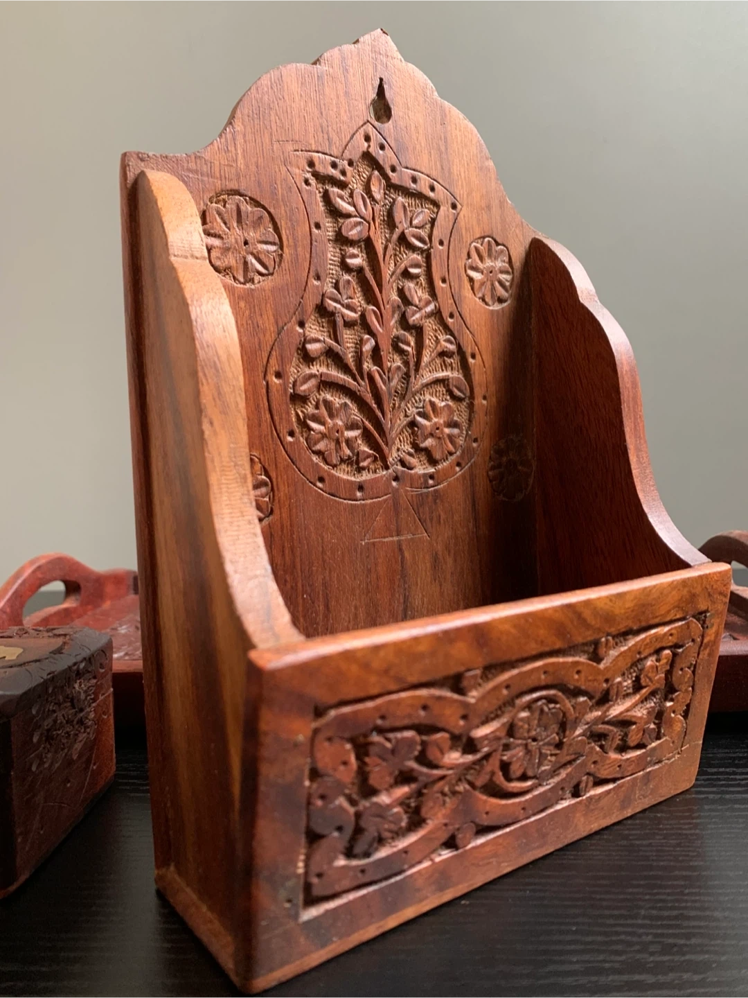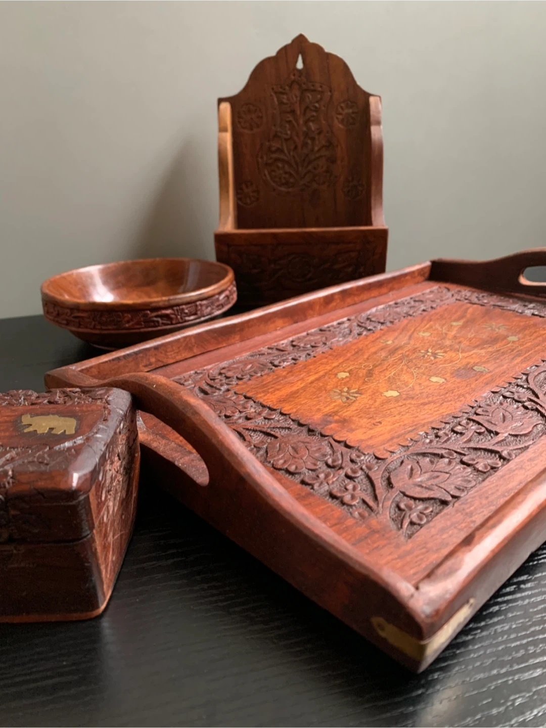 •Beautiful set of wooden tray, box, bowl and mail holder hand carved by skilled artisans.