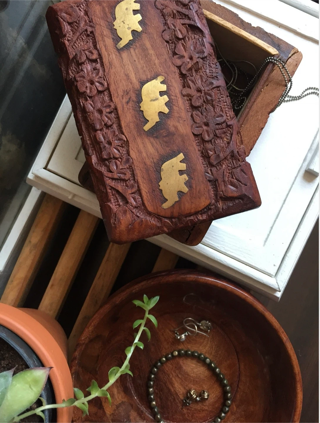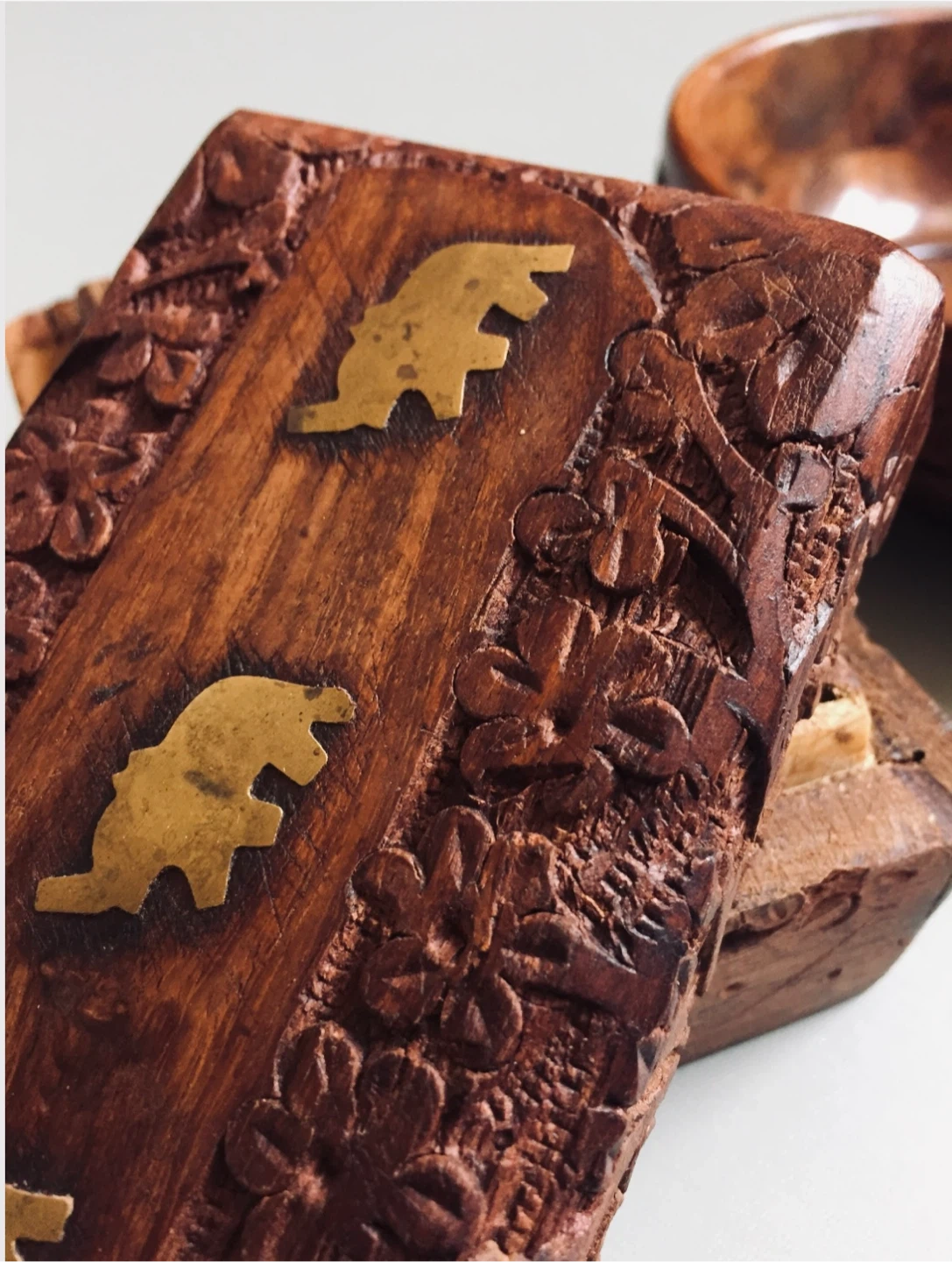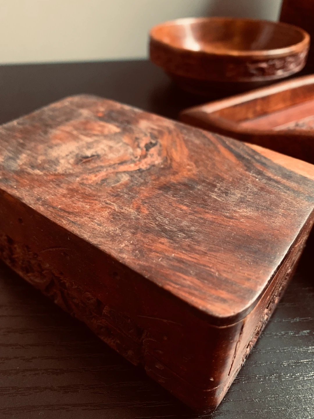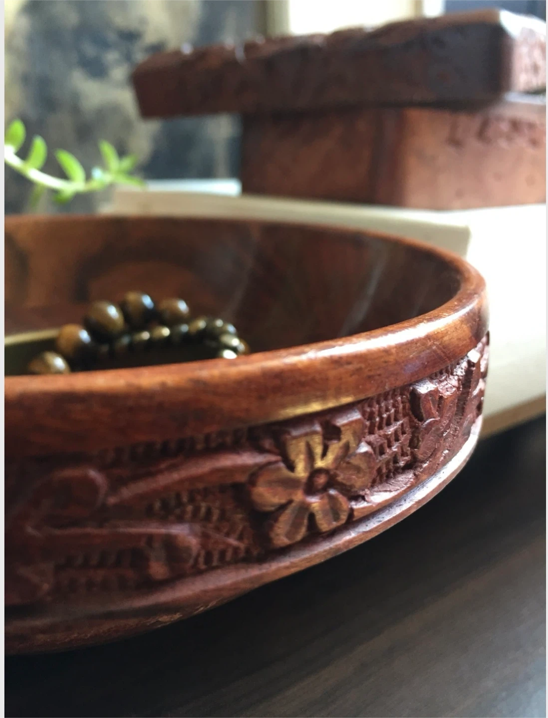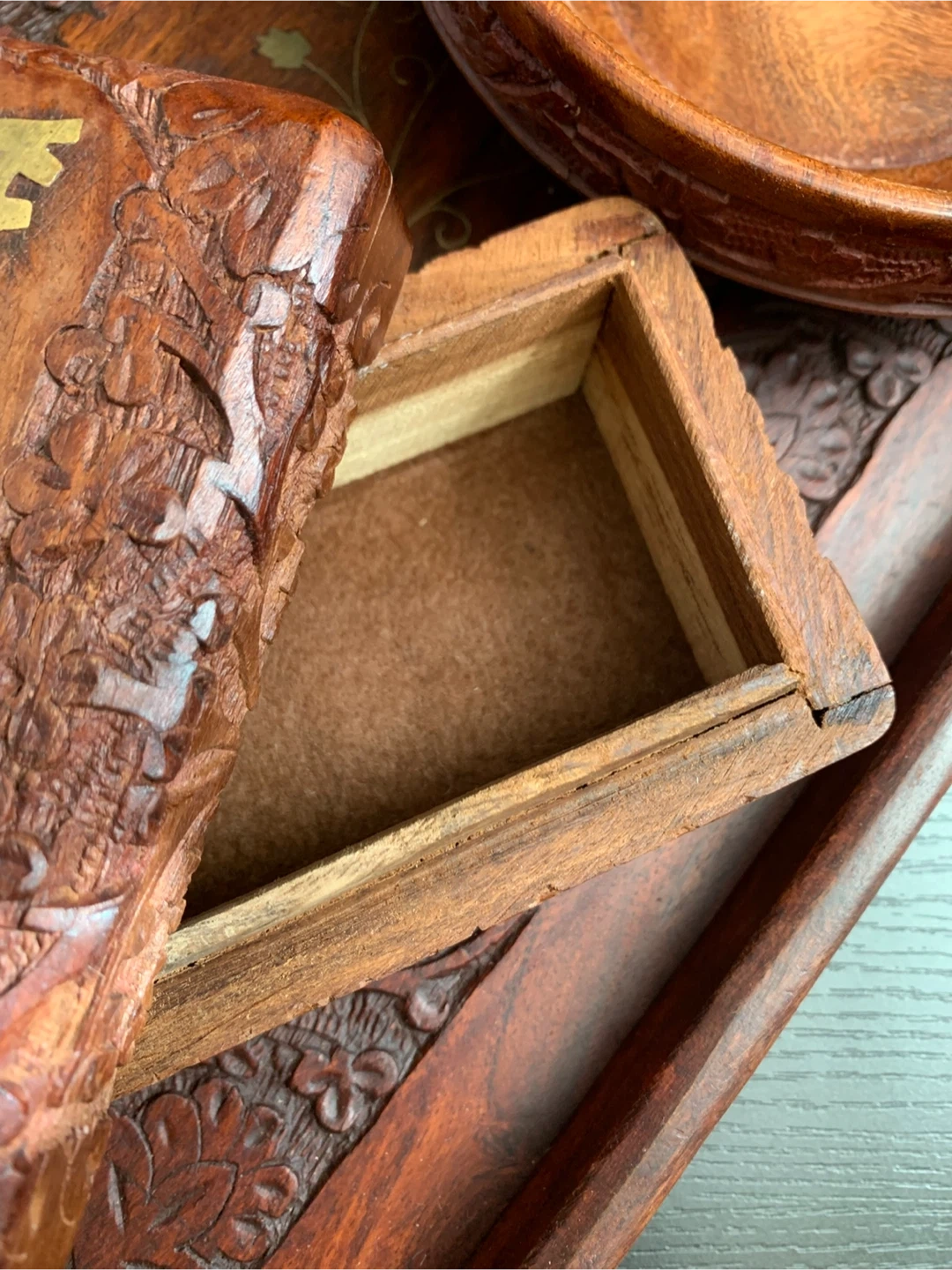 •Beautiful set of wooden tray, box, bowl and mail holder hand carved by skilled artisans.
