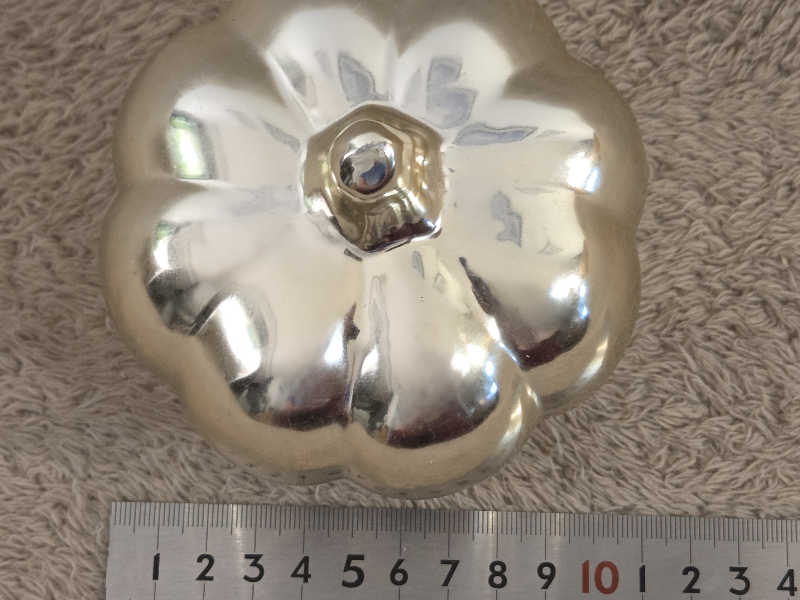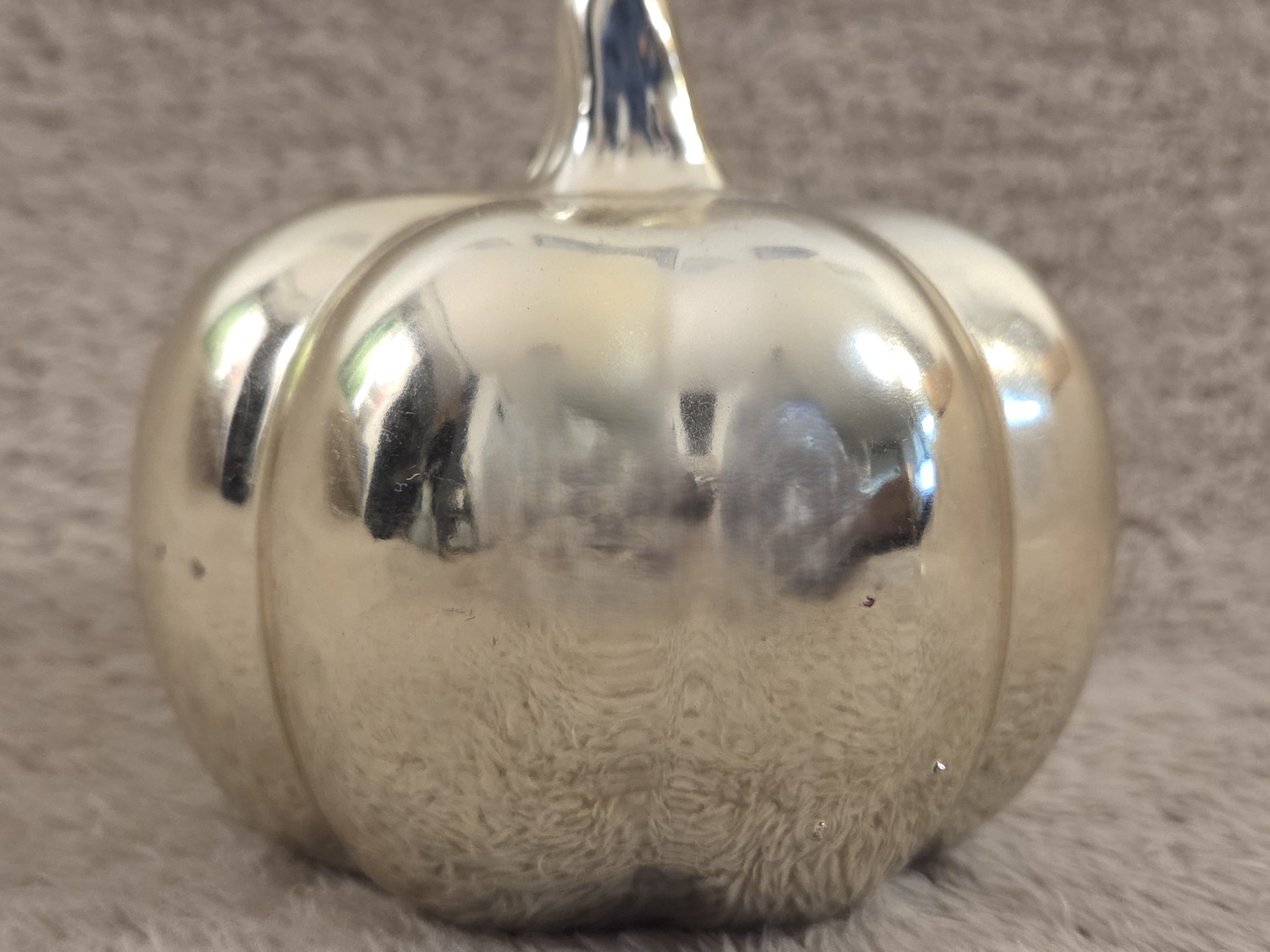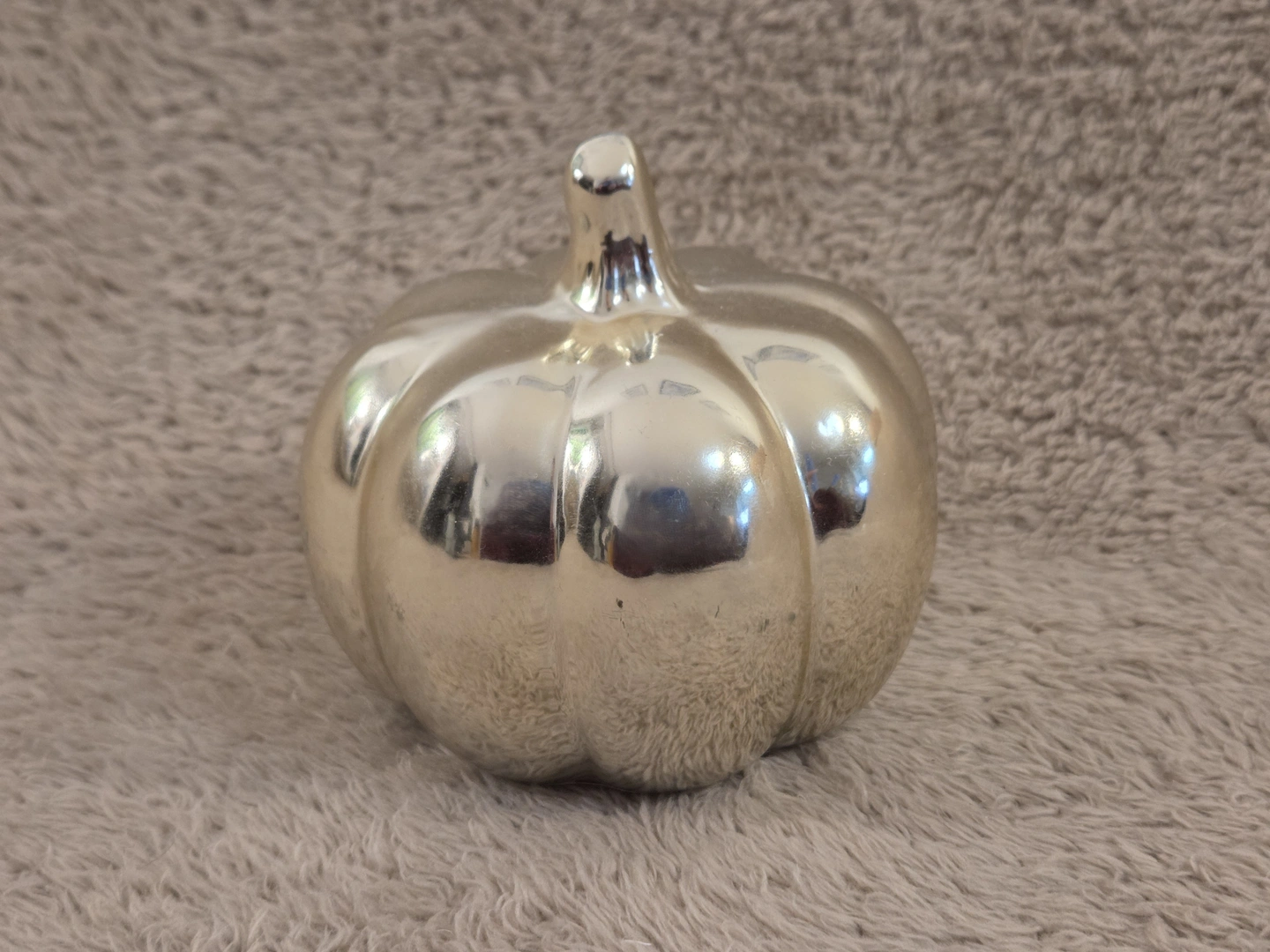 – Key specs: silver-tone pumpkin figurine, likely ceramic/resin with shiny metallic finish, solid and slightly heavy, bottom is flat and stable for standing on a table or shelf